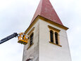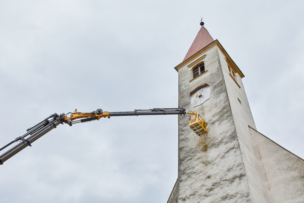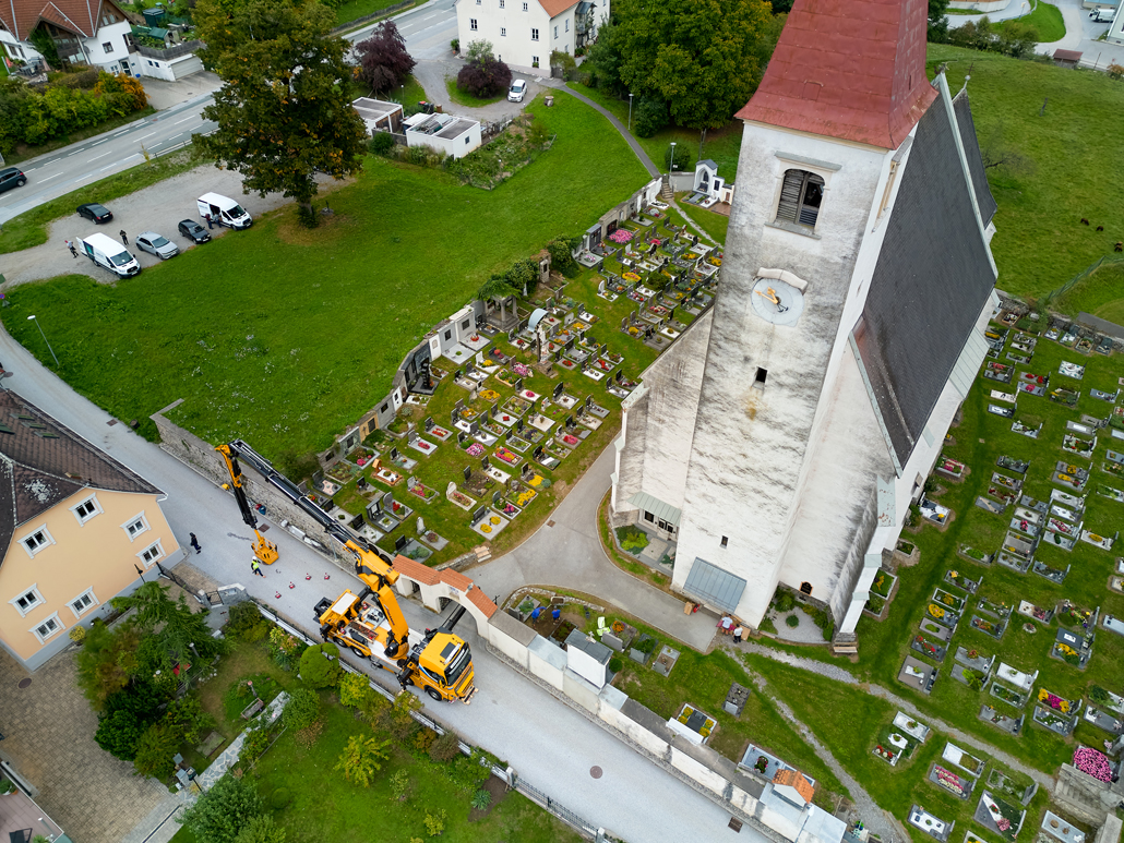 Az új, összkerékhajtású, 225 tonnaméter teherbírású rakodódaruval ellátott vontató kiválóan alkalmas a templomtorony adóberendezésének átalakítására. A korlátozott hely – keskeny bekötőút, temetőfal és a szomszédos ingatlanoktól elvezető kerítések – miatt a daru teljes kiatlaplás nem volt lehetséges. A megoldás: a daru fő talpalóját a temetőfal kapuján keresztül vezették át, így biztosítva a biztonságos talpalást. Miután a rakodódarut gondosan elhelyezték, a munka a tervek szerint megkezdődhetett. Az első lépés a templomtorony alapos megtisztítása volt.