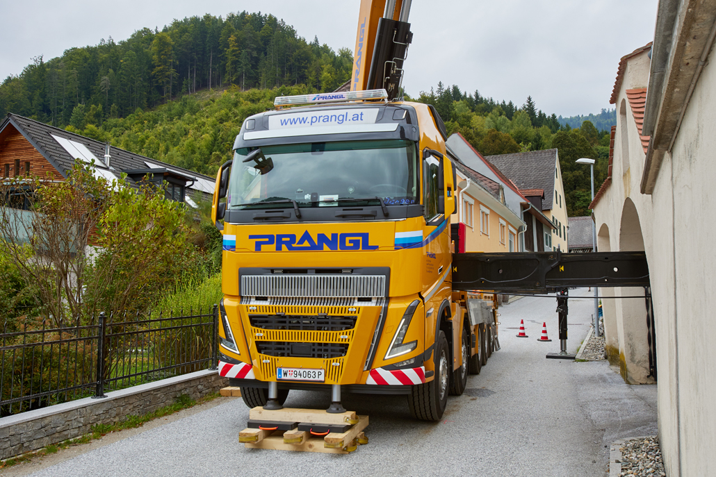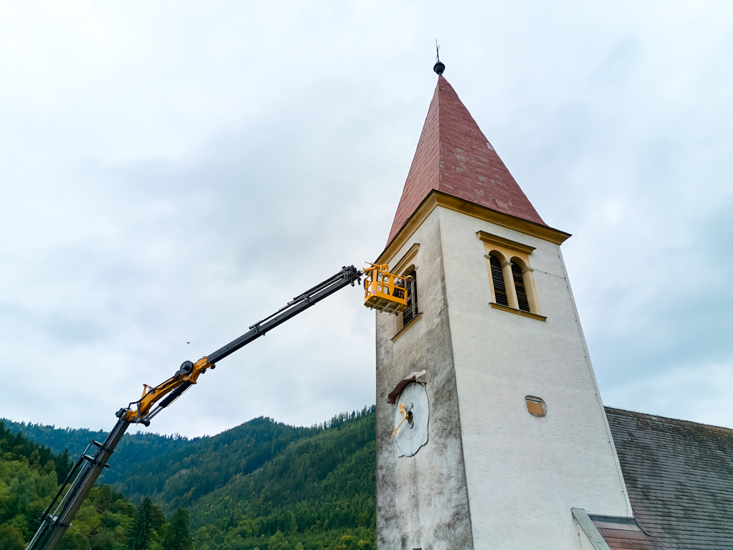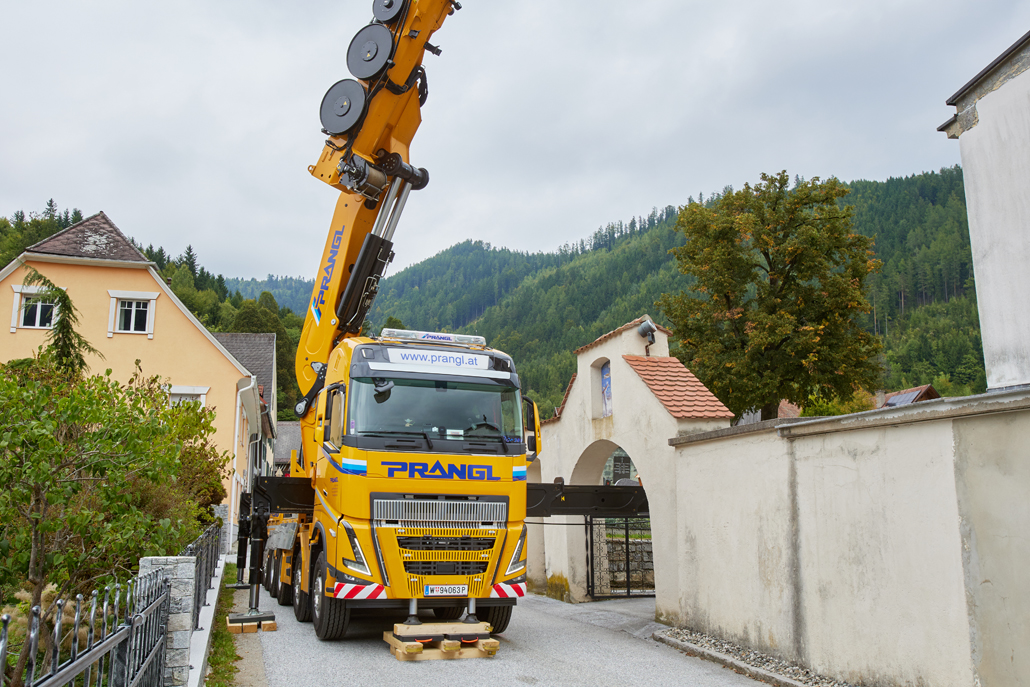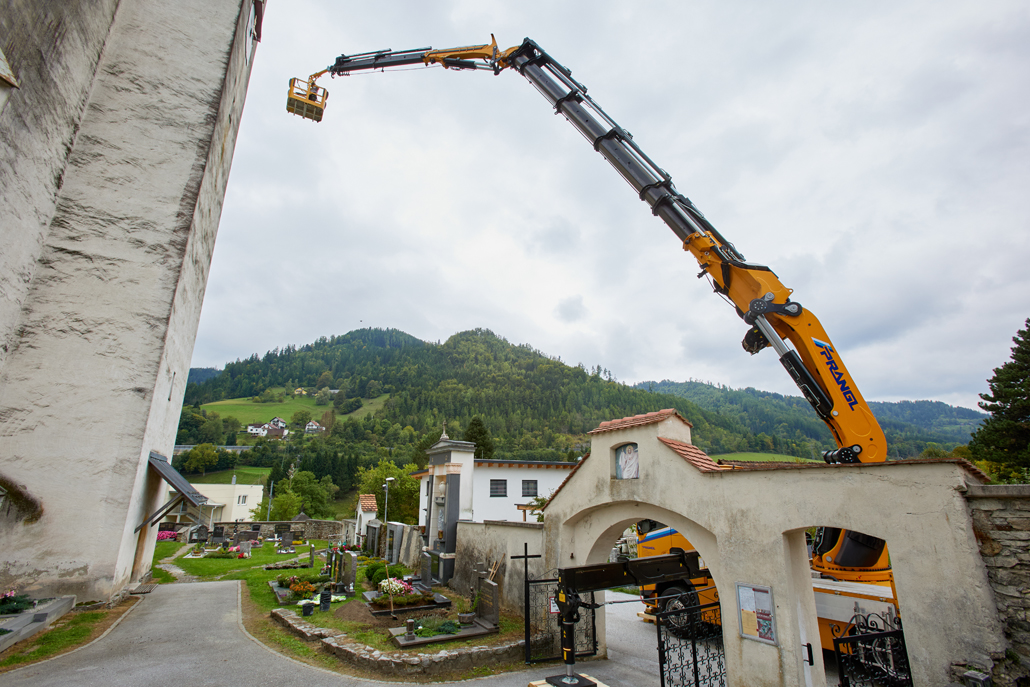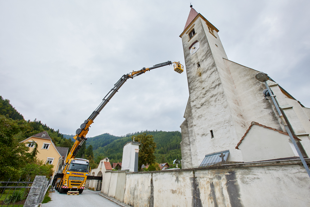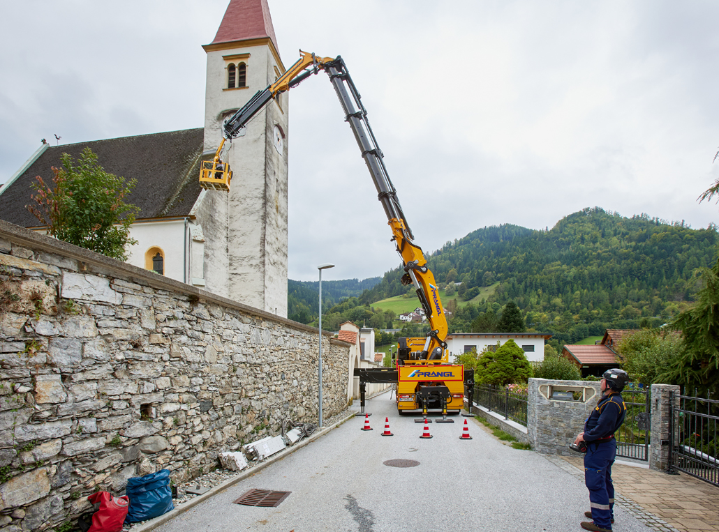 Az ausztriai übelbachi plébániatemplom egy késő gótikus falpilléres templom, melynek két hosszú oldalát a temető határolja, és a bejutás csak a keskeny templomutcán keresztül lehetséges. Ez a helyzet különös kihívást jelentett a Prangl csapat számára. Egyrészt a használandó eszközt biztonságosan kellett elhelyezni az utcán, másrészt a szükséges hatótávolságot kellett elérnie, miközben a szükséges terhelést is kezelni tudta. A Prangl flottájában található új gép lehetővé tette, hogy e feladat minden kihívásának egyszerűen és hatékonyan megfeleljen.