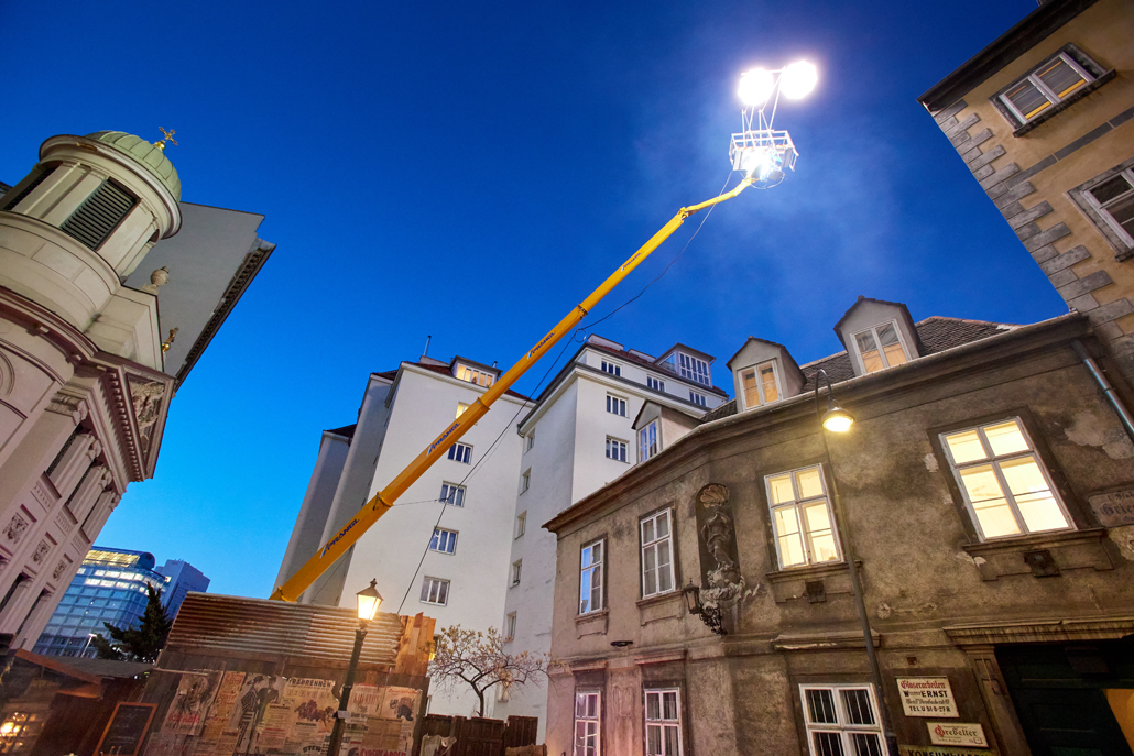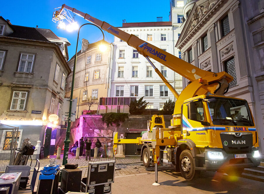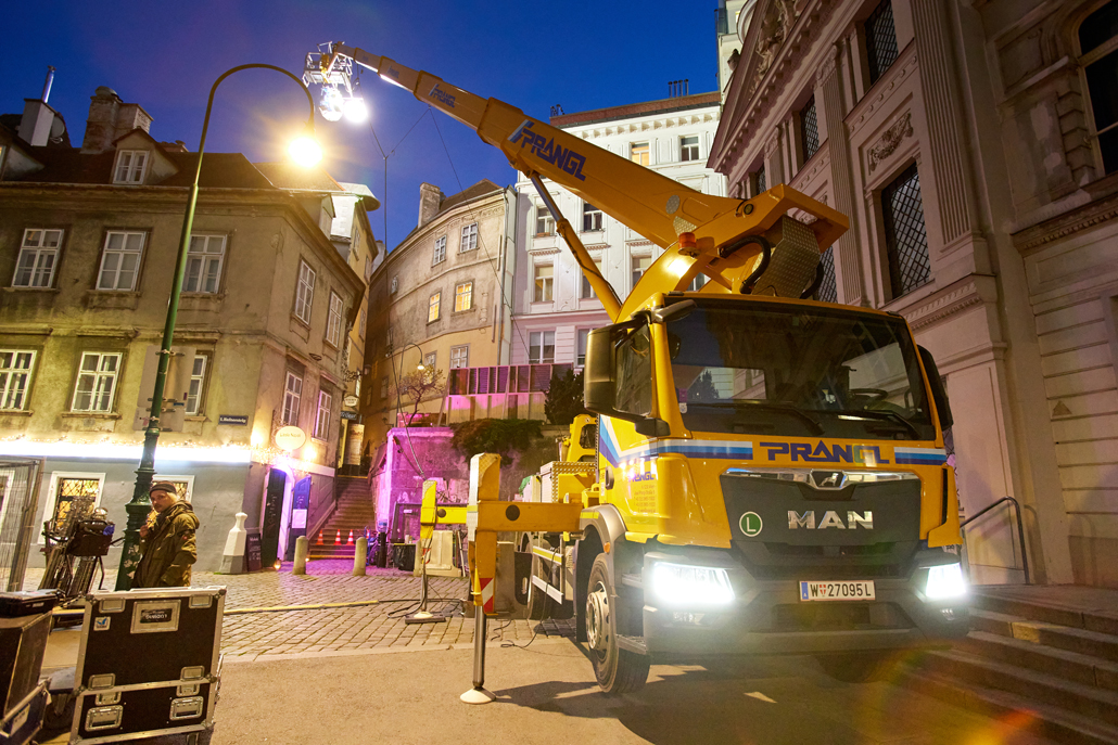 „A felkészülés minden!” – ez volt a mottó, amikor az új forgókaros emelőt a forgatás megkezdése előtt bemutatták, és gyorsan felvették az eszköz listára. A megrendelés teherautóra szerelt személyemelőket tartalmazott kezelővel, két utánfutóra szerelt munkaállványt, különböző munkamagasságú ollós emelőket, egy csuklós emelőt és egy teleszkópos targoncát az új forgatható villával. A Prangl gépei összesen 15 forgatási helyszínen vettek részt Bécs környékén. Minden helyszínhez – például a bécsi belvárosban, a Griechengasse-n forgatott jelenethez – külön-külön választottak ki megfelelő eszközt.