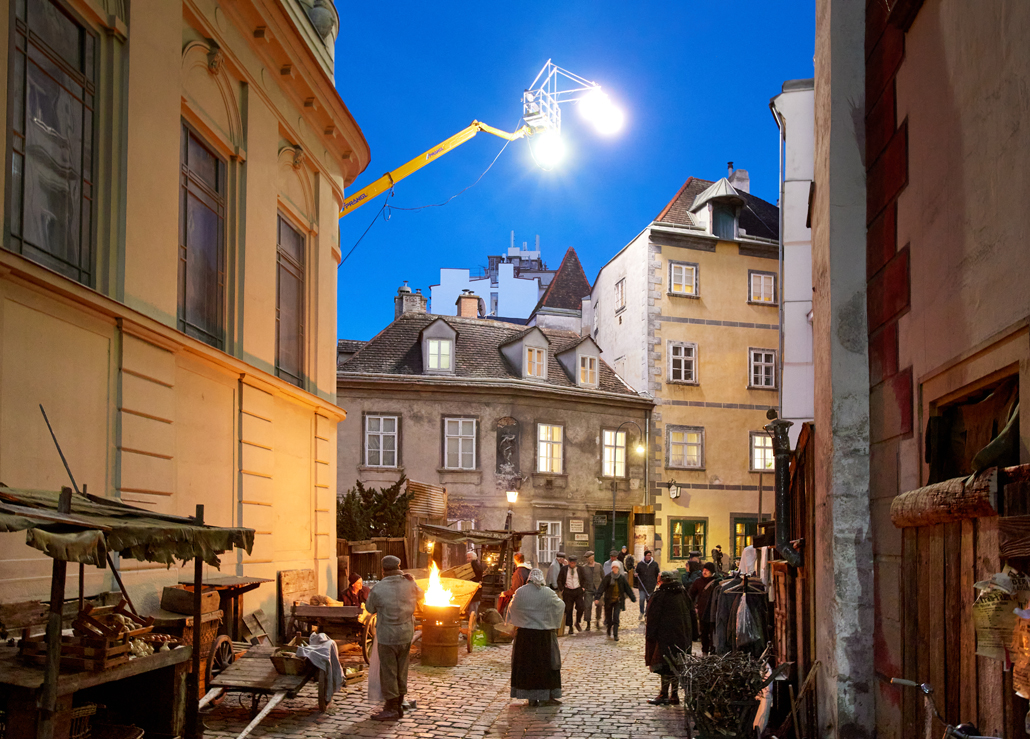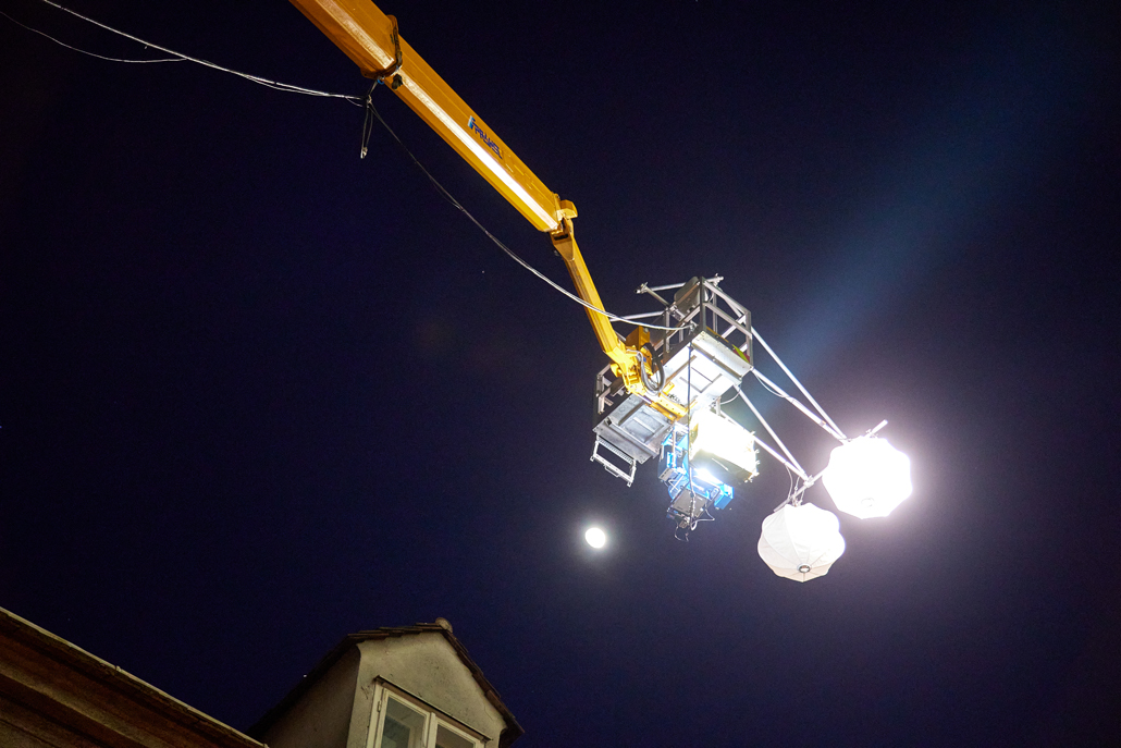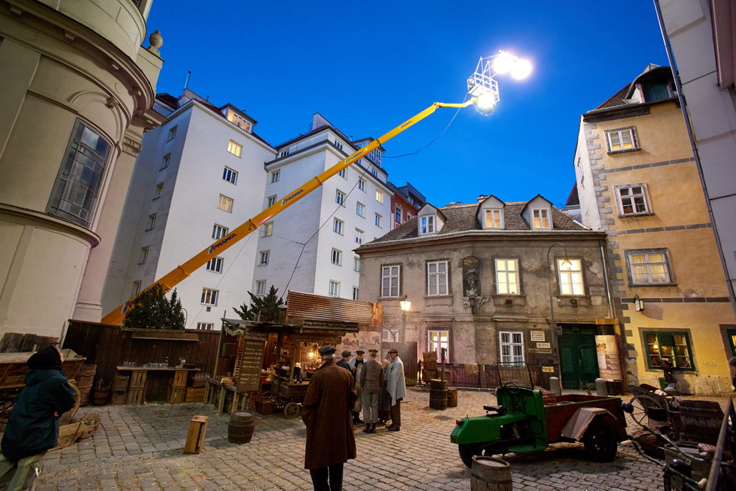 A keskeny utcában, amely mindenféle kellékkel volt tele, egy teherautóra szerelt, 37 méteres munkamagasságú és 30 méteres vízszintes kinyúlású személyemelőt helyeztek el, hogy egy reflektor segítségével holdfényes éjszakai hangulatot teremtsenek. A kosarat úgy állítoták be, hogy az általa tartott világítás optimális hatást érjen el. Ez lehetővé tette, hogy a kész filmben egy olyan jelenetet mutassanak be, amely minden nézőt visszarepít az időben. Az életrajzi film, amely Kreisky 1927 és 1938 közötti élményeit írja le, 2025 őszén kerül a mozikba.