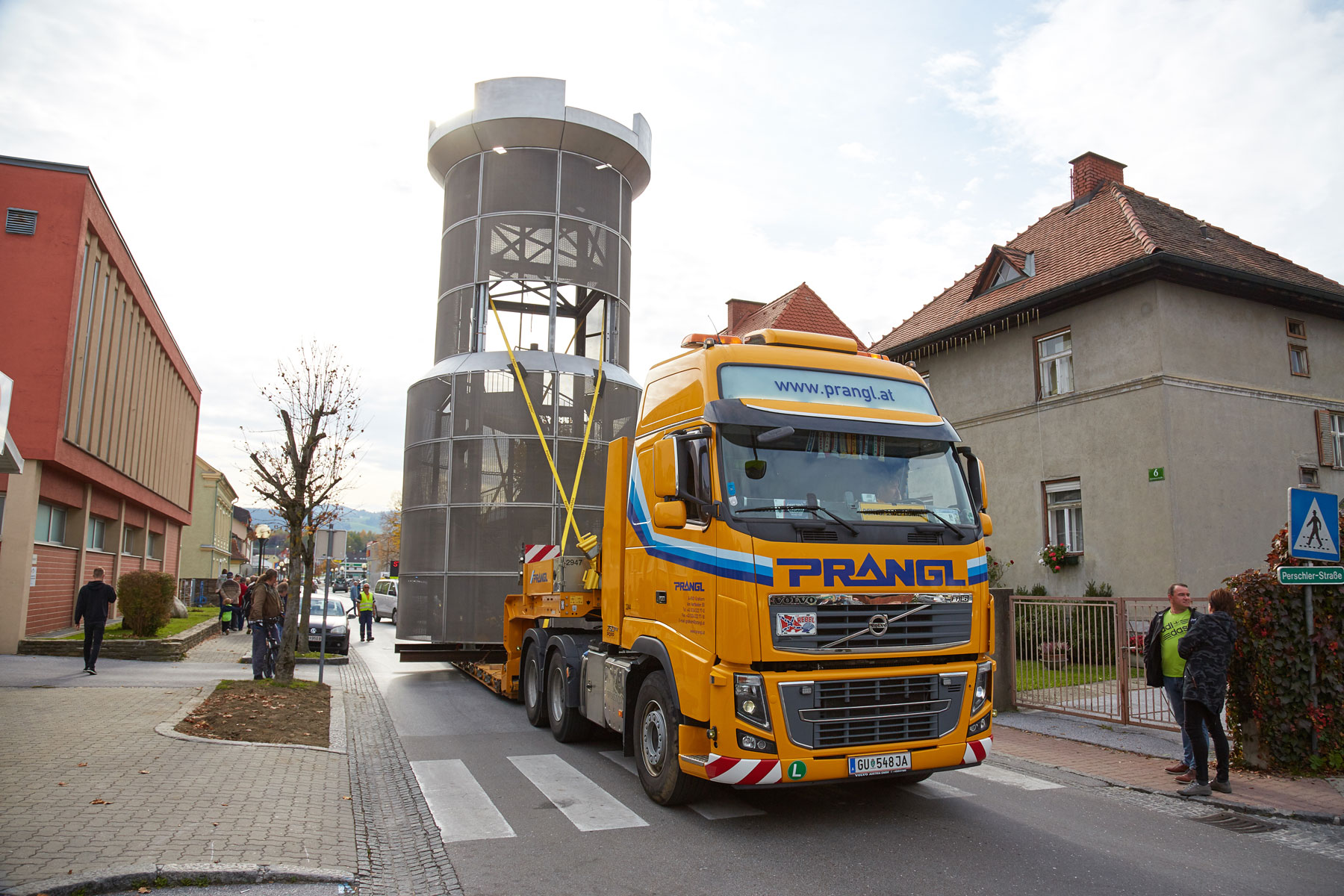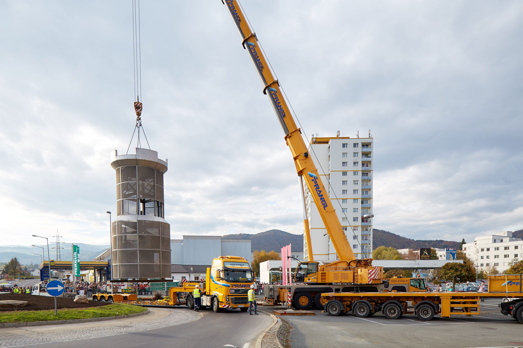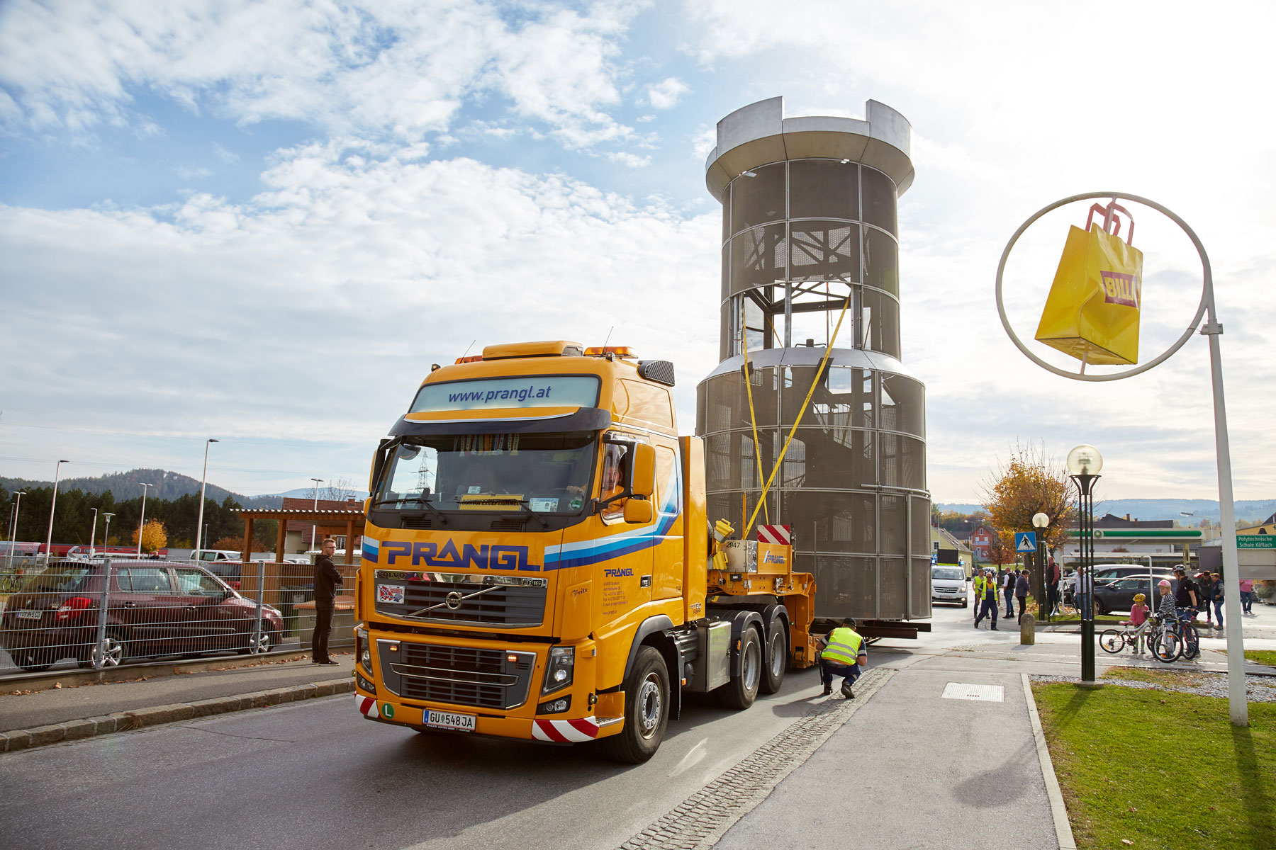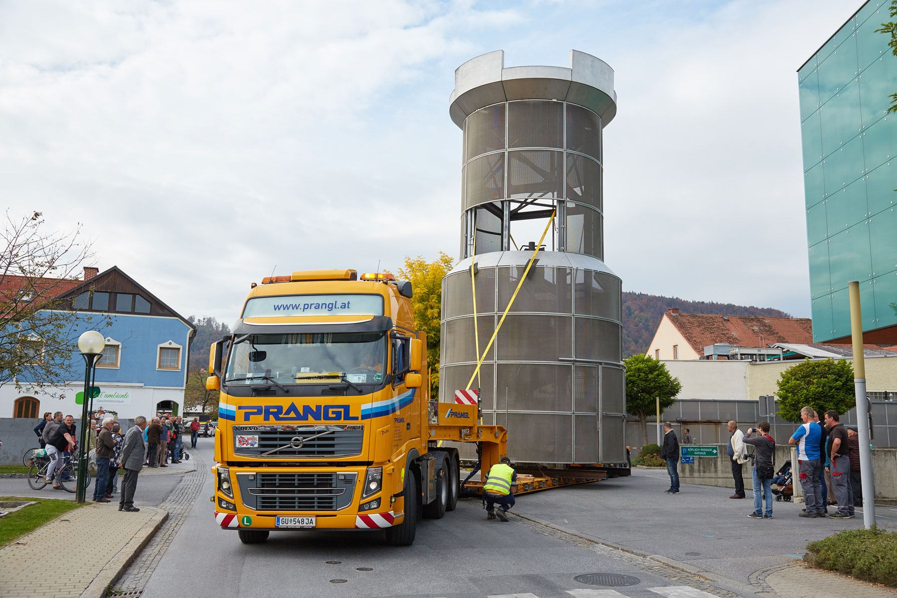 A stájerországi Köflach új jelképet kapott. A város tornyát, amely korábban a városháza mellett állt, a B70-es úton a város bejáratánál található körforgalom közepén helyezték el. A különleges szállítással és az emelési munkákkal kizárólagosan a Pranglt bízták meg.