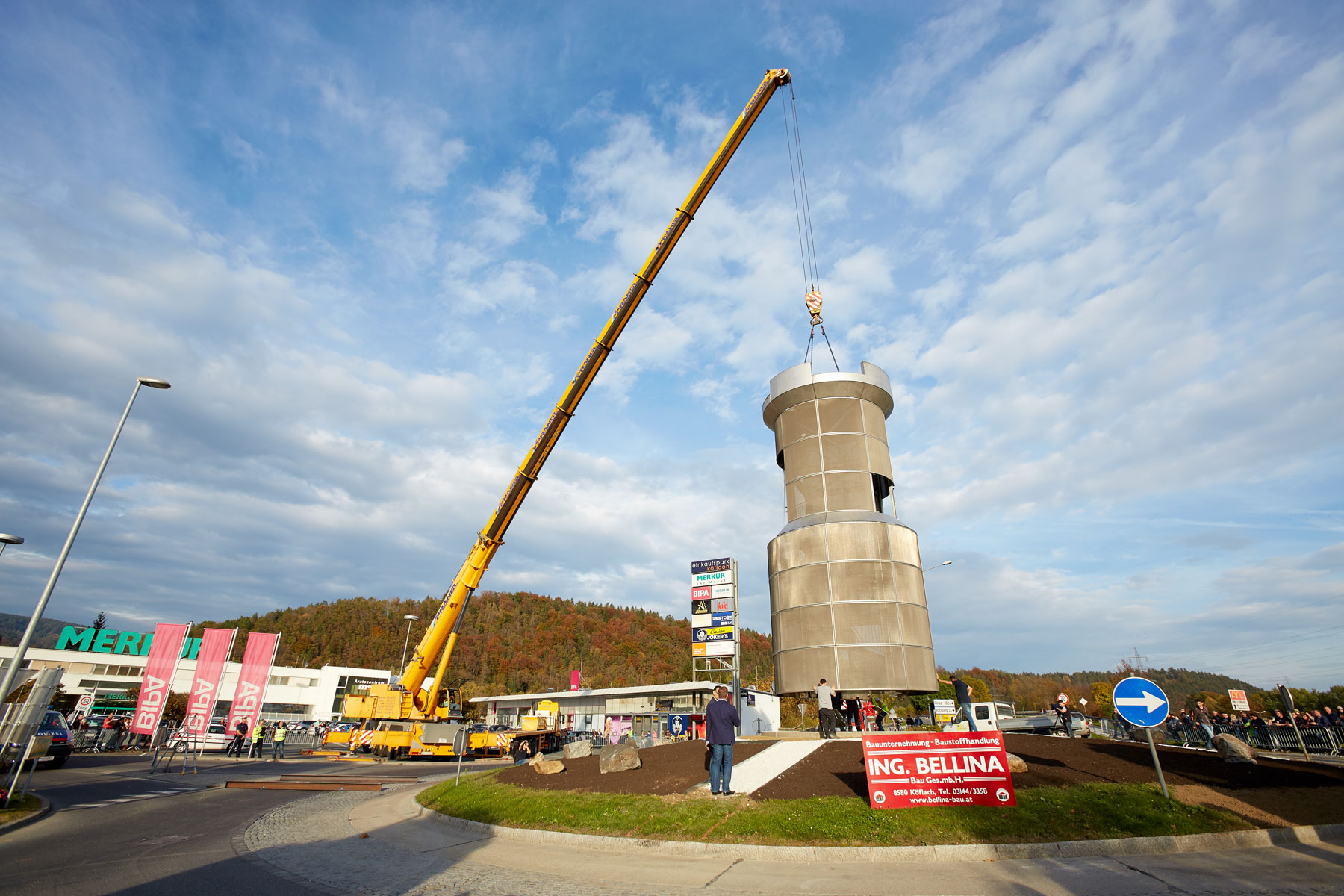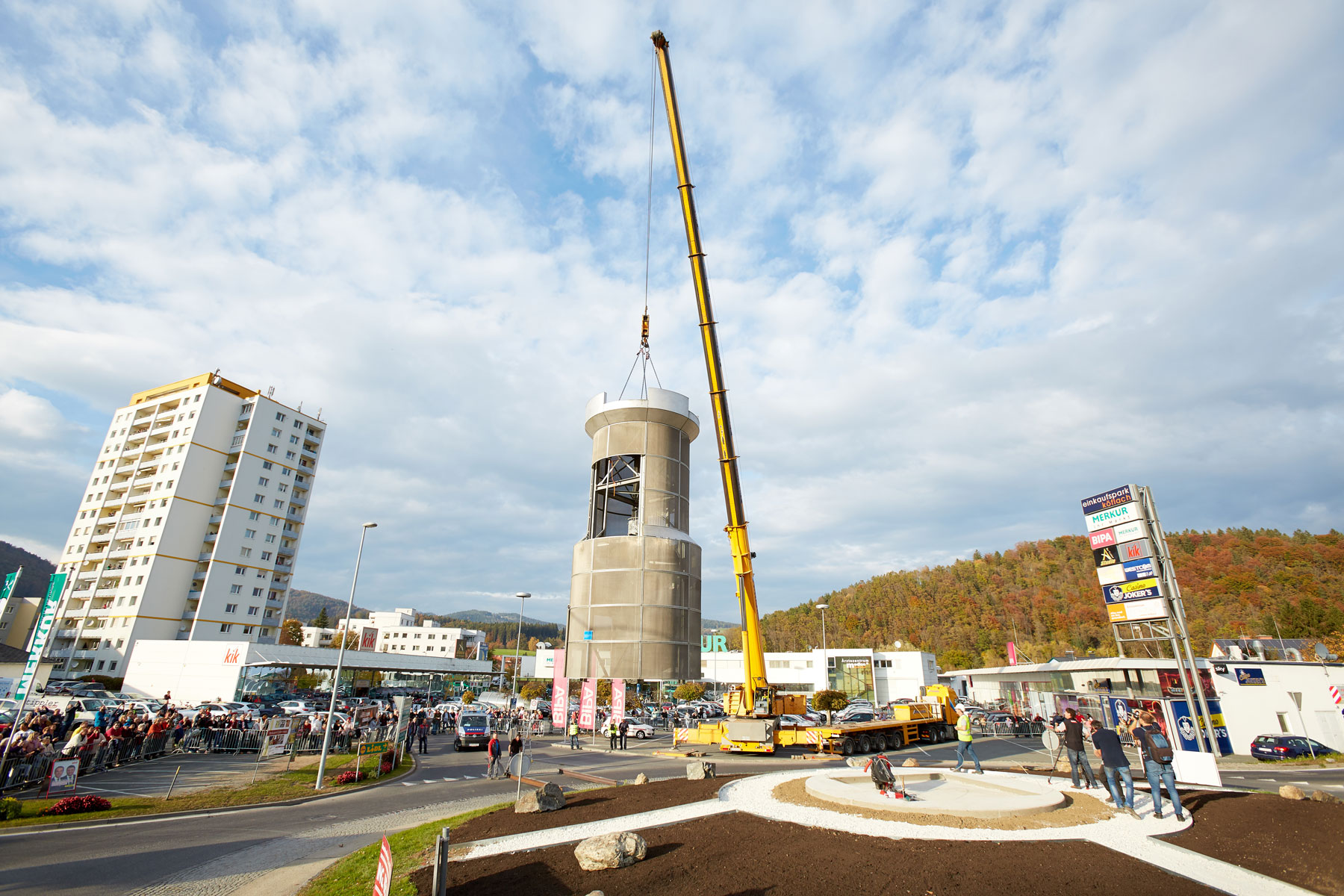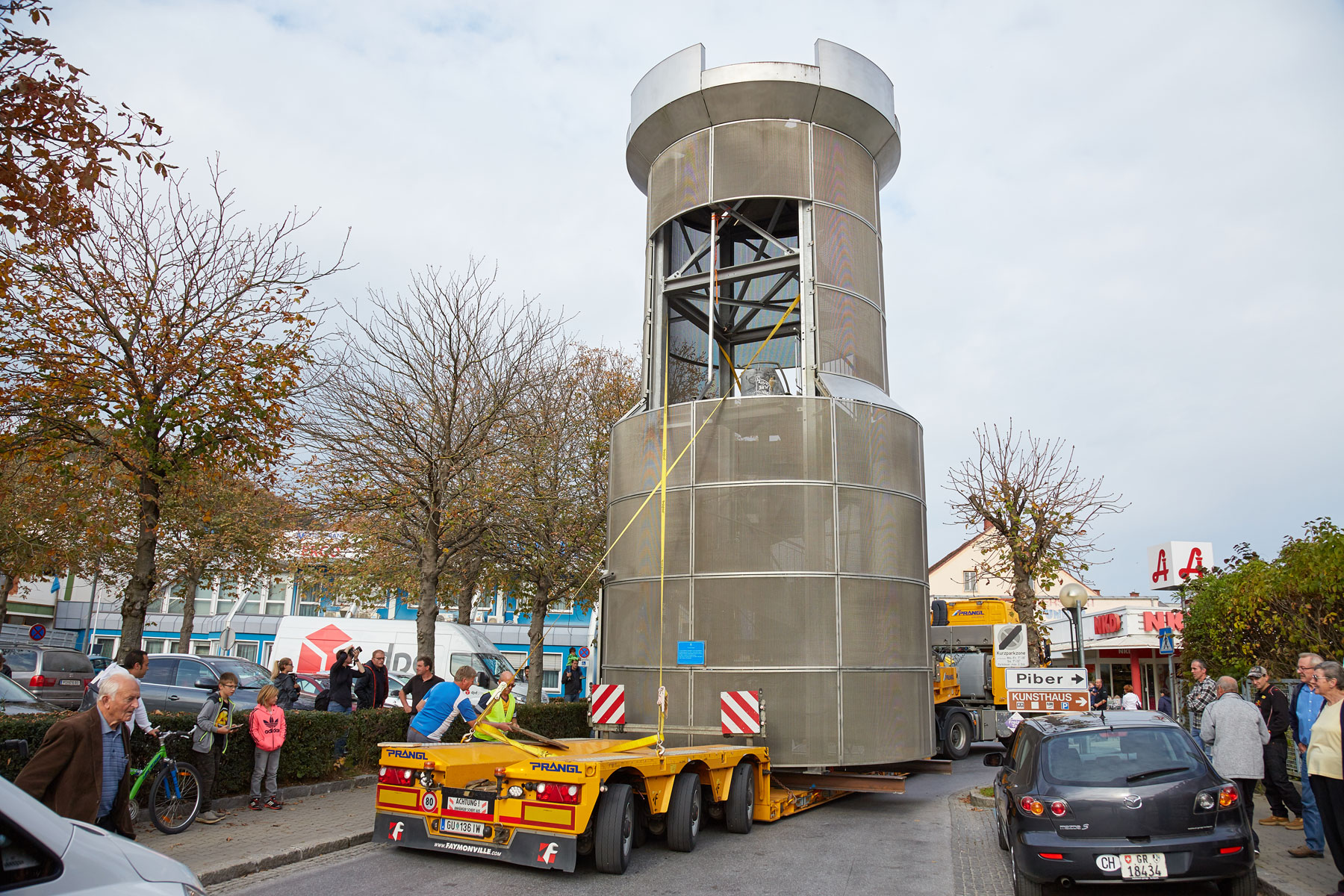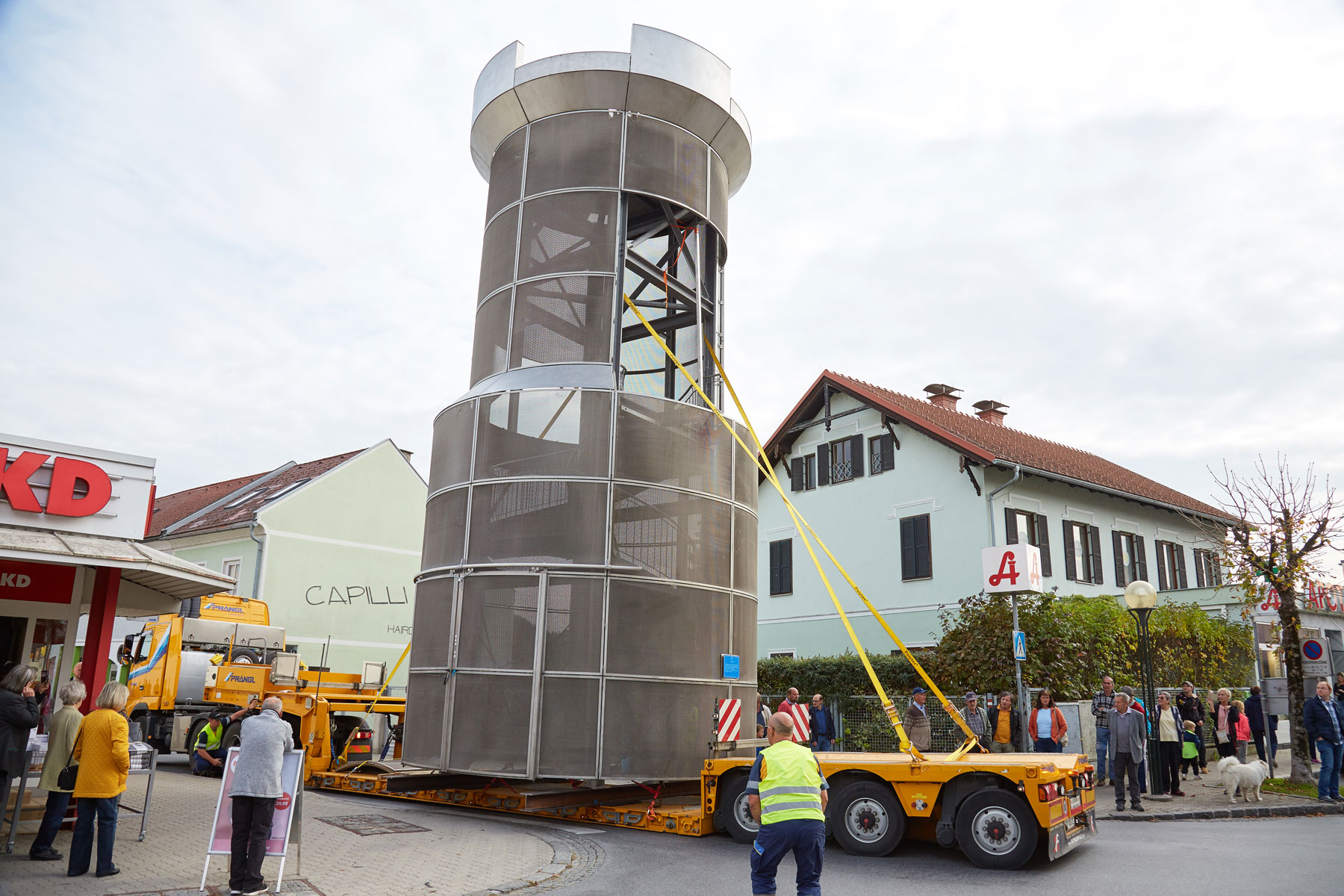 Nagyon sok bámészkodó kísérte a tornyot az úton az új, reprezentatív helyére. A sajtó és a sok bámészkodó figyelő szemei előtt Köflach jelképe végül szintén egy 200 tonnás teleszkópos daru jóvoltából került az új helyére a körforgalom közepén. Ismét egyértelműen bebizonyosodott, hogy milyen előnyei vannak a Prangl közvetítőktől mentes, „egyablakos” megoldásainak.