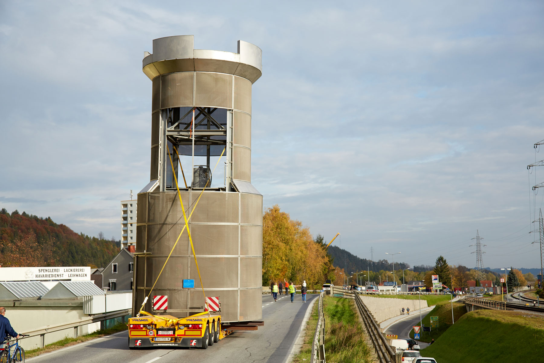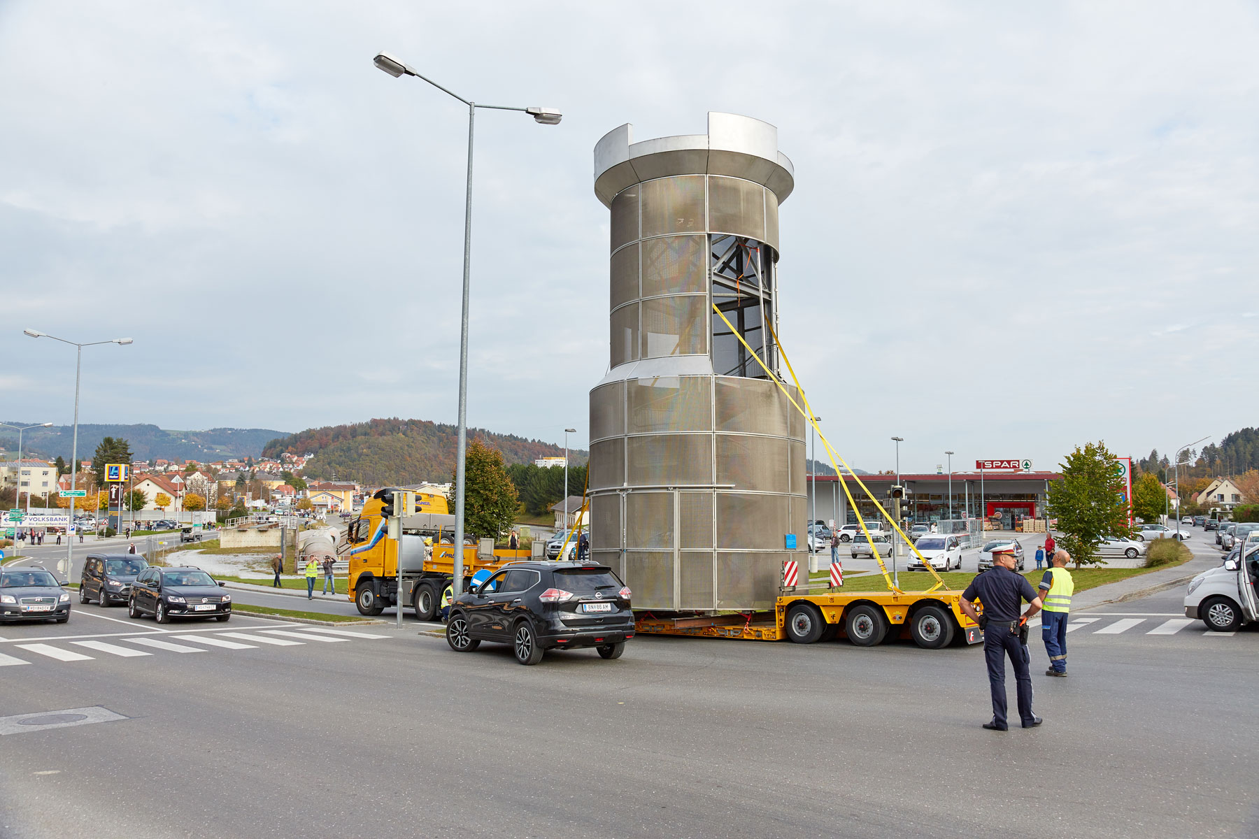A tornyot a meglévő alapjairól emeleték fel egy 200 tonnás teleszkópos daru segítségével, és egy 25 méter hosszú mélybölcsős szállítójárműre helyezték. Ezután a jármű lépésben haladt végig Köflach városközpontjának keskeny utcáin. Az út nagy részét hátramenetben kellett megtenni. Azonban nem a torony súlya (15 tonna) és nem is a szállító eszköz hossza jelentette az igazi kihívást. A szállítmány csaknem 11 méteres teljes magassága kívánta meg a nagy pontosságot és koncentrációt az egész csapattól. Mindazonáltal a tornyot sikerült egy darabban elszállítani és felállítani.