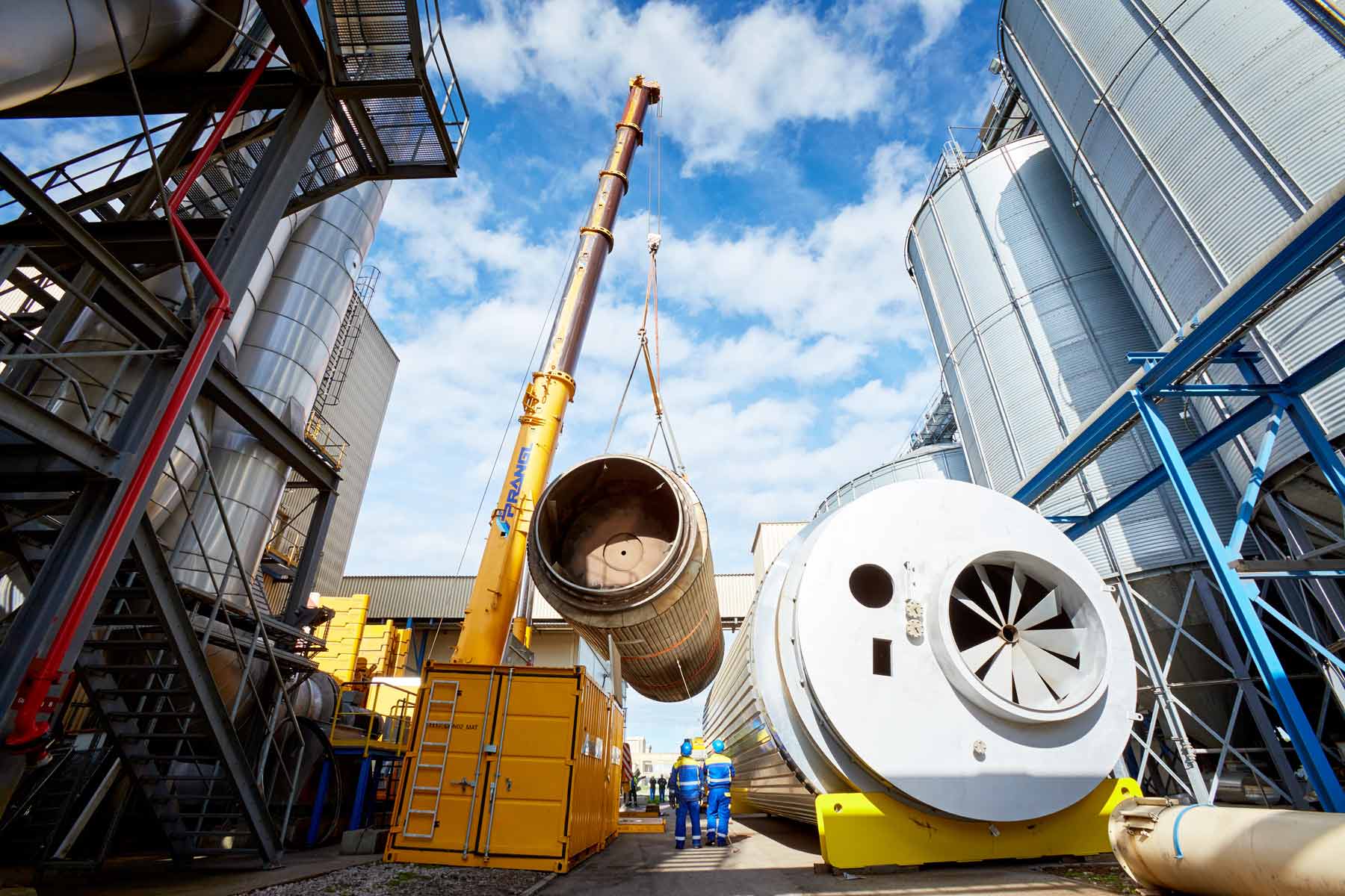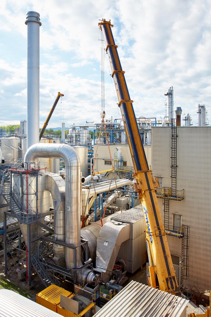 Az Agrana tervezett karbantartási munkái során a Prangl 10 géppel volt jelen egyidejűleg. A 60 és 70 tonnás teleszkópos daruk a bioetanol gyár különféle területein végeztek emeléseket. A daruk munkáját villás targoncák, csuklós, karos és ollós személyemelő szerelőállványok, valamint egy kezelő személyzettel ellátott teleszkópos rakodógép segítették.