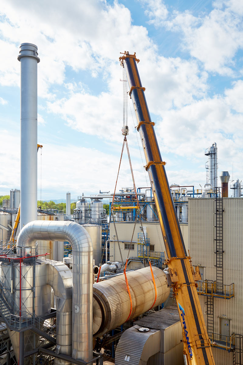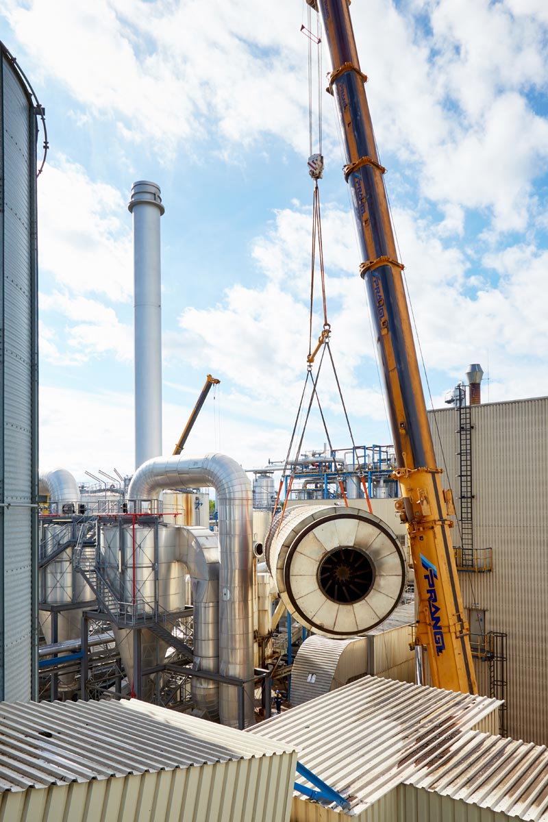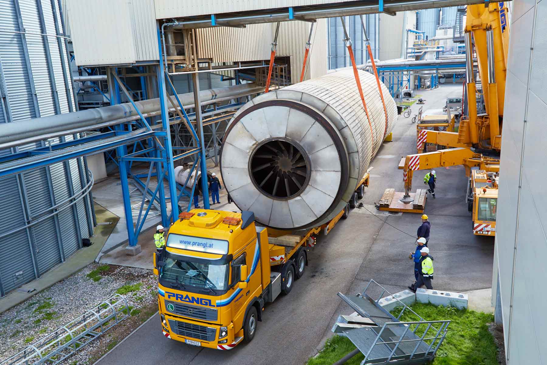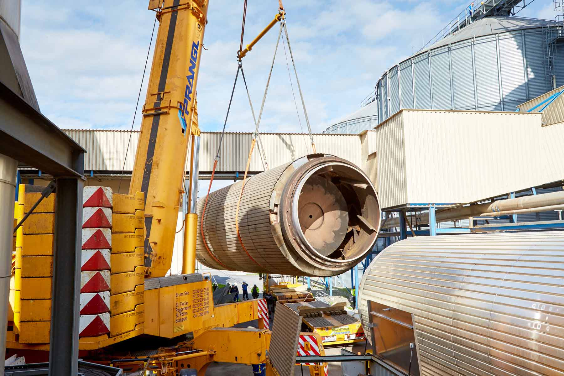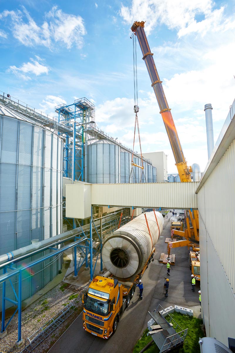 Prangl számára akadt elég tennivaló az Agrana területén. Az idei leállás legfőbb feladata minden bizonnyal az 51 tonna tömegű szárítódob cseréje volt. Rendkívűl szűkös helyviszonyok mellett – meglévő épületek között – kellett a régi dobot kiemelni és az újat behelyezni. Az alapos előzetes tervezésnek és a darukezelők precíz munkavégzésének köszönhetően mindkét kritikus emelés tökéletesen zajlott.