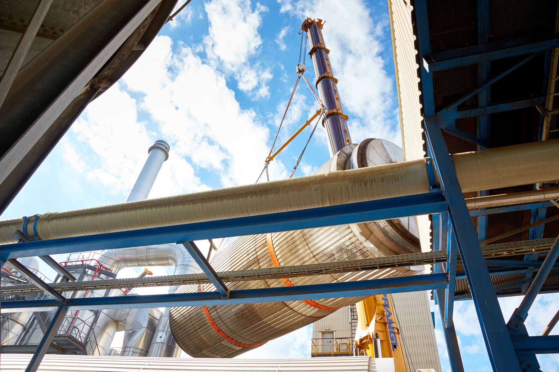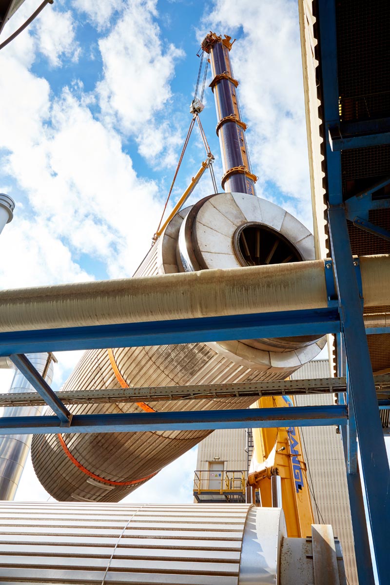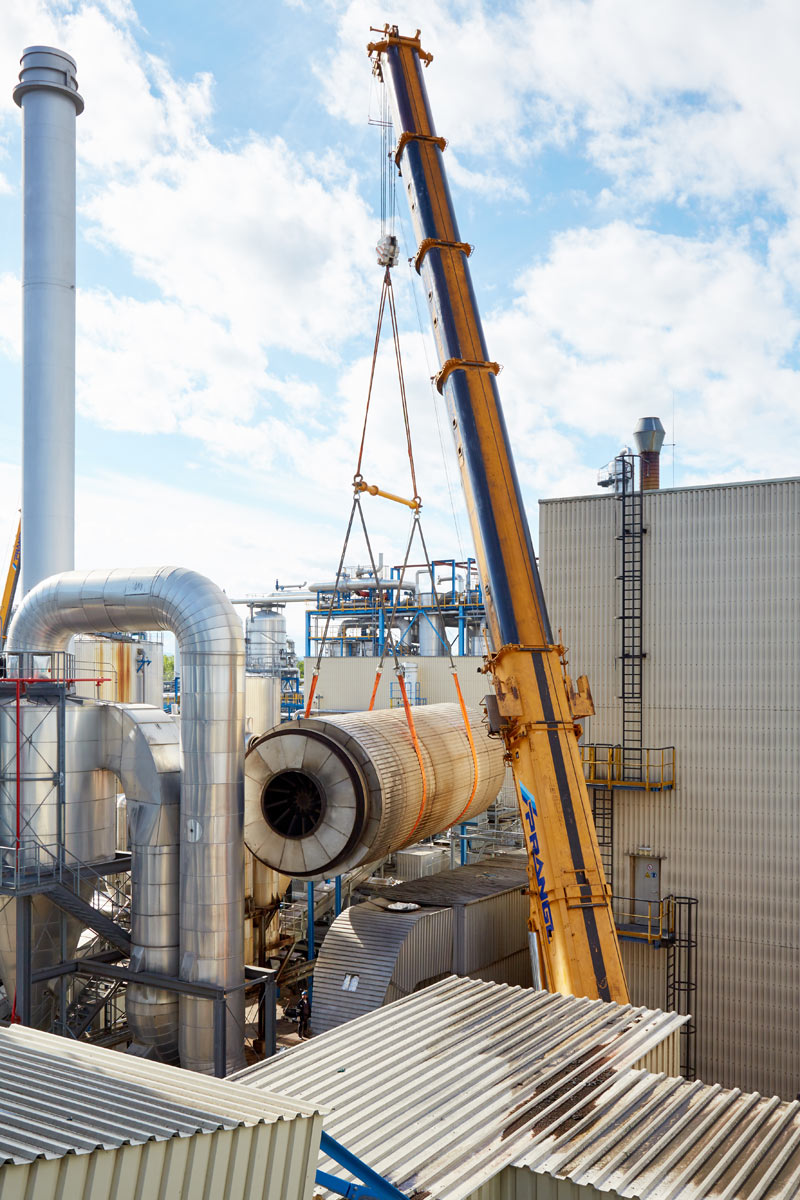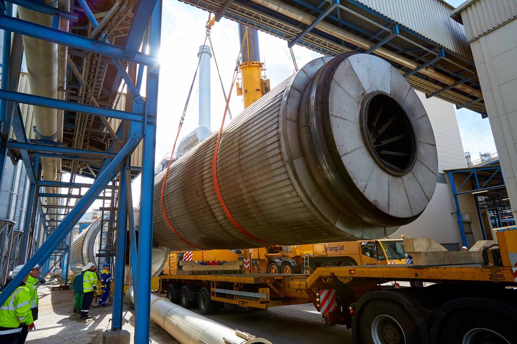 A régi szárítódobot egy nagy daru közvetlenül a Prangl egyik nyergesvonatójára helyezte, majd üzemen belül 200 méterrel távolabb „lerakta”. Az ottani rakományt aztán egy 220 tonnás teleszkópos daruval segítségével vitték el a hulladéktelepre. Másnap aztán az új, szintén 51 tonnás dobot gondosan beemelték, és megkezdődhetett a berendezés újbóli összeszerelése.