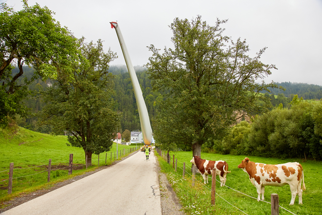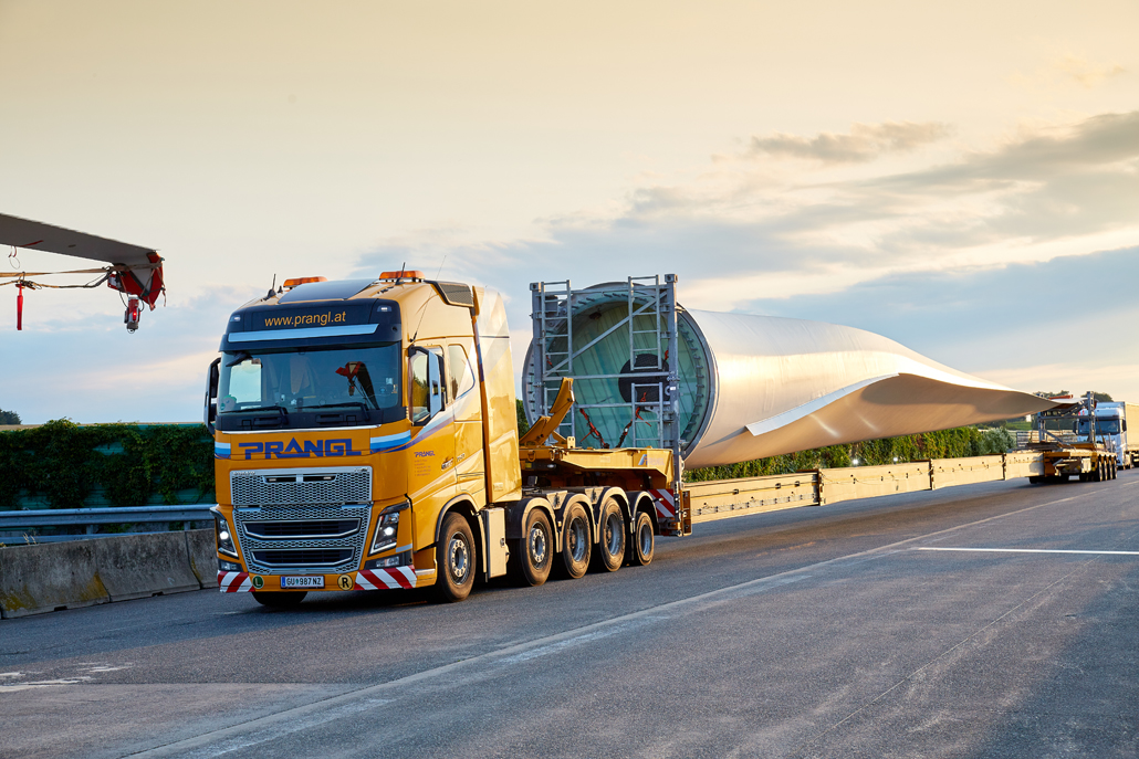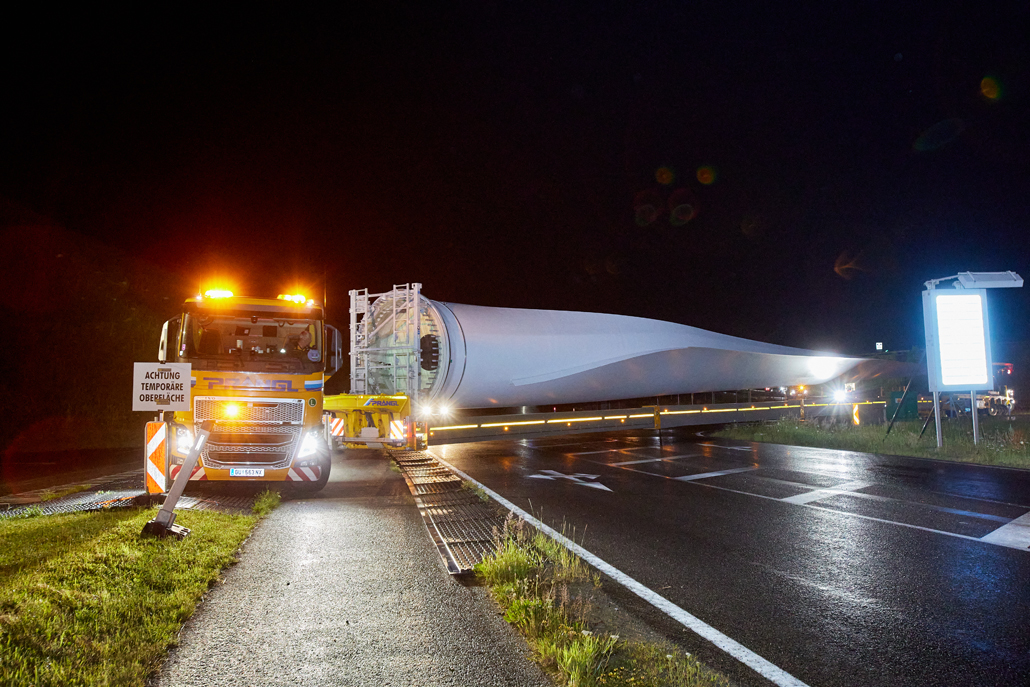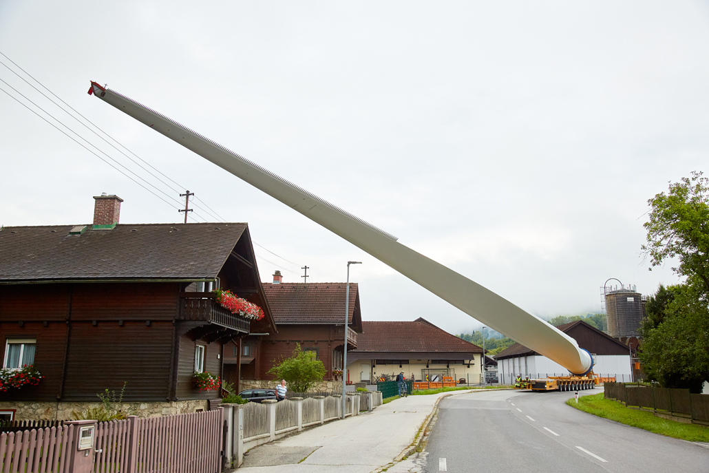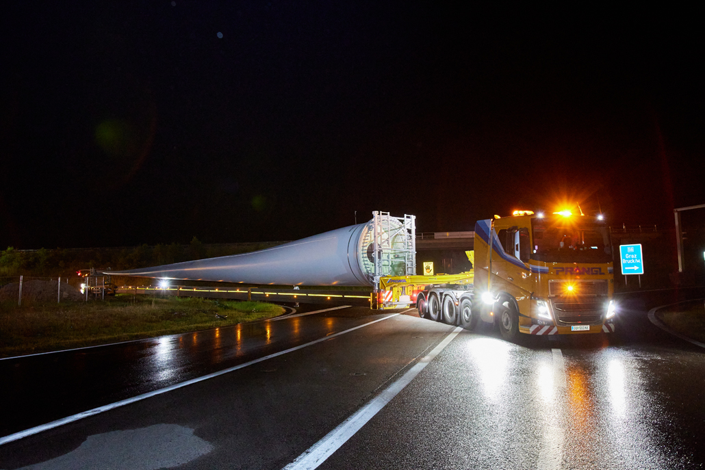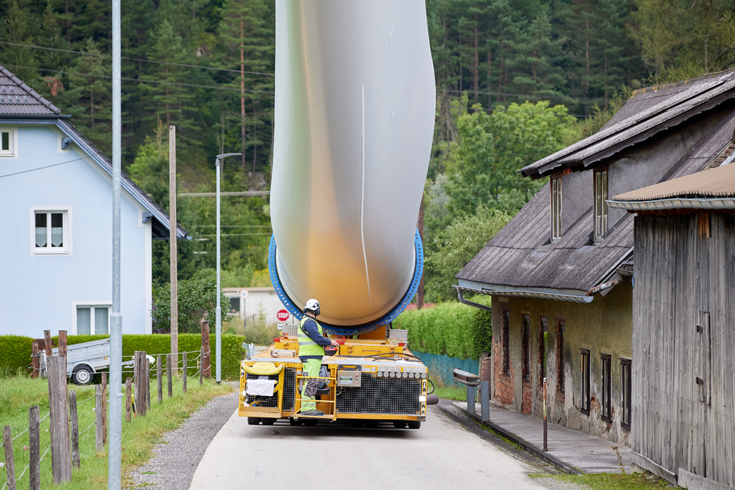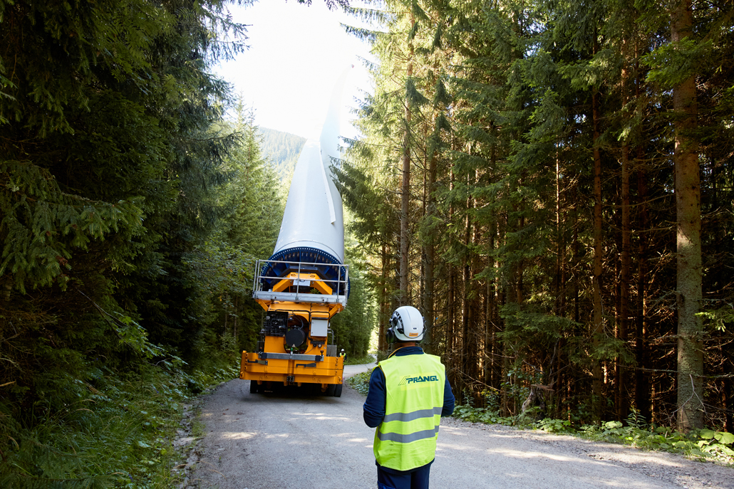 Közúti szállítás a németországi gyárból, rakományszállítás az ausztriai Mürzzuschlagban, hegyi szállítás és összeszerelés: Prangl összeállított egy teljes csomagot az új szélturbinákhoz. Ez természetesen magában foglalta az útvonalak és a daruparkolóhelyek előzetes tervezésének támogatását is, valamint hogy kifejezetten a szélturbinák alkatrészeinek szállítására és emelésére tervezett speciális berendezéseket telepítettek.