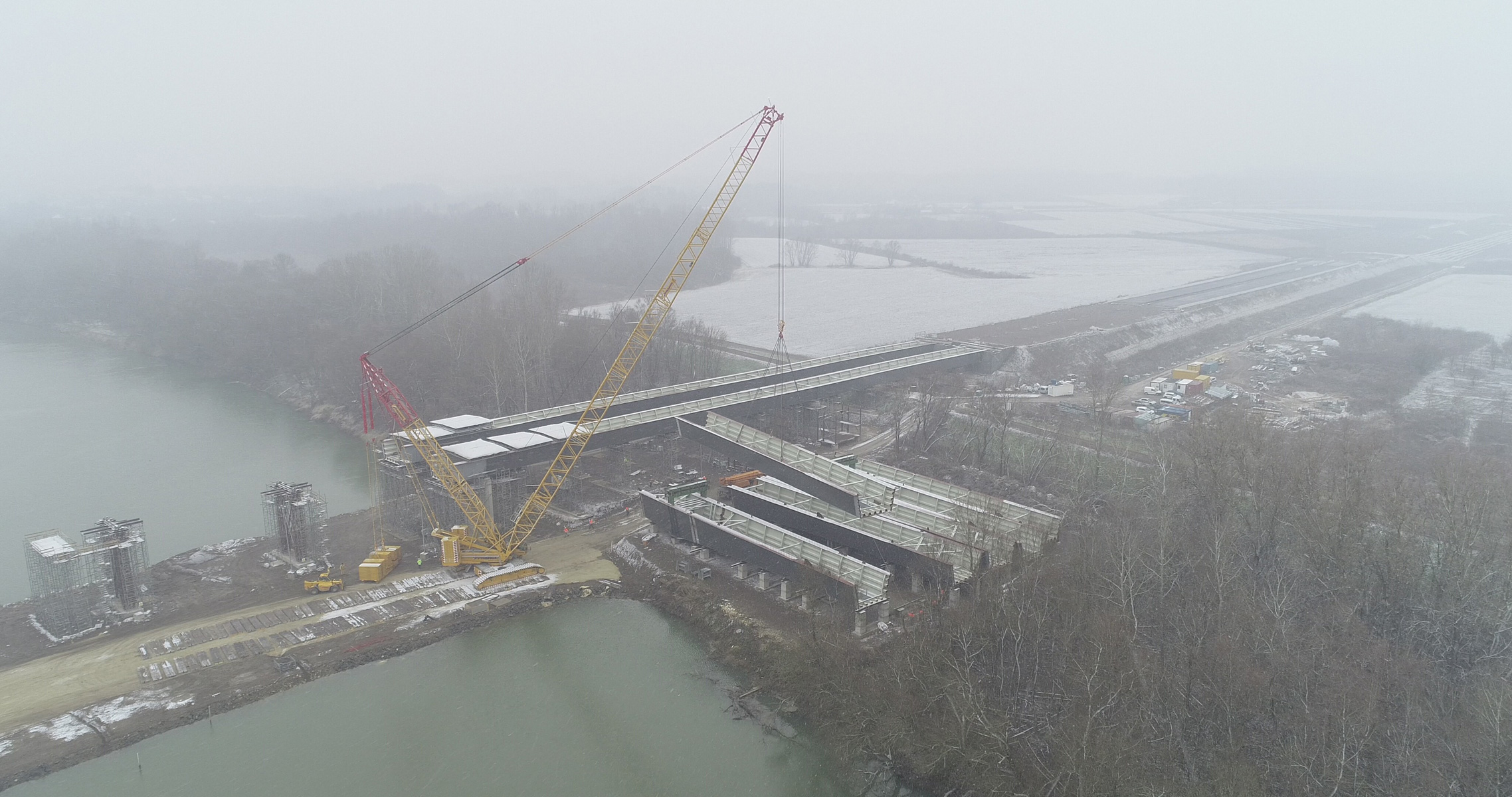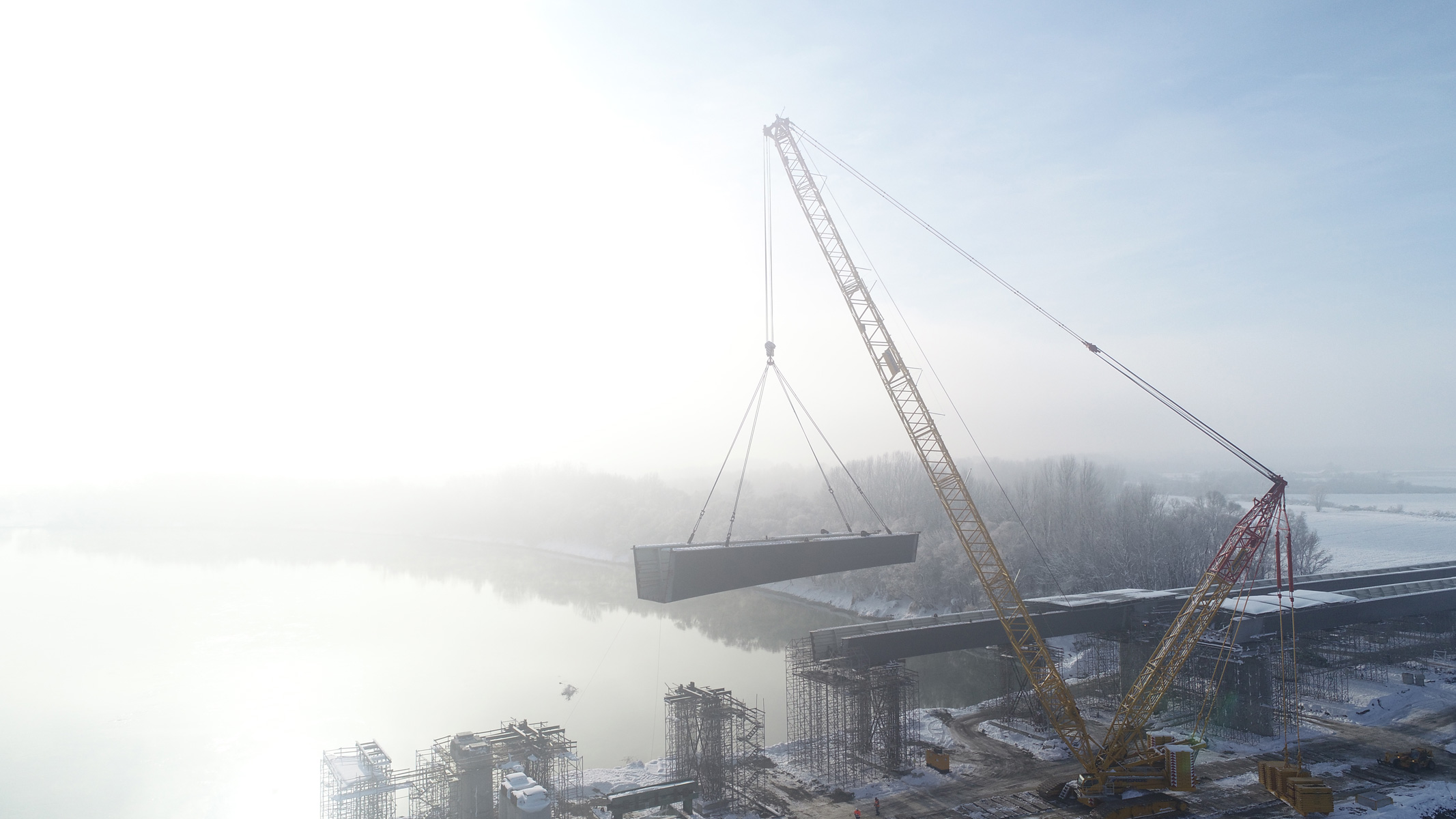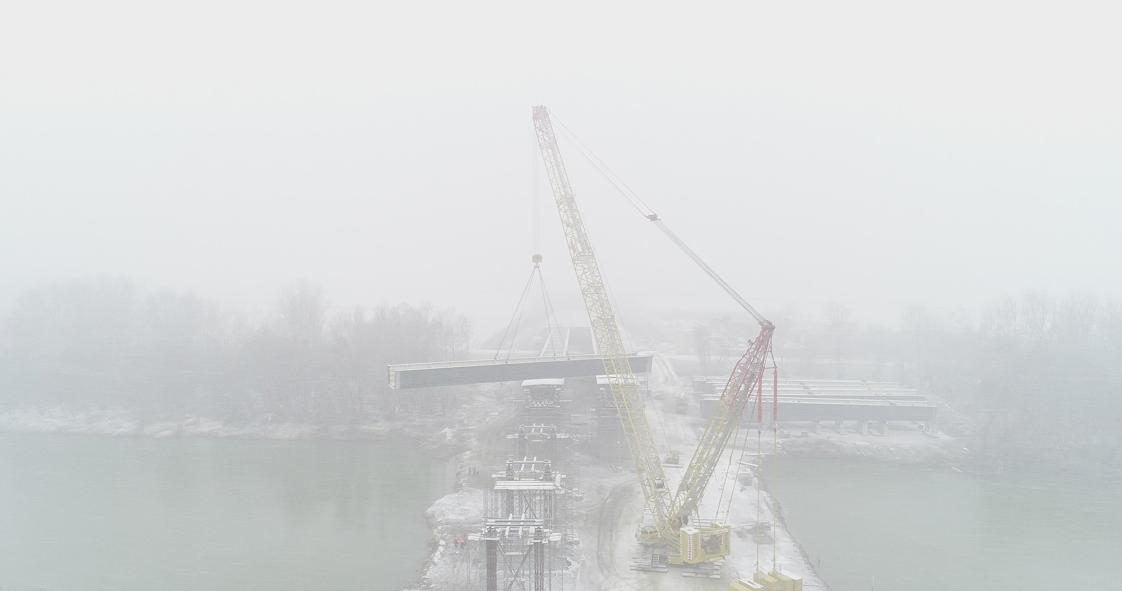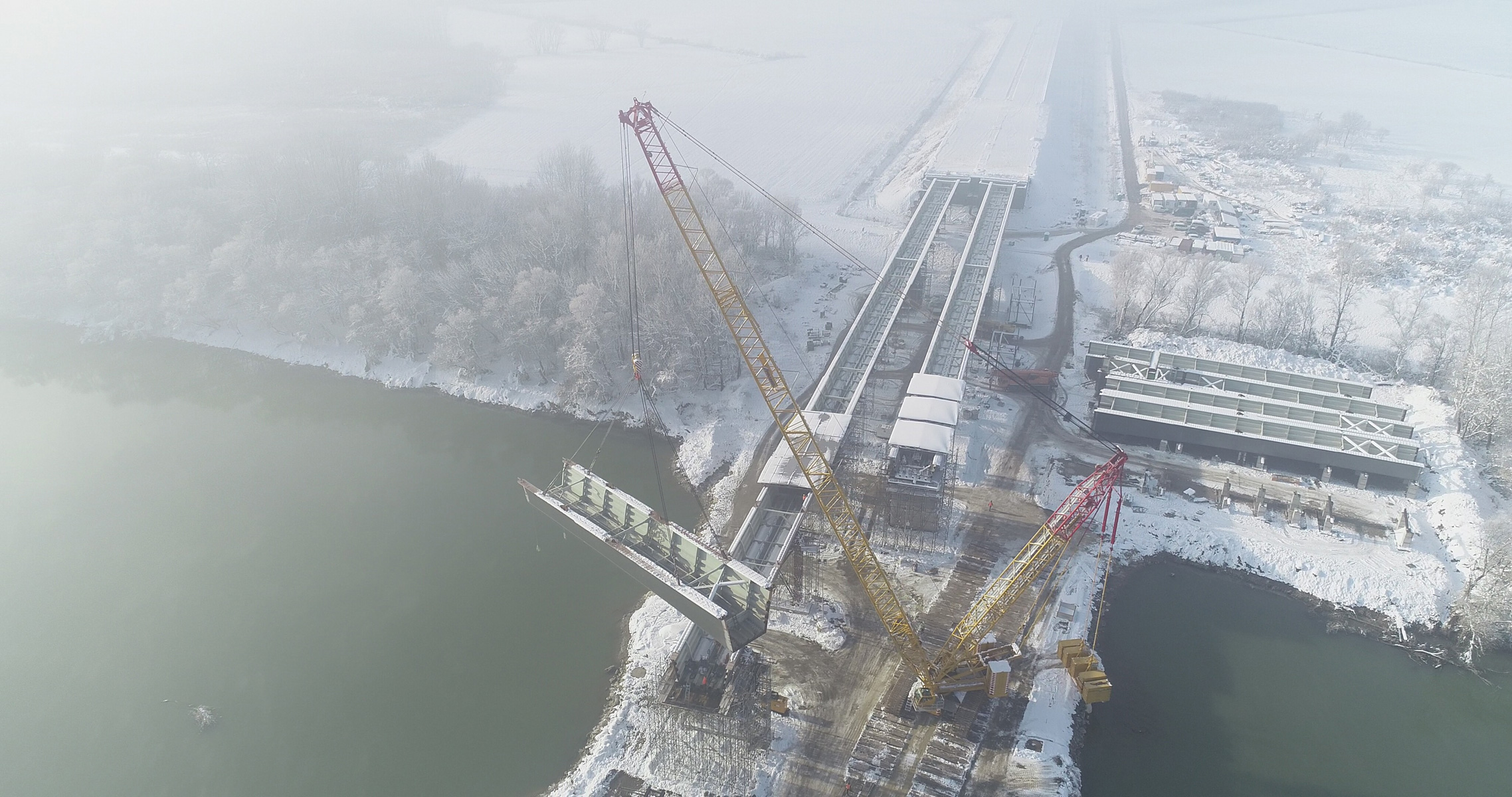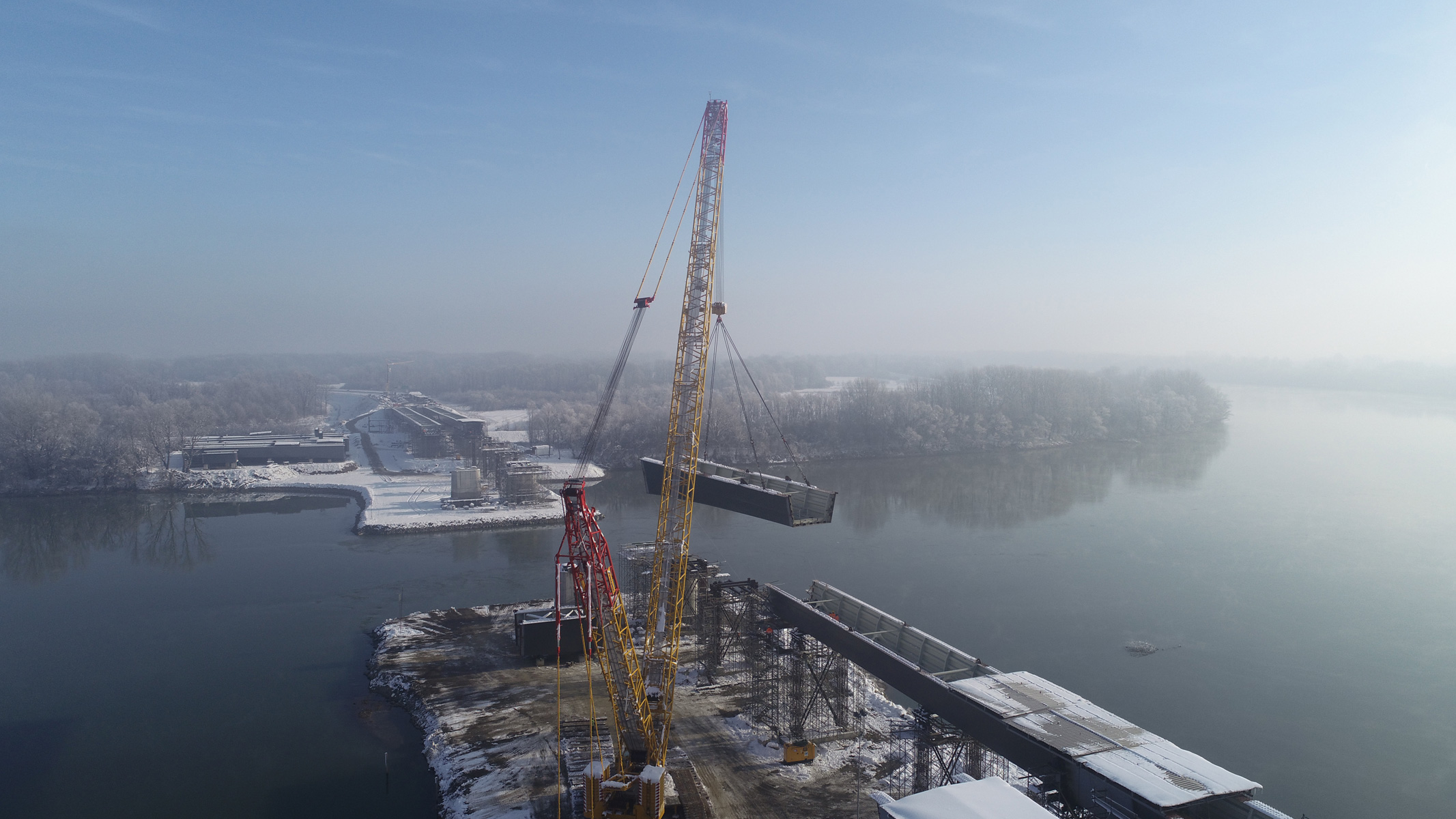 A daru feladata csupán az emeléssel nem ér véget. A lánctalpas daru a hídelemeket a helyükre emeli és egy fél napig még akár a levegőben tartja, hogy azokat pontosan be lehessen igazítani. Csak ezt követően engedik le és hegesztik a helyére az adott hídelemet. A nemzetközi csapat minden munkafolyamatnál kiválóan helytállt. A szlovén, horvát és osztrák munkatársak már a tervezési szakaszban is tökéletesen együttműködtek. Ismét bebizonyosodott, hogy a Prangl nemzetközileg elismert szolgáltatásait bárhol igénybe lehet venni.