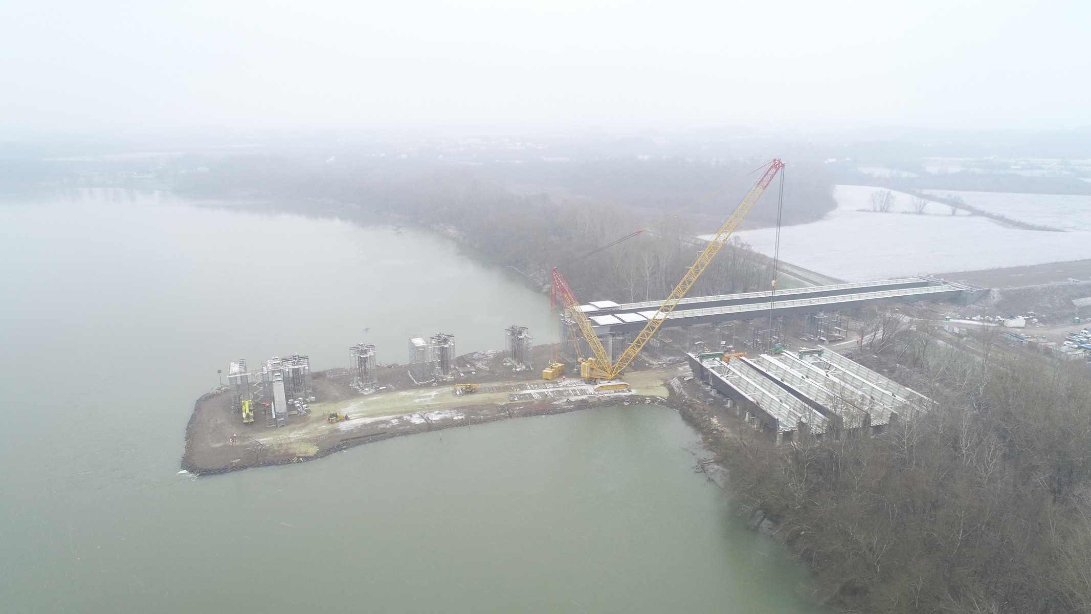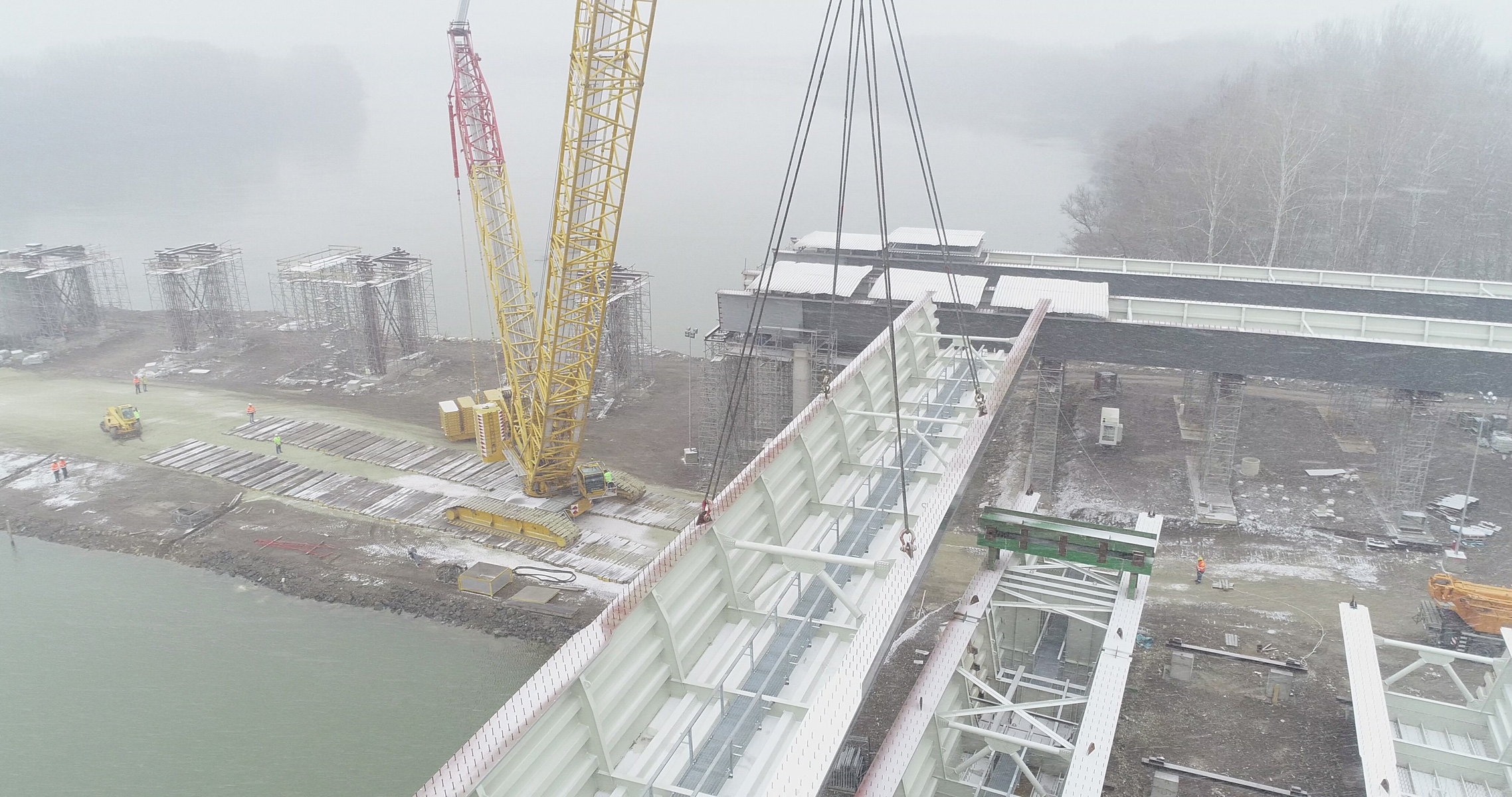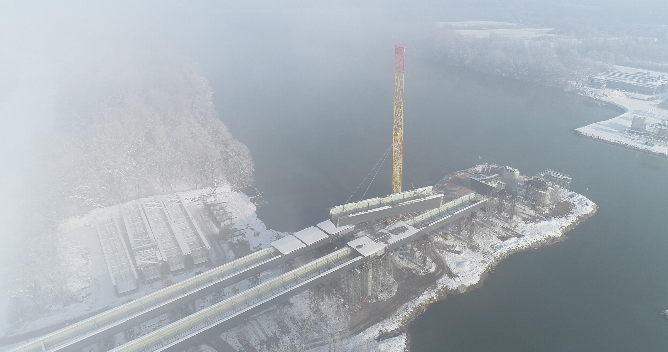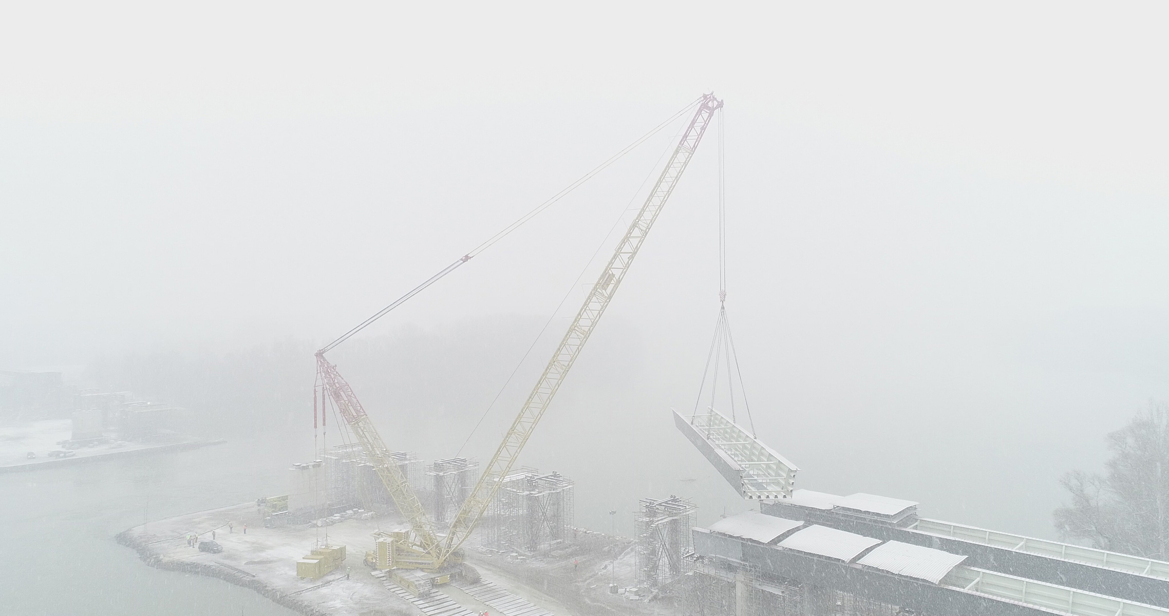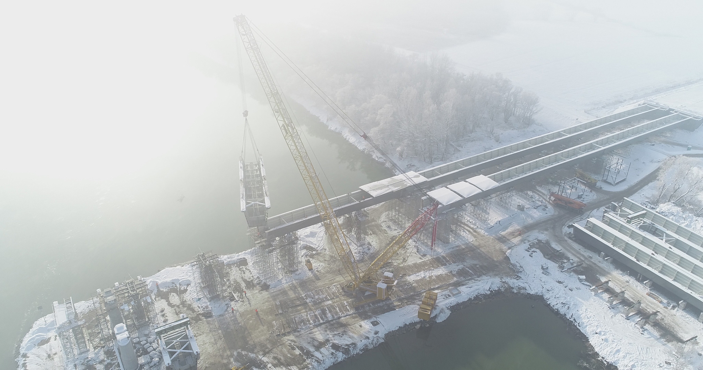 A daru feladata csupán az emeléssel nem ér véget. A lánctalpas daru a hídelemeket a helyükre emeli és egy fél napig még akár a levegőben tartja, hogy azokat pontosan be lehessen igazítani. Csak ezt követően engedik le és hegesztik a helyére az adott hídelemet. A nemzetközi csapat minden munkafolyamatnál kiválóan helytállt. A szlovén, horvát és osztrák munkatársak már a tervezési szakaszban is tökéletesen együttműködtek. Ismét bebizonyosodott, hogy a Prangl nemzetközileg elismert szolgáltatásait bárhol igénybe lehet venni.