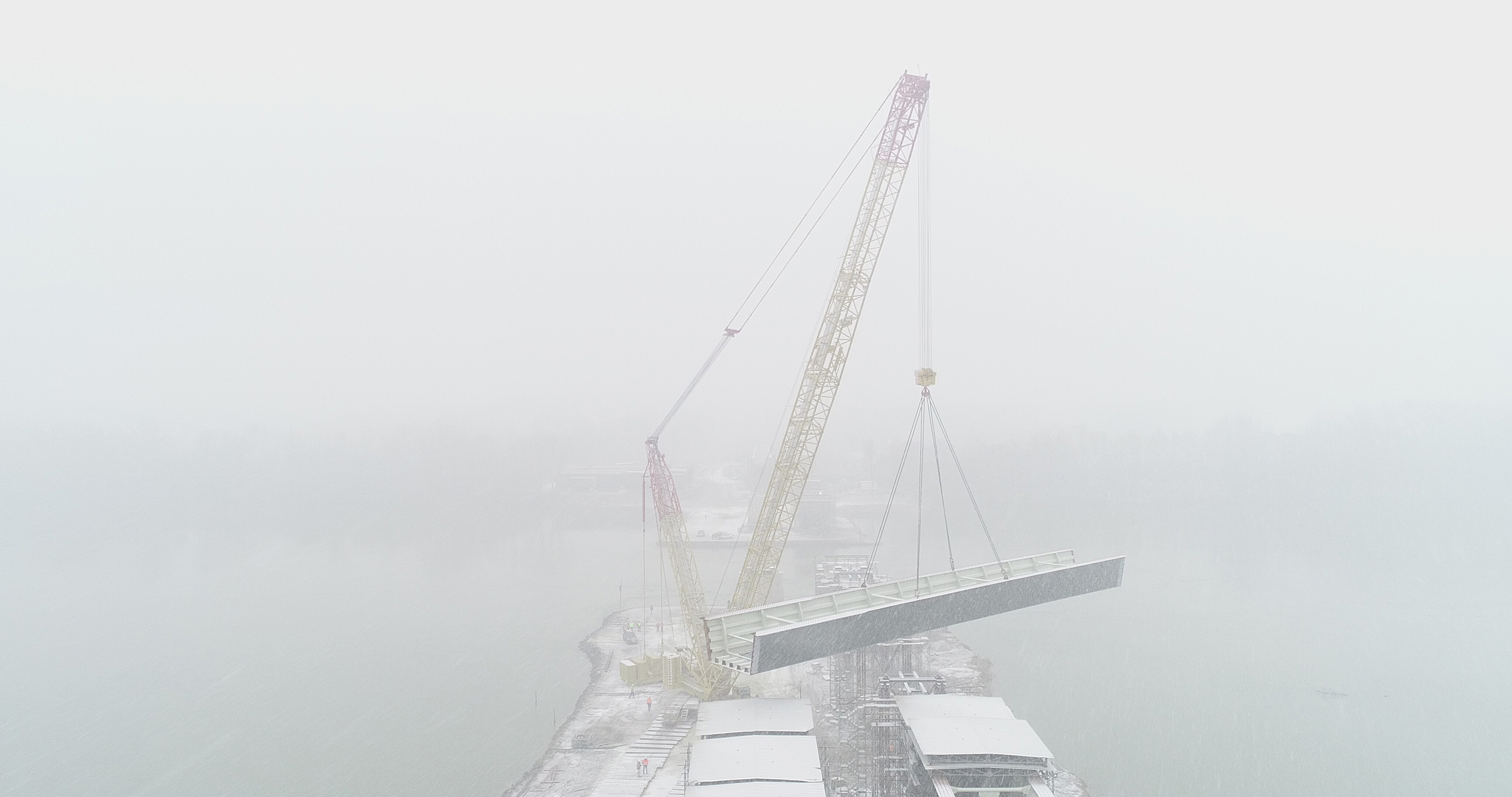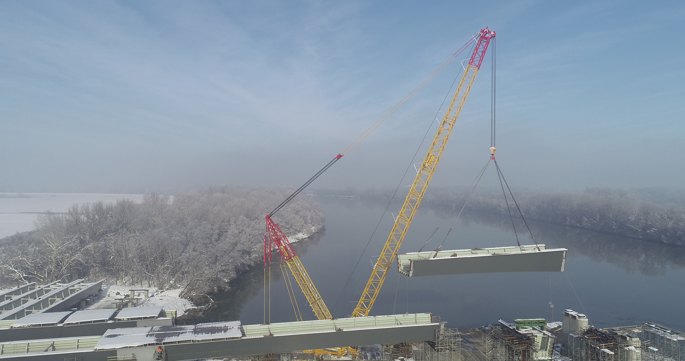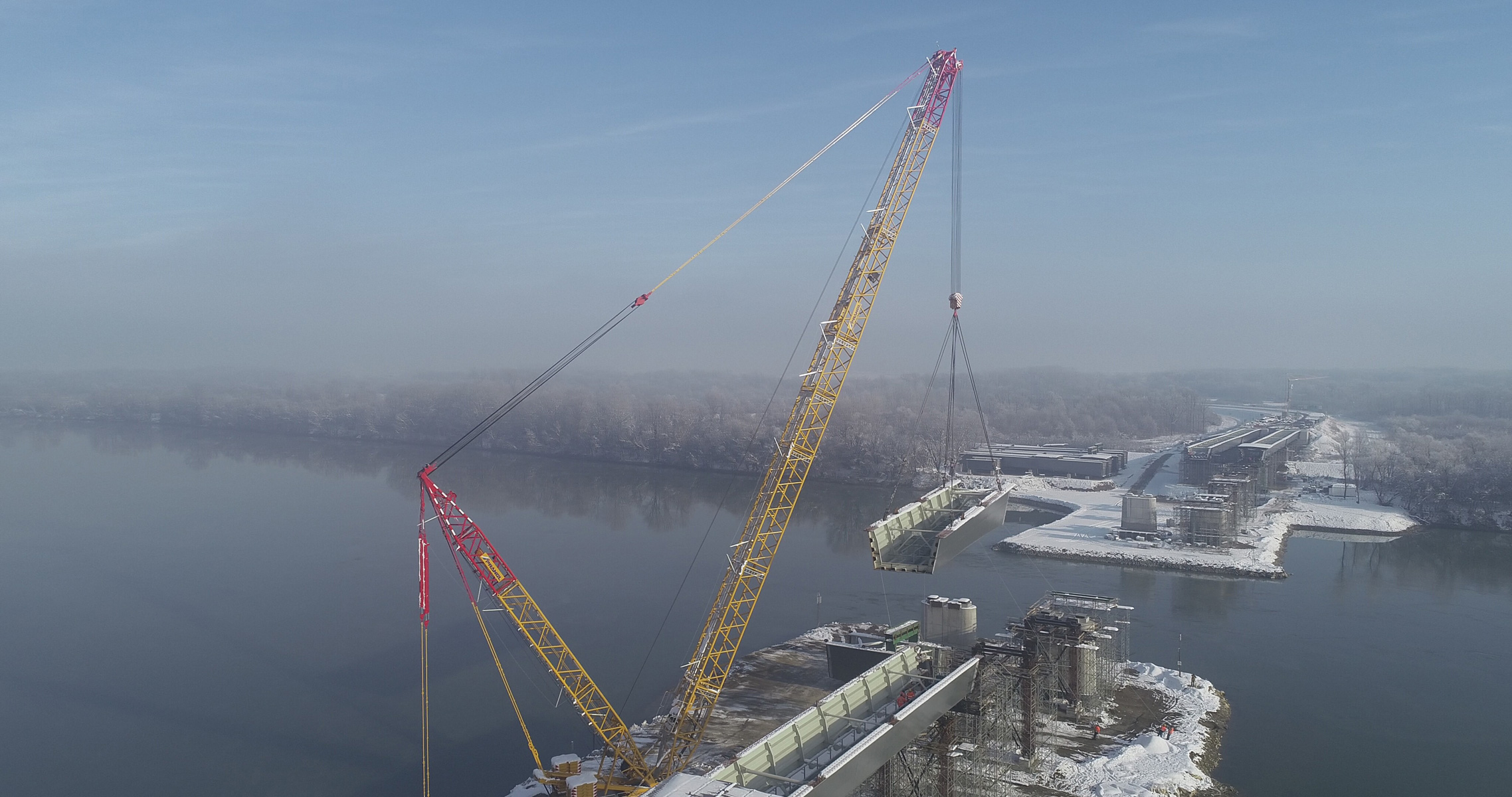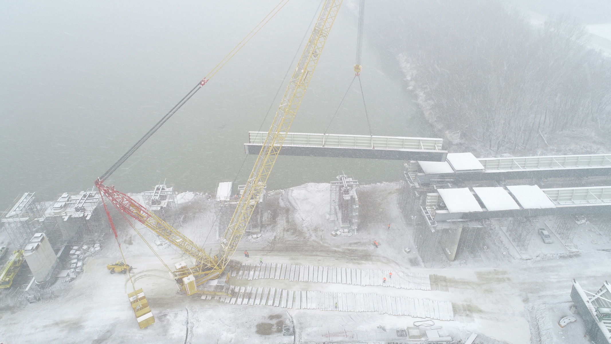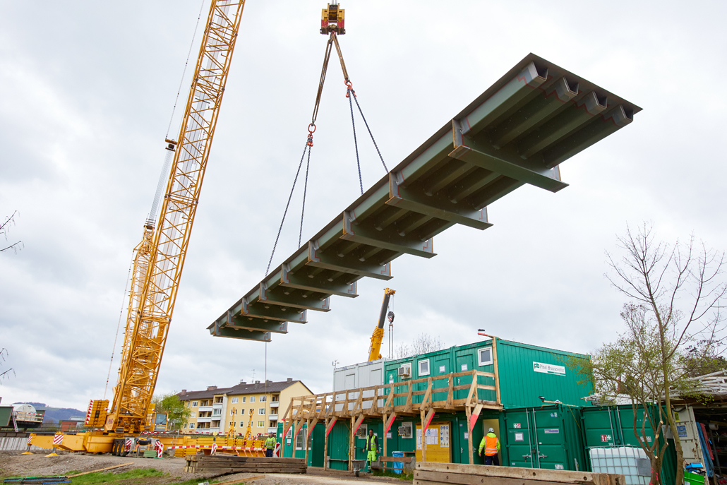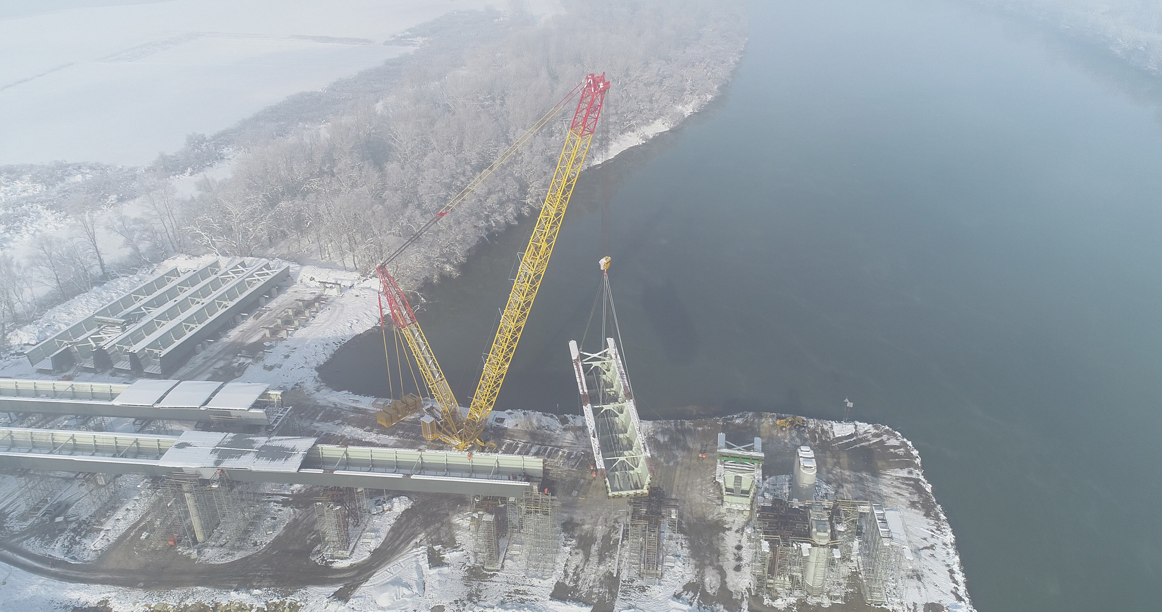A daru feladata csupán az emeléssel nem ér véget. A lánctalpas daru a hídelemeket a helyükre emeli és egy fél napig még akár a levegőben tartja, hogy azokat pontosan be lehessen igazítani. Csak ezt követően engedik le és hegesztik a helyére az adott hídelemet. A nemzetközi csapat minden munkafolyamatnál kiválóan helytállt. A szlovén, horvát és osztrák munkatársak már a tervezési szakaszban is tökéletesen együttműködtek. Ismét bebizonyosodott, hogy a Prangl nemzetközileg elismert szolgáltatásait bárhol igénybe lehet venni.