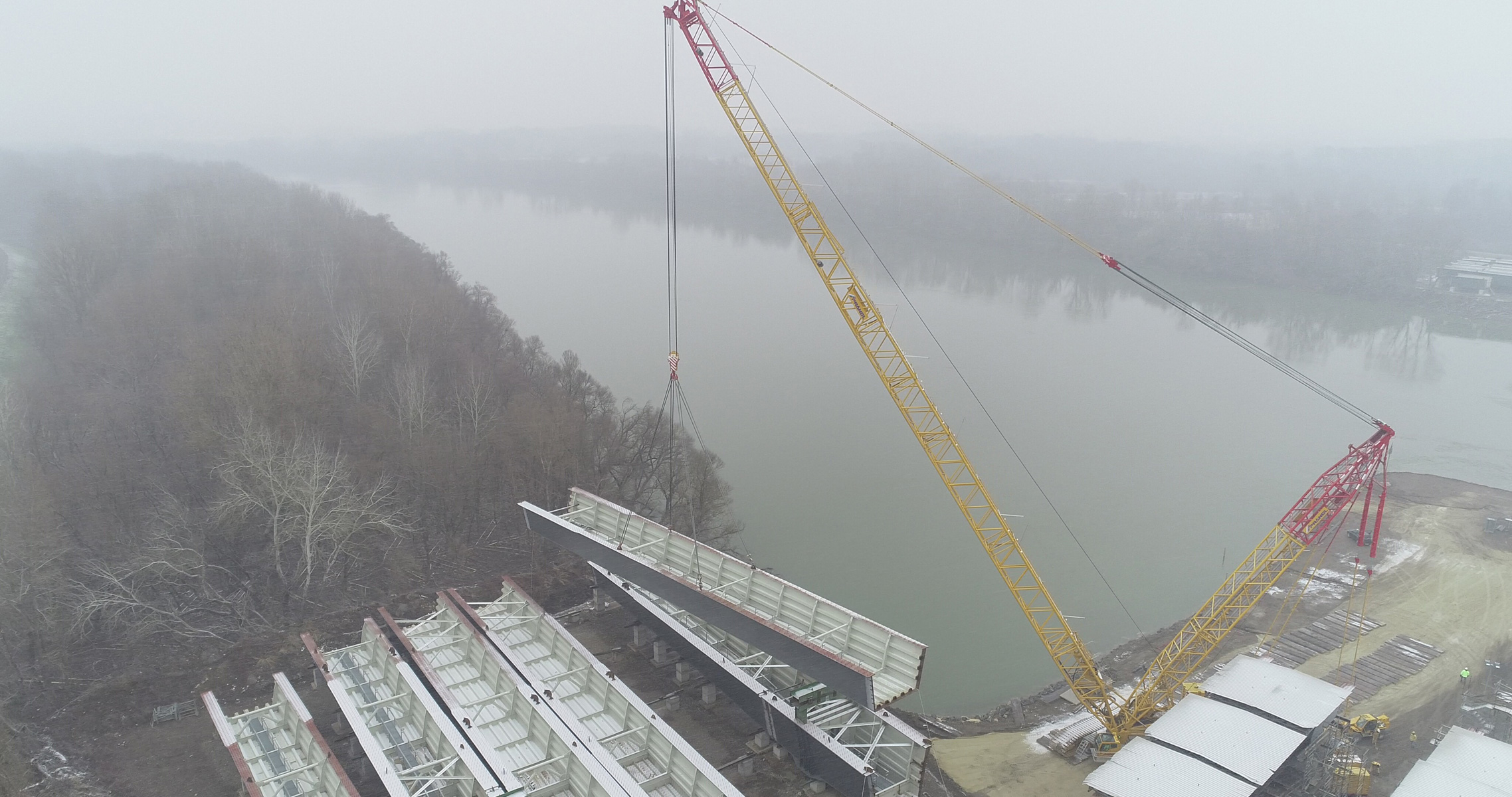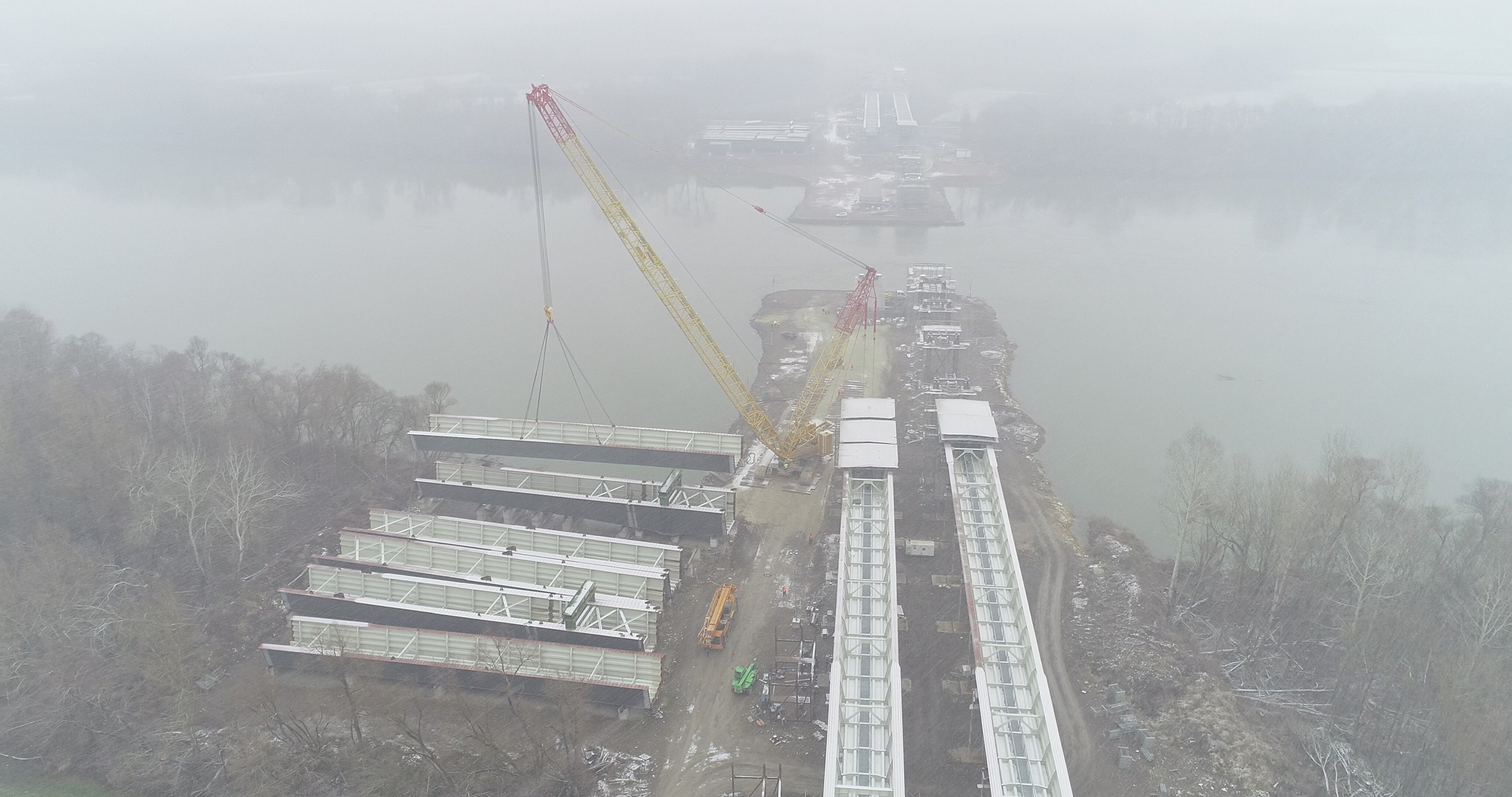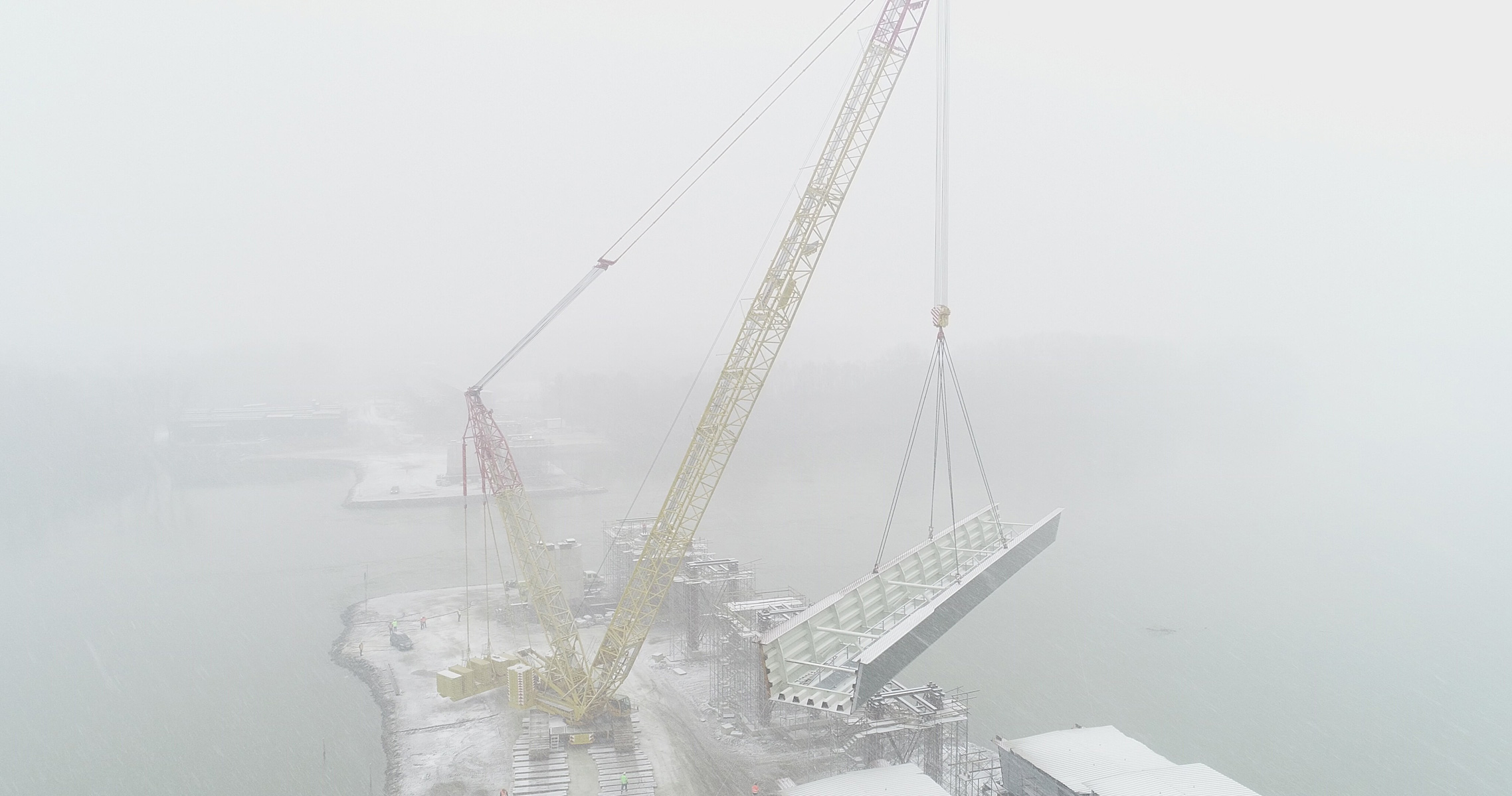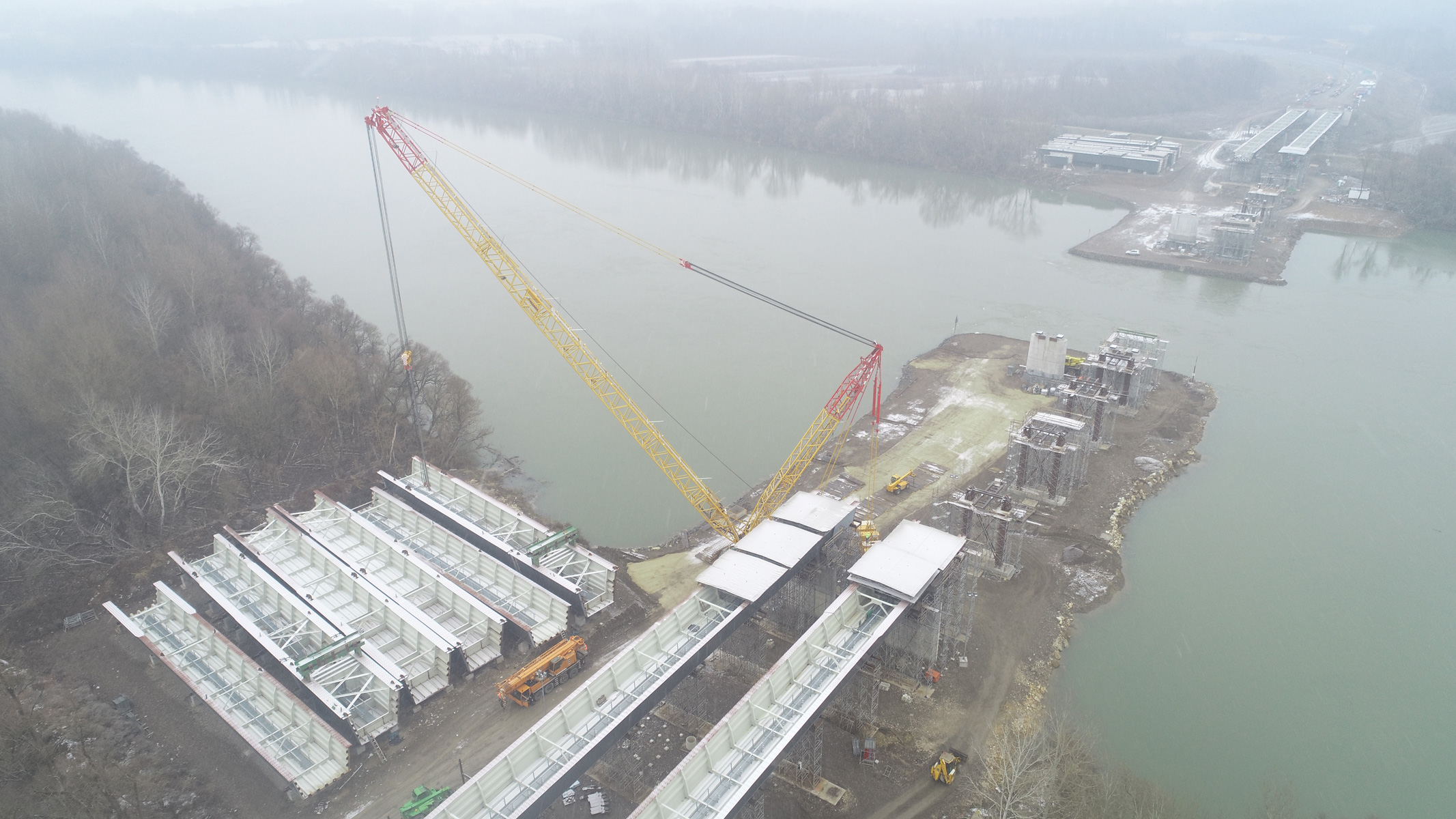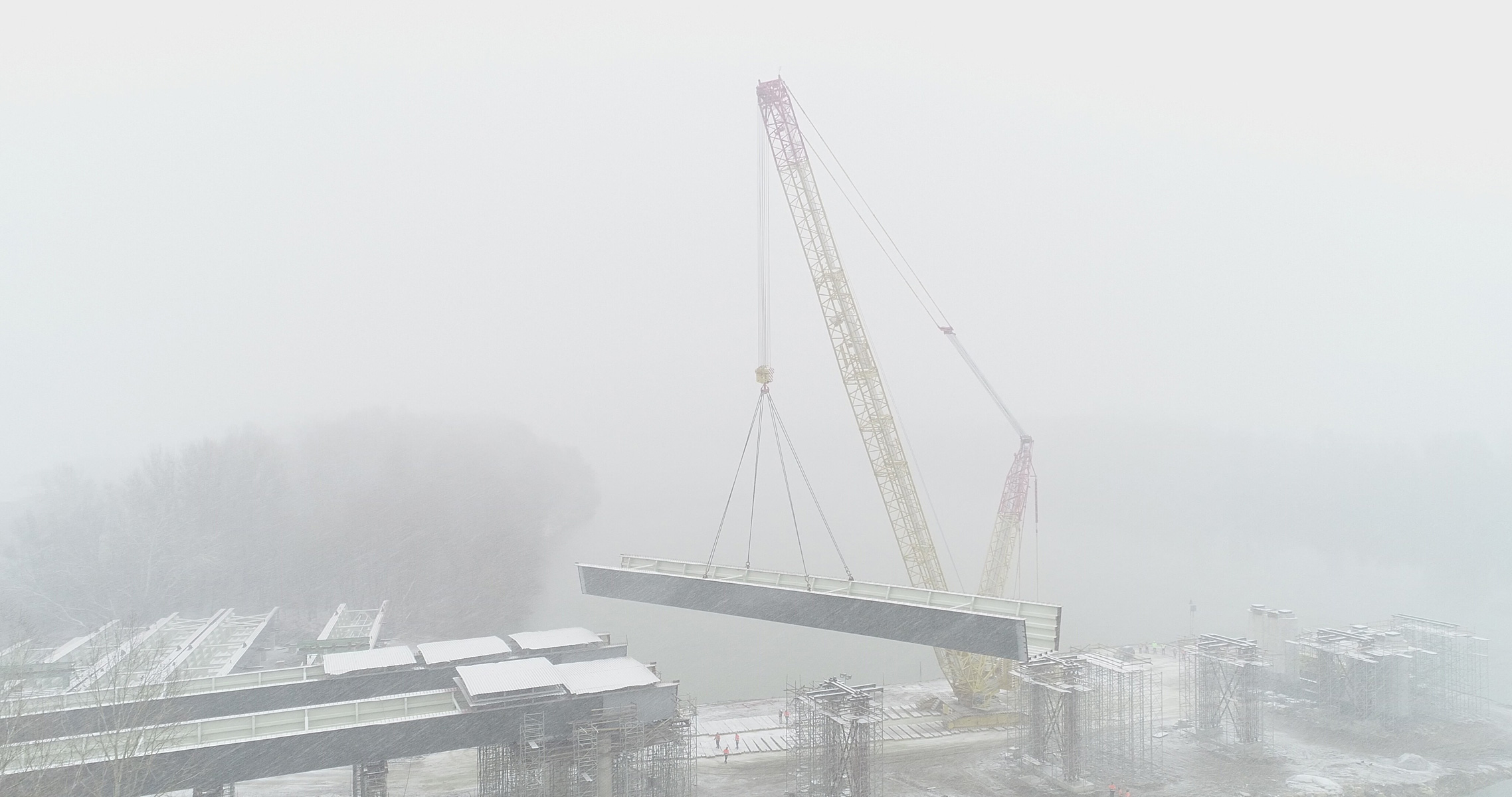A daru feladata csupán az emeléssel nem ér véget. A lánctalpas daru a hídelemeket a helyükre emeli és egy fél napig még akár a levegőben tartja, hogy azokat pontosan be lehessen igazítani. Csak ezt követően engedik le és hegesztik a helyére az adott hídelemet. A nemzetközi csapat minden munkafolyamatnál kiválóan helytállt. A szlovén, horvát és osztrák munkatársak már a tervezési szakaszban is tökéletesen együttműködtek. Ismét bebizonyosodott, hogy a Prangl nemzetközileg elismert szolgáltatásait bárhol igénybe lehet venni.