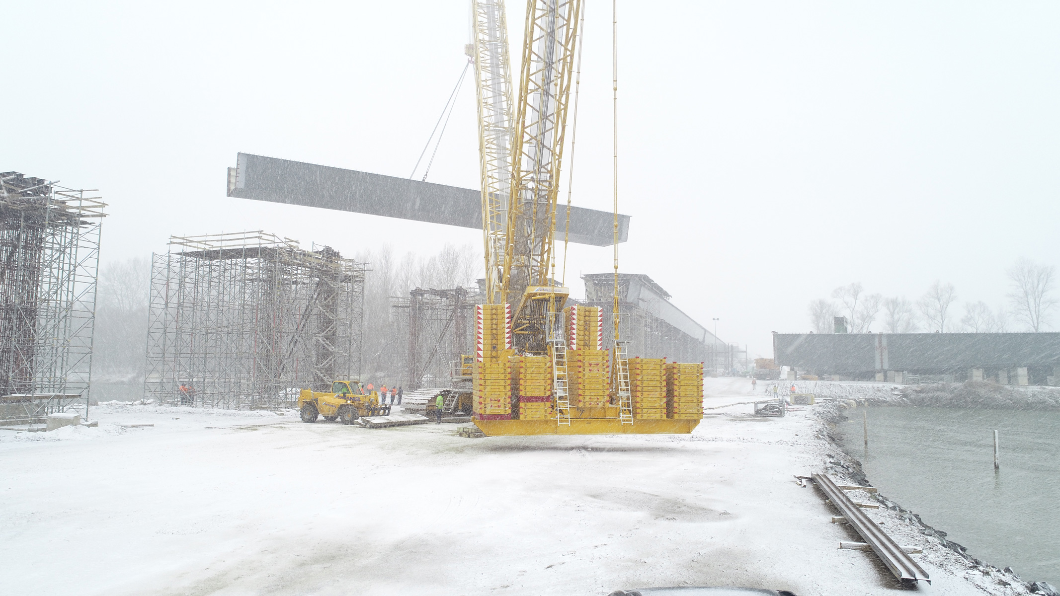 Az előre gyártott hídtartók tárolóhelye alig 100 méterre volt a beépítési ponttól, így a teherrel együtt összesen 1125 tonnát nyomó sárga monstrummal minden esetben meg kellett tenni ezt a távolságot. Ehhez minden hídelem számára egy egyedileg tervezett és legyártott függesztéket kellett összeszerelni. Ezekért a munkálatokért a helyszíni daruzási csapat felelt.