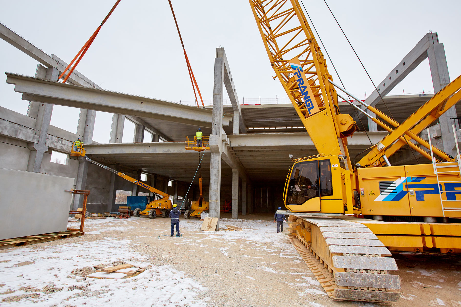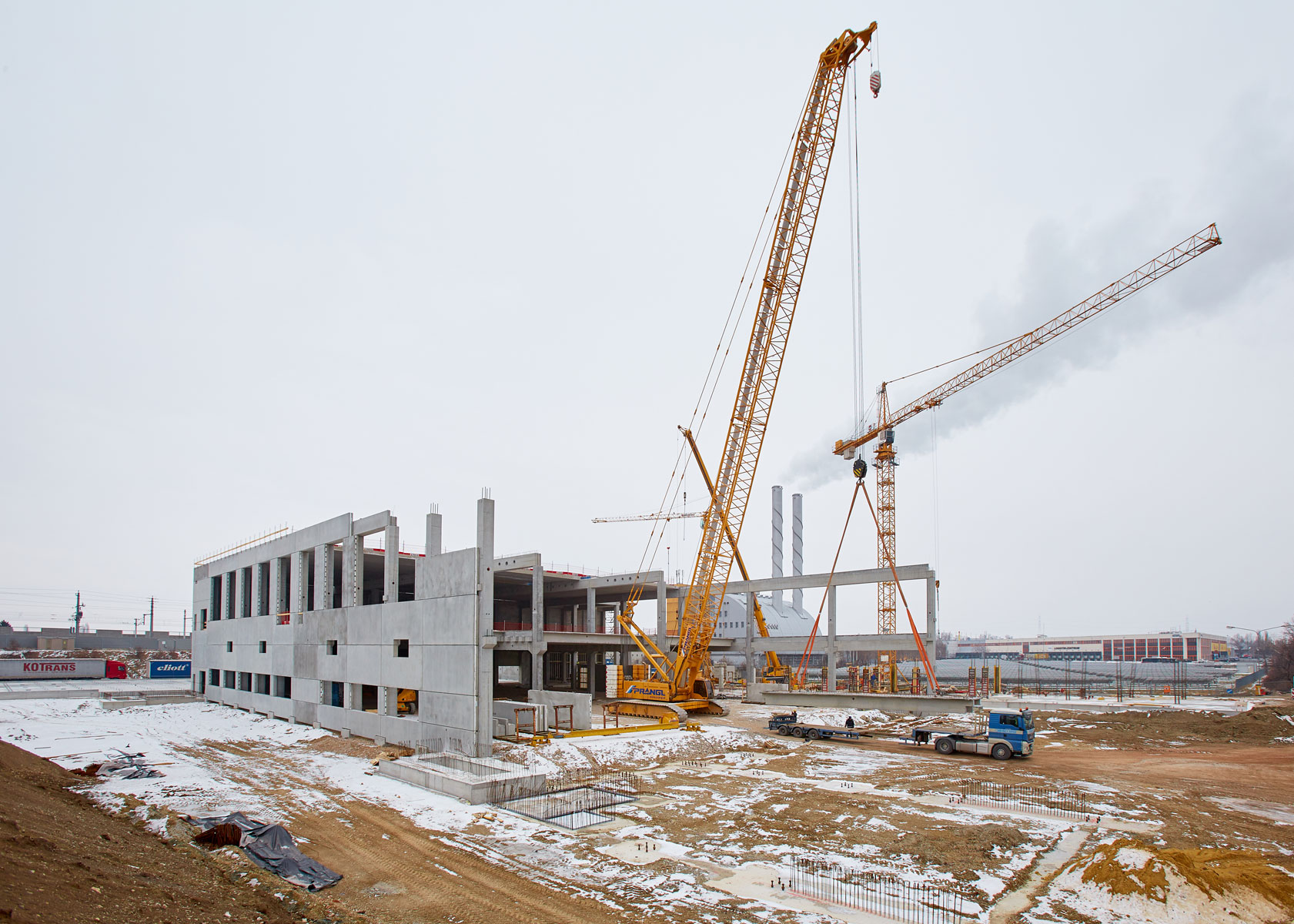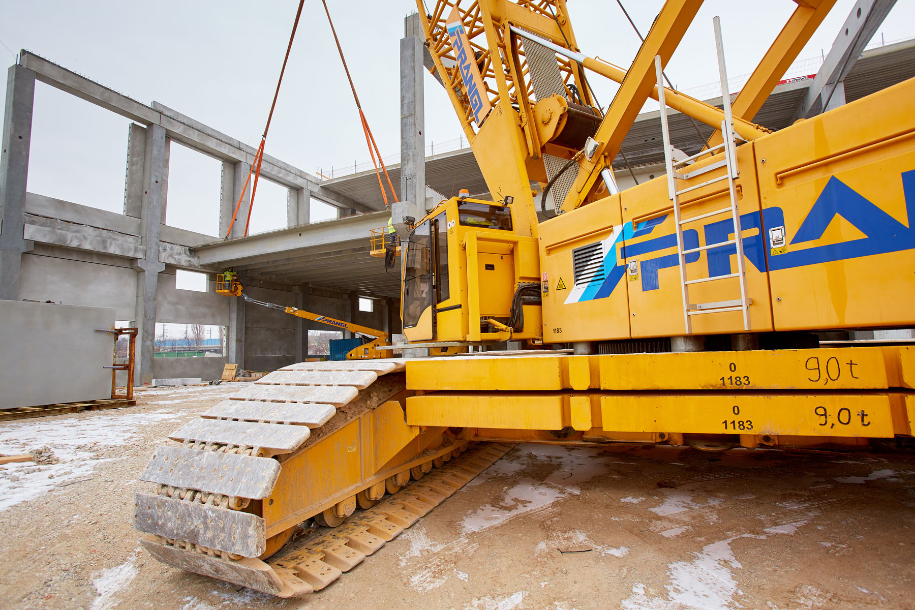 Az egyenként akár 39 tonnás előregyártott betonelemeket egy 280 tonnás lánctalpas daru emelte be, míg a falakat és a lépcsőházakat egy 100, ill. 130 tonnás teleszkópos daru emelte a helyükre. Ezenkívül még két 21 méteres, teleszkópos szerelőkosarat is használtunk. A több szakterületet érintő projektek esetén különösen fontos, hogy legyen kapcsolattartó a helyszínen. Az építkezés közelségének és a fővállalkozó általános rálátásának köszönhetően minden munkához mindig a megfelelő gép állt rendelkezésre. Így ebben az esetben is bevált a „mindent egy kézből” elv.