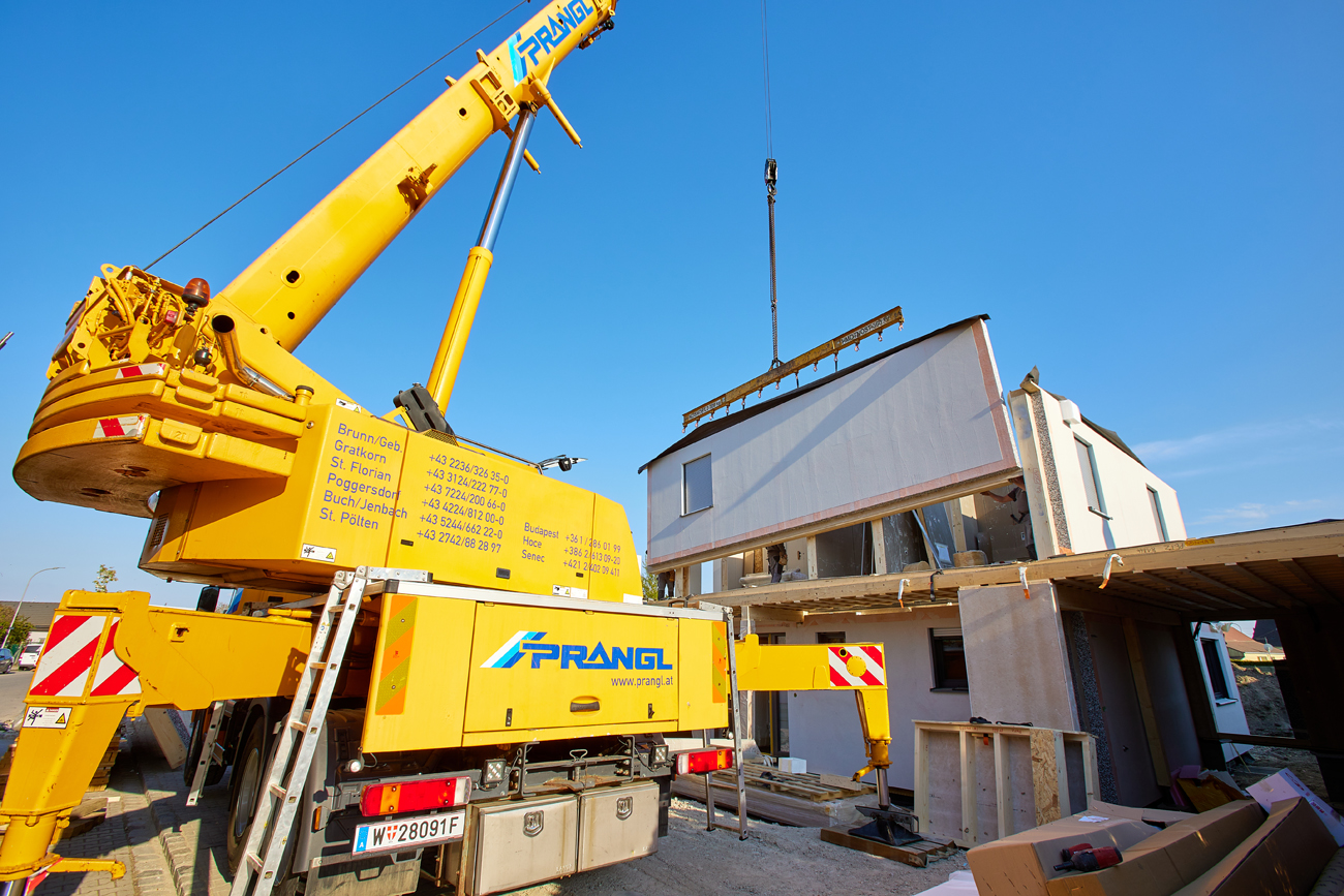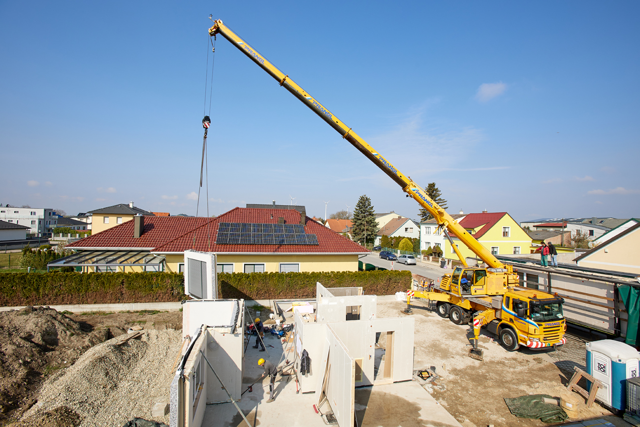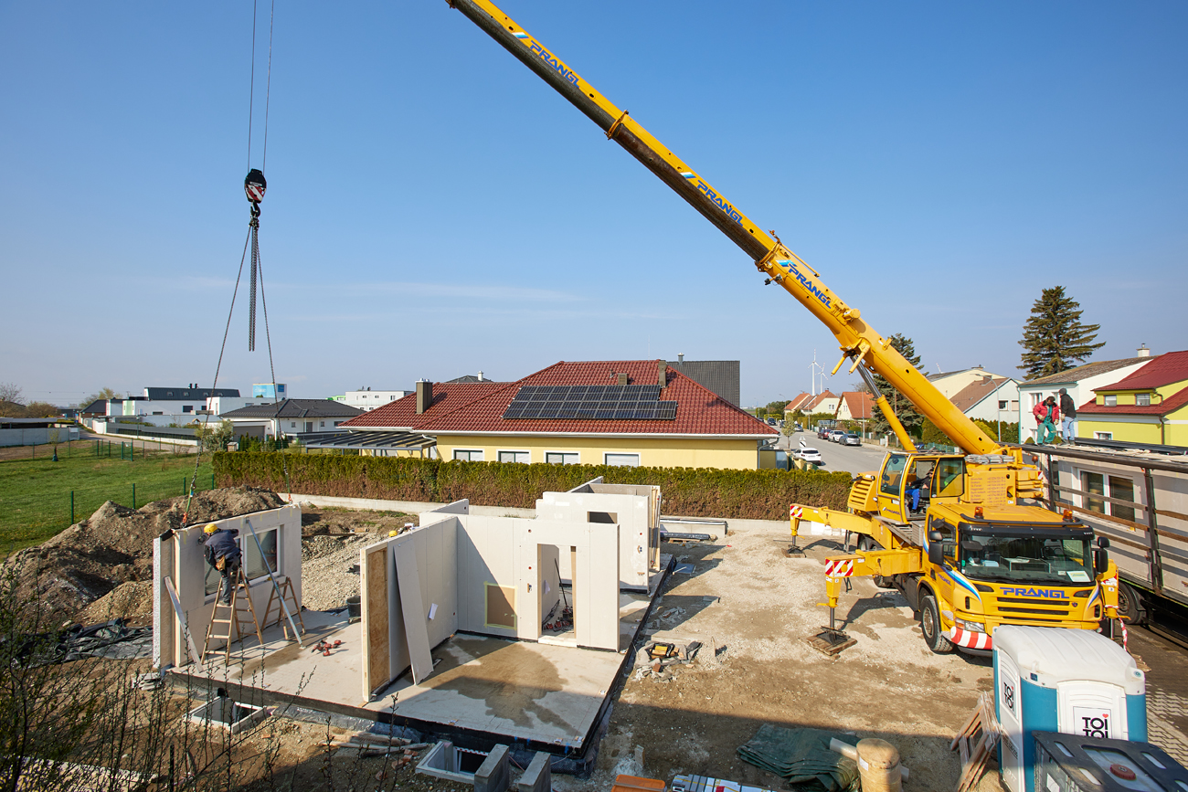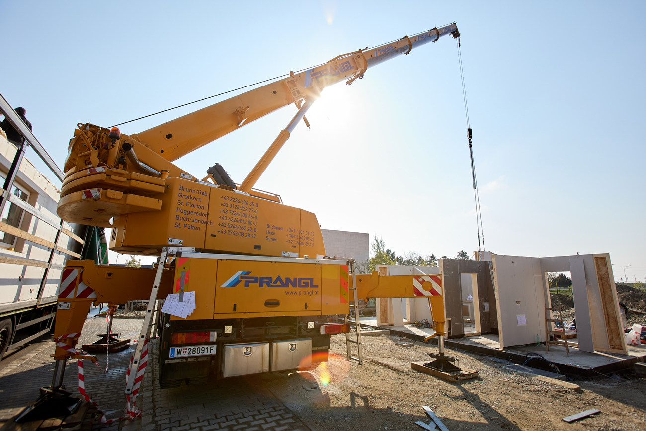 Már a kezdetektől fogva világos volt, hogy itt nem a szokásos összeszerelés vár a Prangl csapatára. Először is mindent tökéletesen elő kellett készíteni ehhez a különösen bonyolult házhoz, hogy a szoros ütemtervet tartani lehessen. Minden szállítmánynak a megfelelő sorrendben kellett érkeznie, a szerelőknek pedig mindent elő kellett készíteniük. Az építkezés egy előre kidolgozott séma szerint zajlott, amelyet mindenkinek be kellett tartania. A Prangl szakemberei egy 35 tonnás mobil darut választottak az előregyártott külső és belső falak, valamint a tető felállításához.