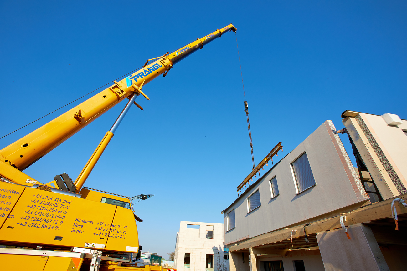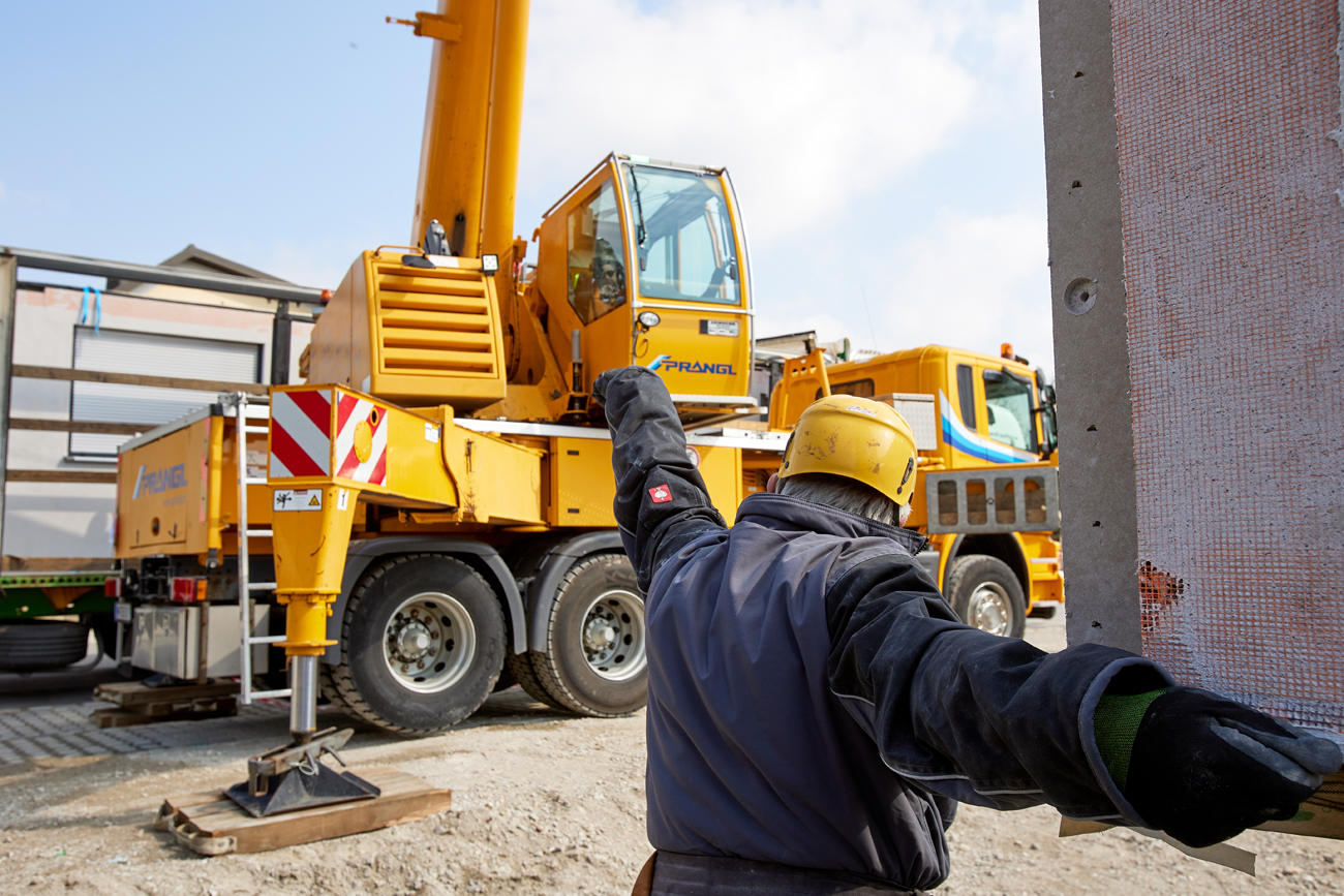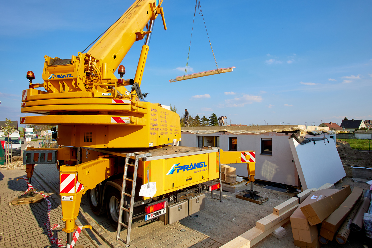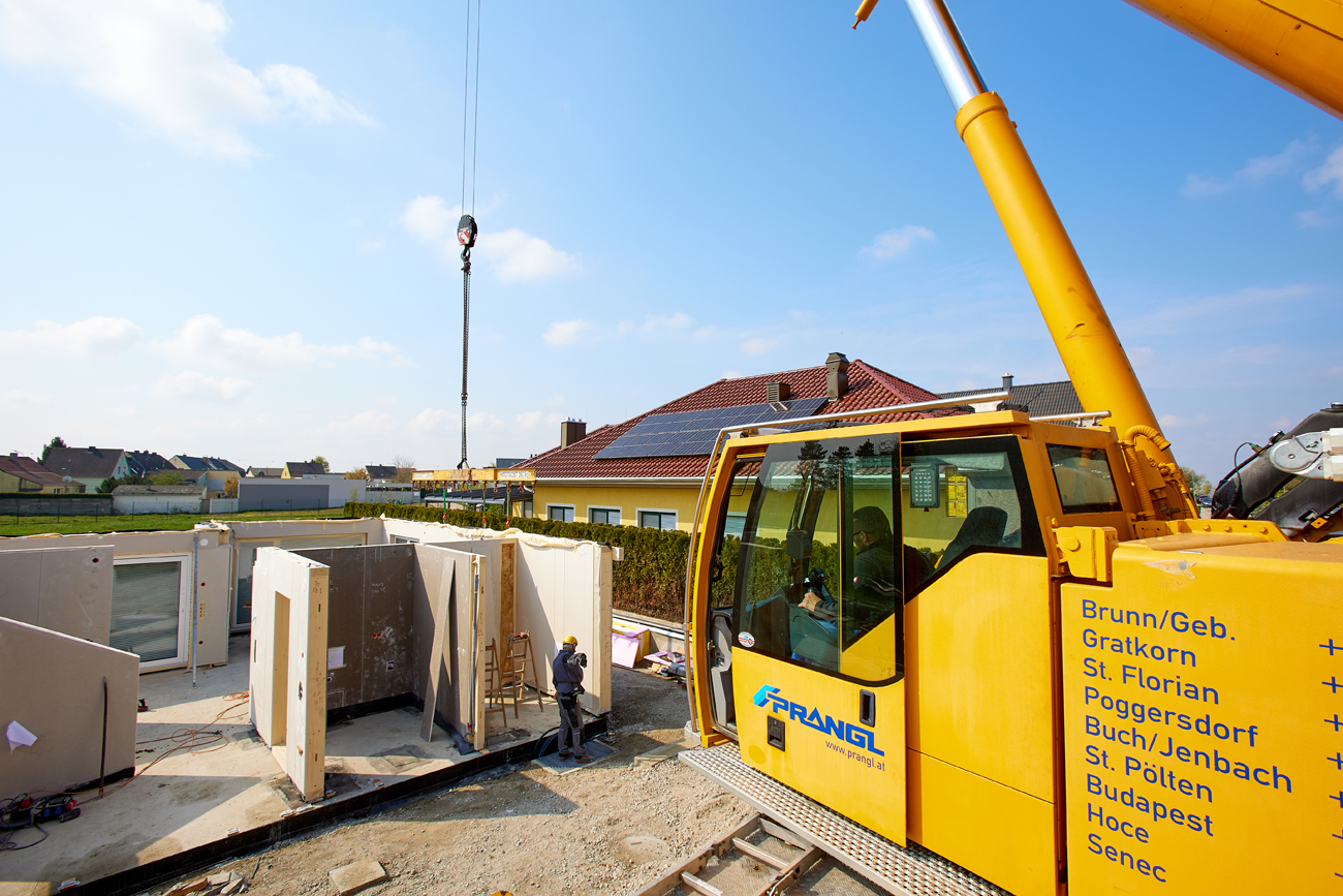 Már a kezdetektől fogva világos volt, hogy itt nem a szokásos összeszerelés vár a Prangl csapatára. Először is mindent tökéletesen elő kellett készíteni ehhez a különösen bonyolult házhoz, hogy a szoros ütemtervet tartani lehessen. Minden szállítmánynak a megfelelő sorrendben kellett érkeznie, a szerelőknek pedig mindent elő kellett készíteniük. Az építkezés egy előre kidolgozott séma szerint zajlott, amelyet mindenkinek be kellett tartania. A Prangl szakemberei egy 35 tonnás mobil darut választottak az előregyártott külső és belső falak, valamint a tető felállításához.