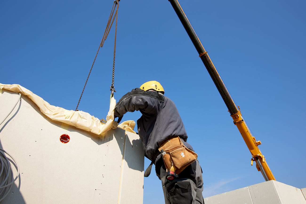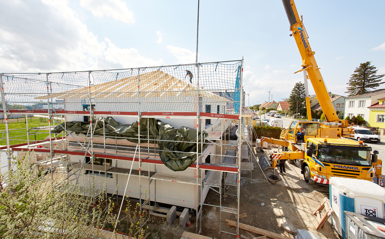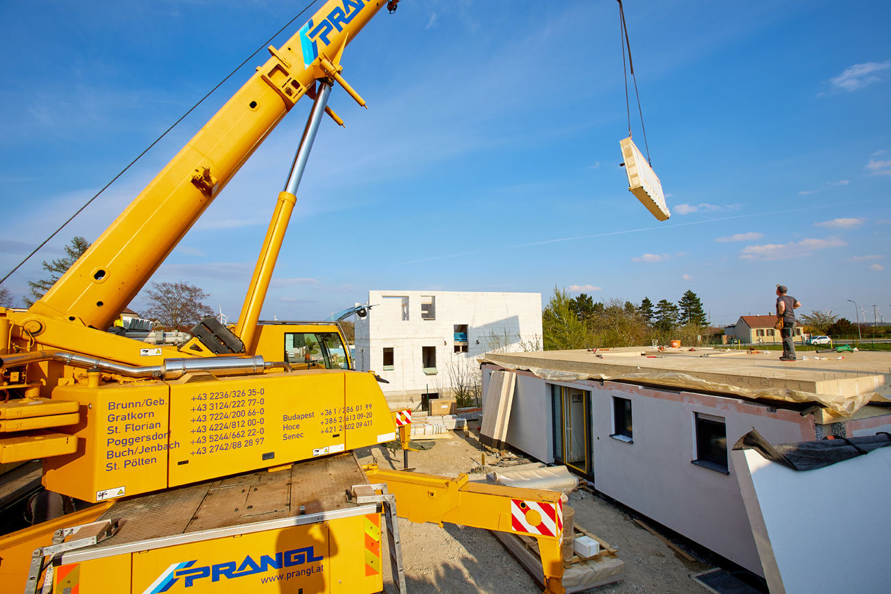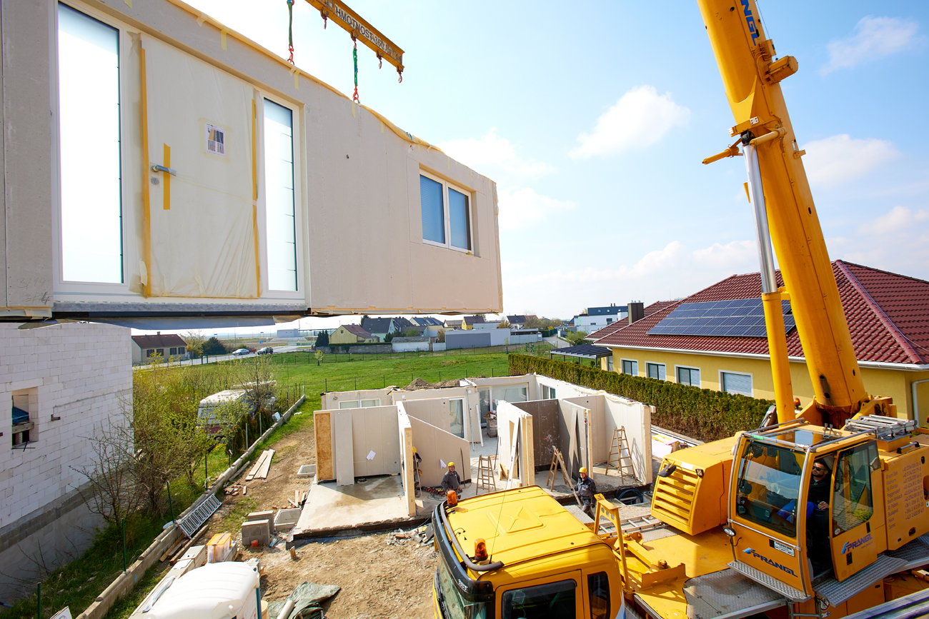 Már a kezdetektől fogva világos volt, hogy itt nem a szokásos összeszerelés vár a Prangl csapatára. Először is mindent tökéletesen elő kellett készíteni ehhez a különösen bonyolult házhoz, hogy a szoros ütemtervet tartani lehessen. Minden szállítmánynak a megfelelő sorrendben kellett érkeznie, a szerelőknek pedig mindent elő kellett készíteniük. Az építkezés egy előre kidolgozott séma szerint zajlott, amelyet mindenkinek be kellett tartania. A Prangl szakemberei egy 35 tonnás mobil darut választottak az előregyártott külső és belső falak, valamint a tető felállításához.