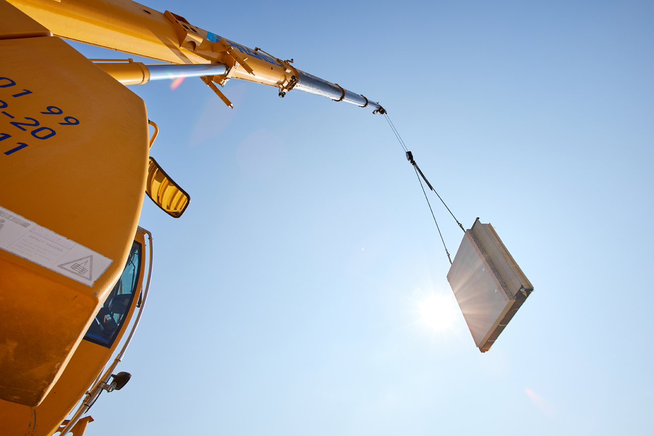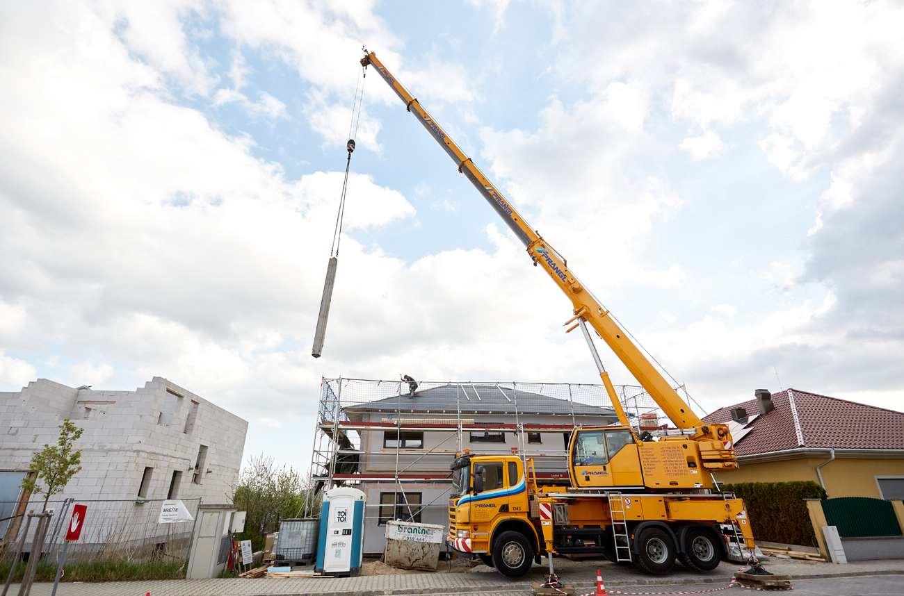 Ez a daru egyértelmű előnyökkel rendelkezik más berendezésekkel szemben: jól manőverezhető és hatékony, mivel teljes szerelékével együtt könnyedén eljut bármelyik építkezési helyszínre s ott egyből használatra készen áll. A 30 méteres főgém és segédgémmel a 45 méteres maximális gémhosszúság optimális megoldást jelent egy ilyen ház építéséhez. Így az új otthon felépítése tökéletesen sikerült: az előregyártott, akár 3 tonnás tömegű elemeket egyenként emelték a helyükre legfeljebb 16 méteres kinyúlással, hogy a szeszerelők helyükre igazítsák és összecsavarozzák azokat.