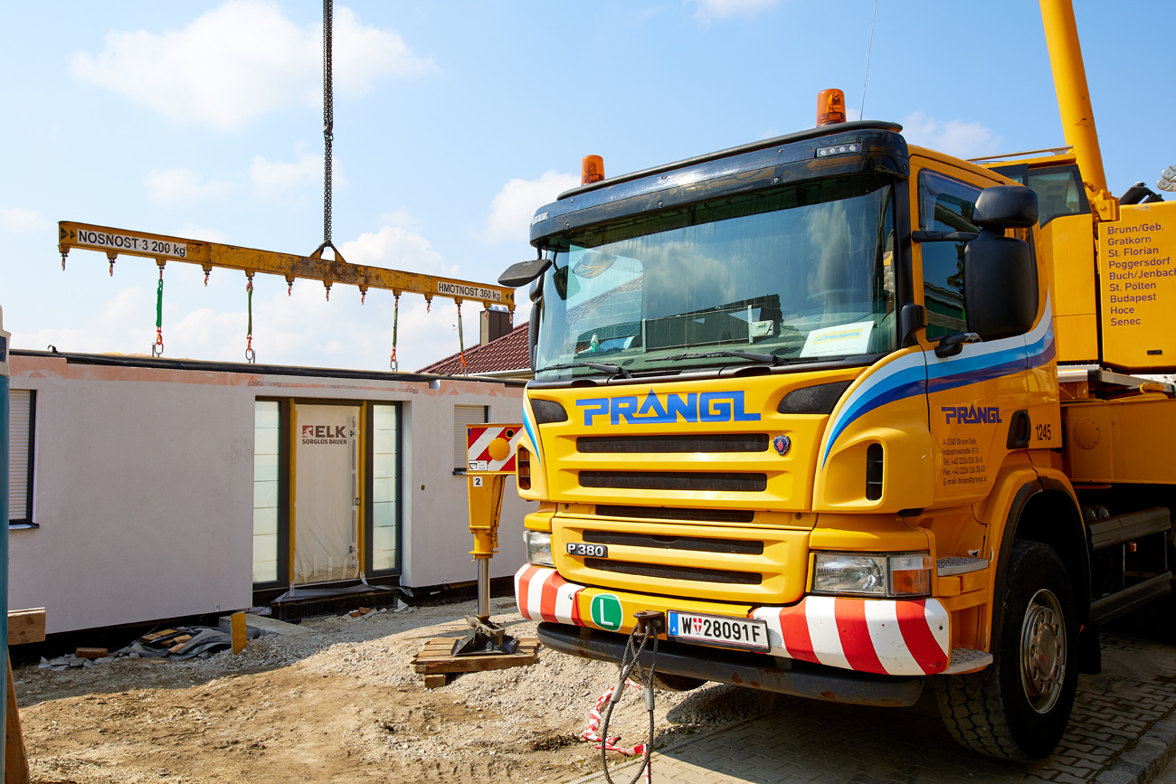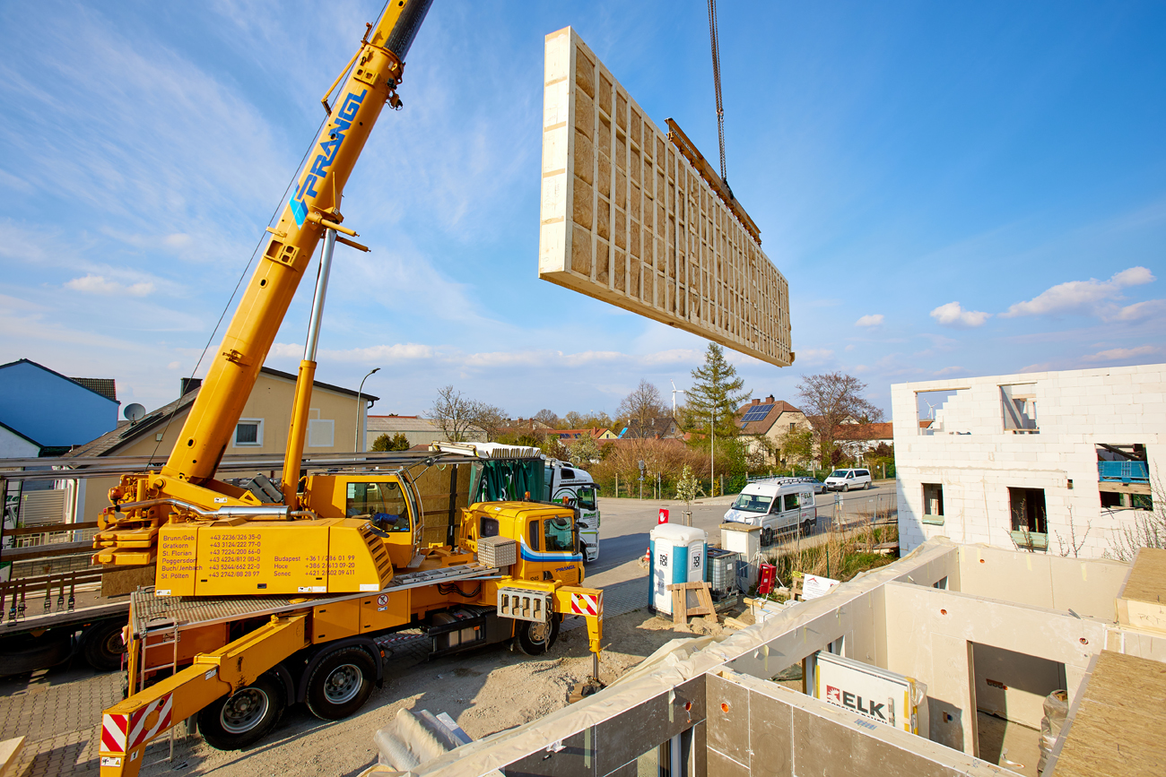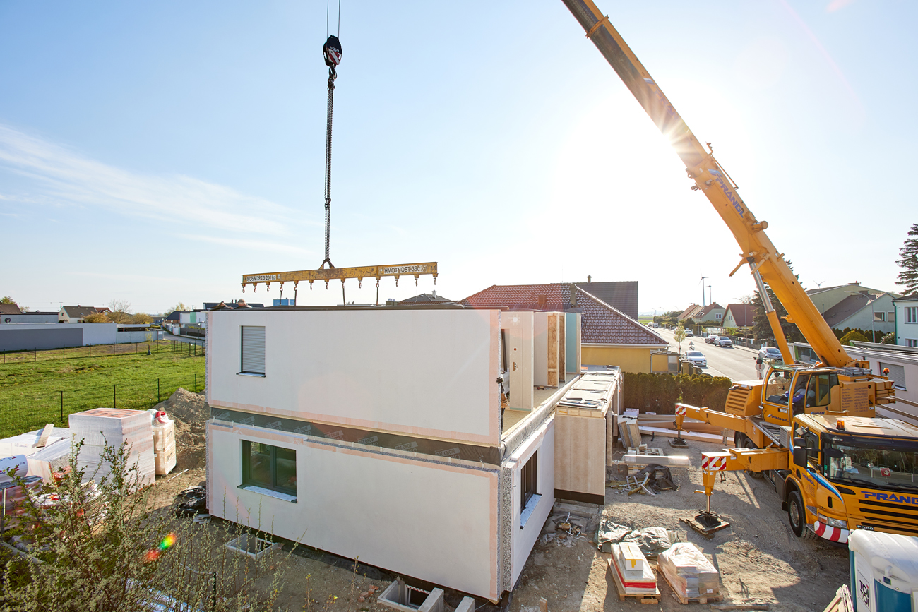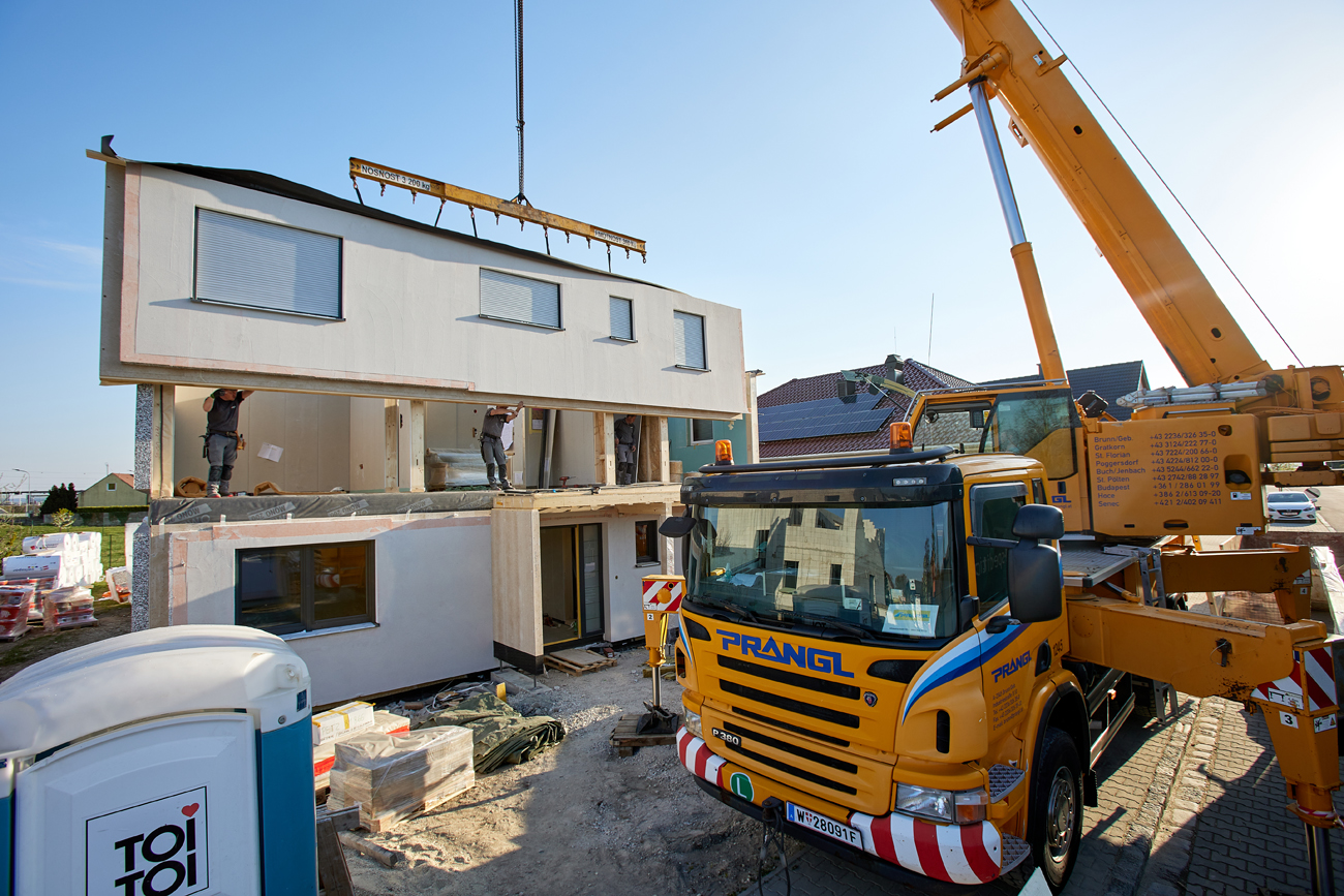 A darulezelő, az építésvezetés és a szerelők rendkívül jó együttműködésének köszönhetően a ház gyorsan és késedelem nélkül épült. A tető is óramű pontossággal került fel. Az egész folyamatban nagy szerepet játszott a Prangl szakembereinek nagy tapasztalata az előregyártott házak terén. Meggyőztük az ügyfelet nyugalmunkkal, áttekintőképességünkkel és a házrészek beállításának nagyfokú pontosságával. Becsületbeli ügy volt, hogy a menetrendet pontosan betartsák. Így az új otthon hamarosan készen áll a beköltözésre.