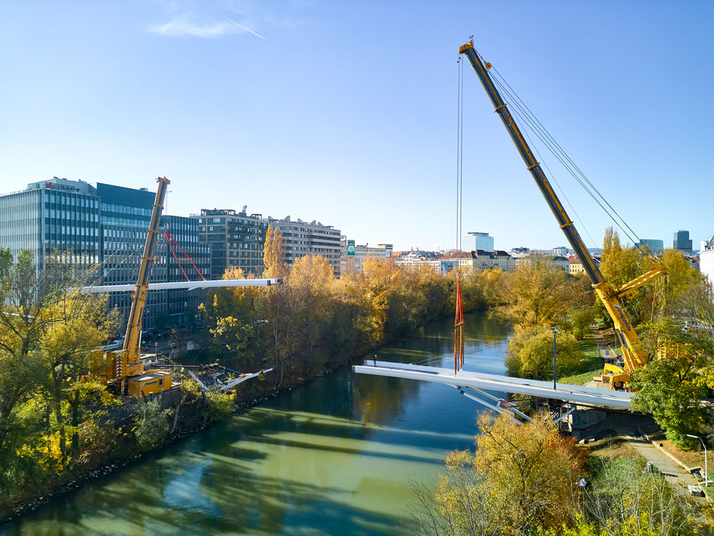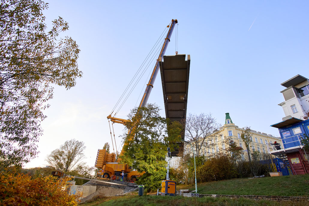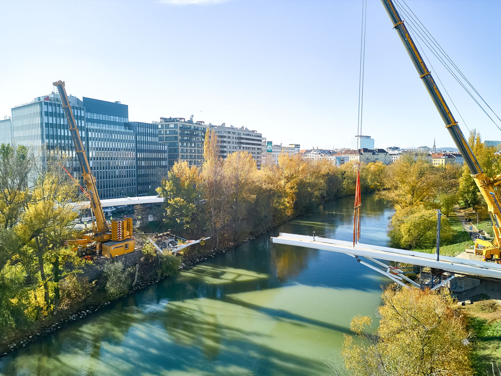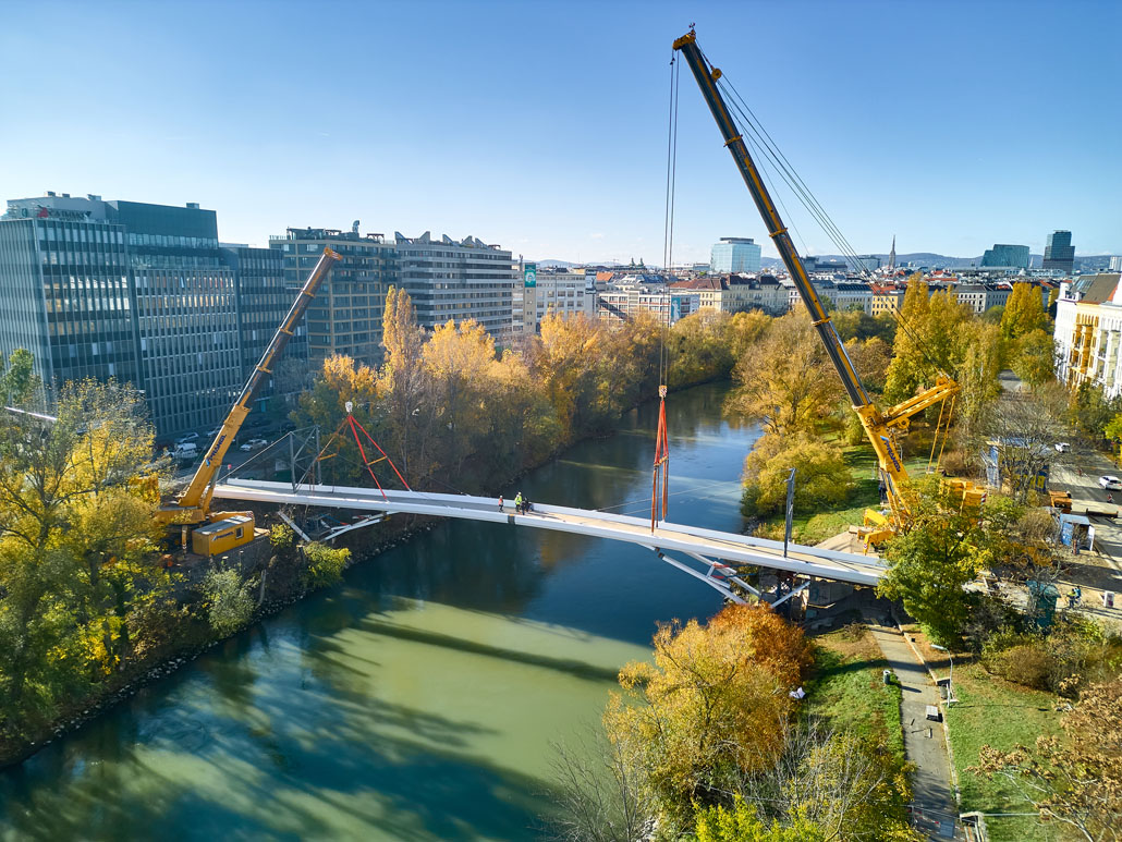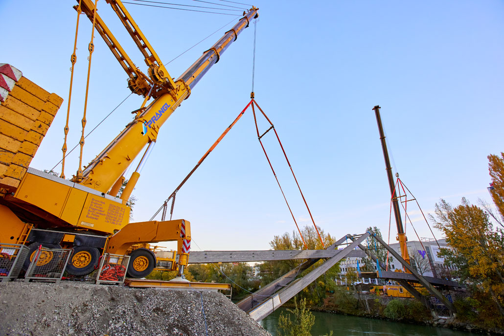 Néhány nappal később a Prangl az új acél gyaloghidat is a helyére emelte. Mivel az új szerkezet mindössze két részből állt (mindkettő 51 méter hosszú, 5,2 méter széles és 70 tonna tömegű), a helyszínen lévő nagy daruk mindössze két emeléssel összeszerelték a gyaloghidat. Miután az első részt a helyére emelték, azt véglegesen a parthoz rögzítették. Ezt követte a második rész a túloldalról. Végül a két részt középen összehegesztették. A munka jelentős kihívásai ellenére a Prangl csapata ismét könnyedén teljesítette a feladatot.