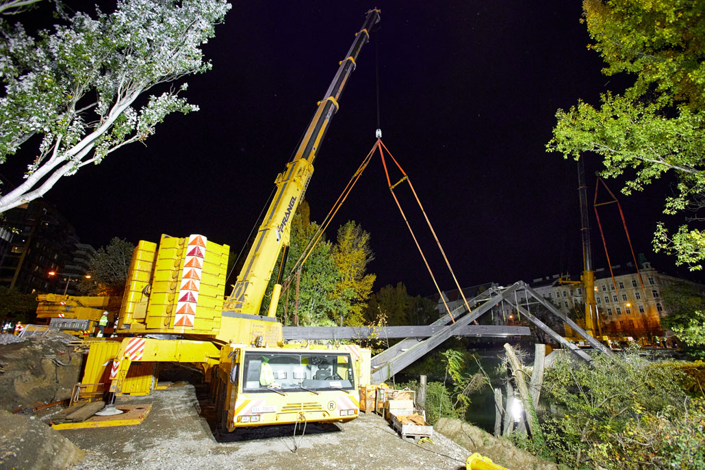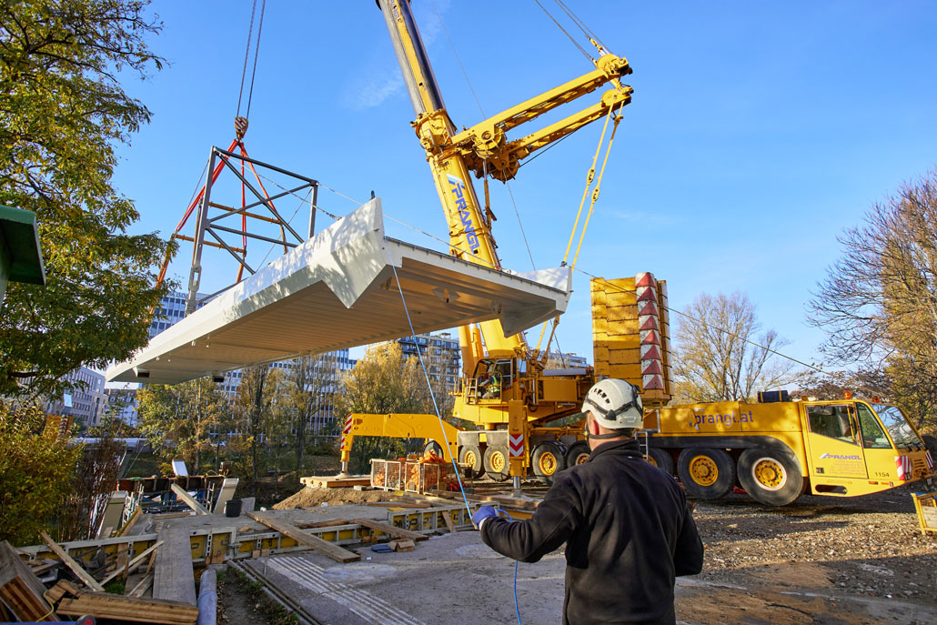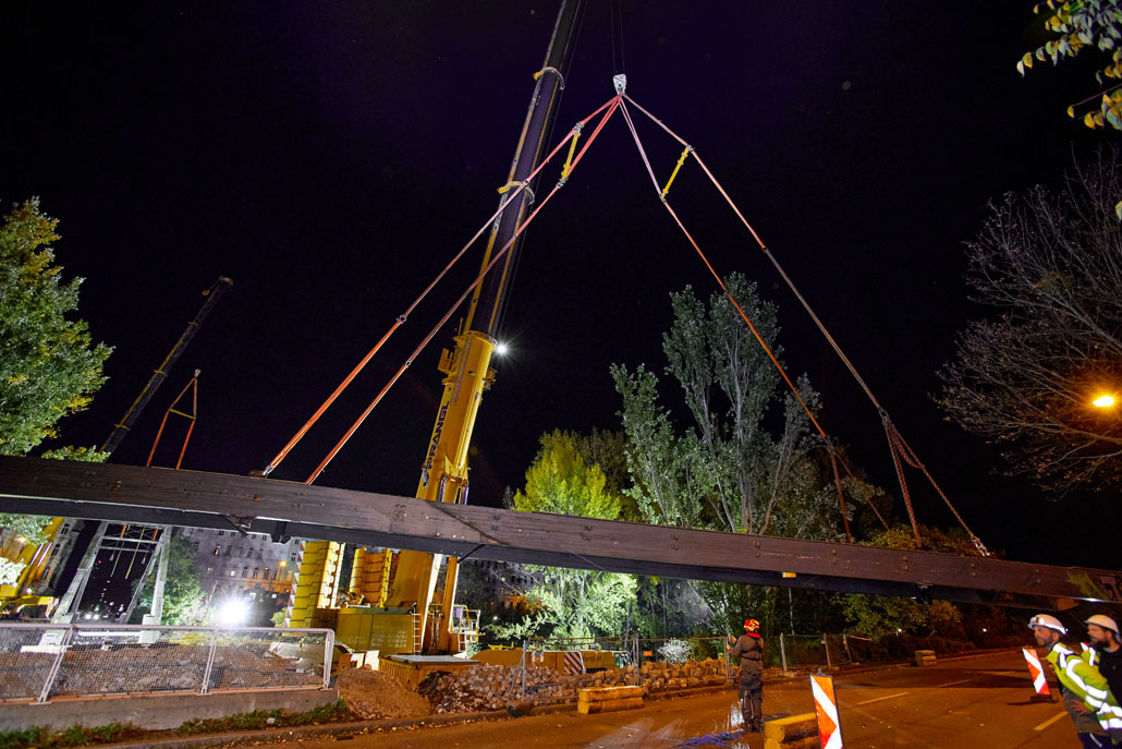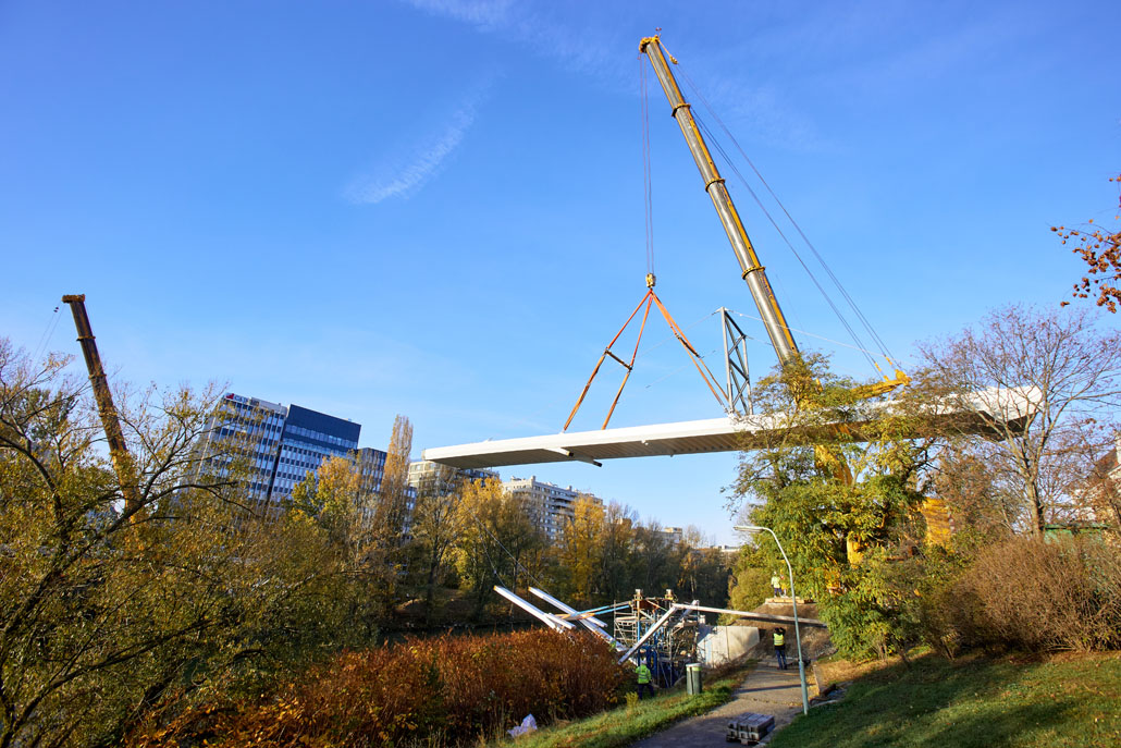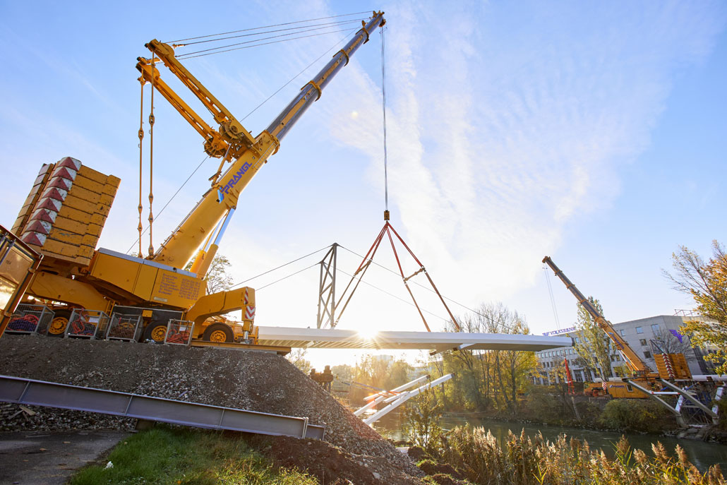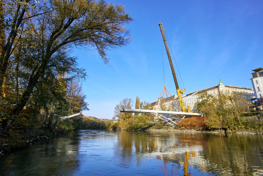 Néhány nappal később a Prangl az új acél gyaloghidat is a helyére emelte. Mivel az új szerkezet mindössze két részből állt (mindkettő 51 méter hosszú, 5,2 méter széles és 70 tonna tömegű), a helyszínen lévő nagy daruk mindössze két emeléssel összeszerelték a gyaloghidat. Miután az első részt a helyére emelték, azt véglegesen a parthoz rögzítették. Ezt követte a második rész a túloldalról. Végül a két részt középen összehegesztették. A munka jelentős kihívásai ellenére a Prangl csapata ismét könnyedén teljesítette a feladatot.