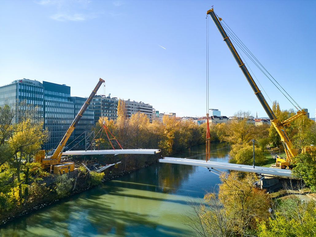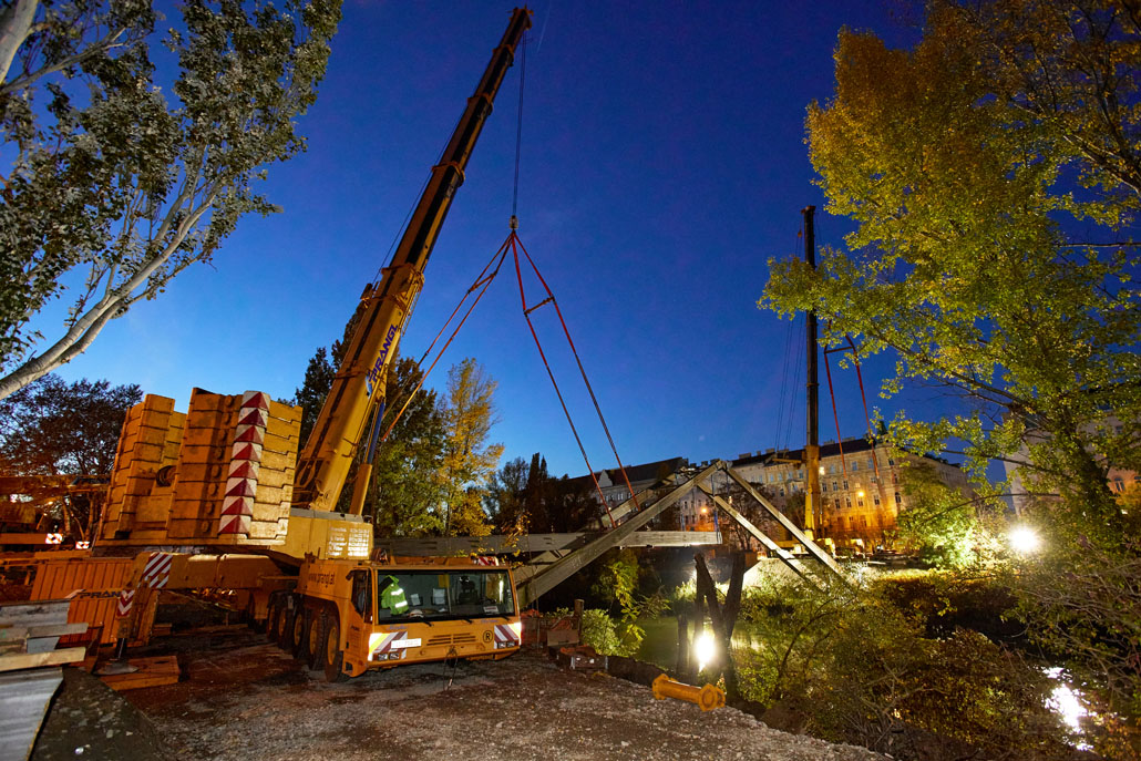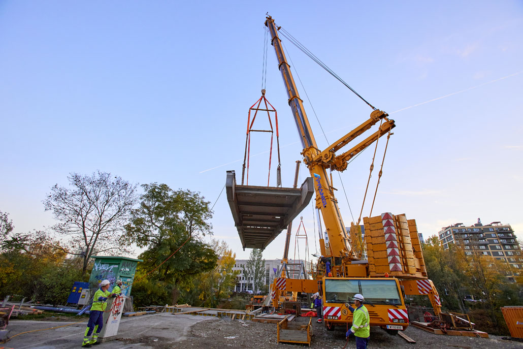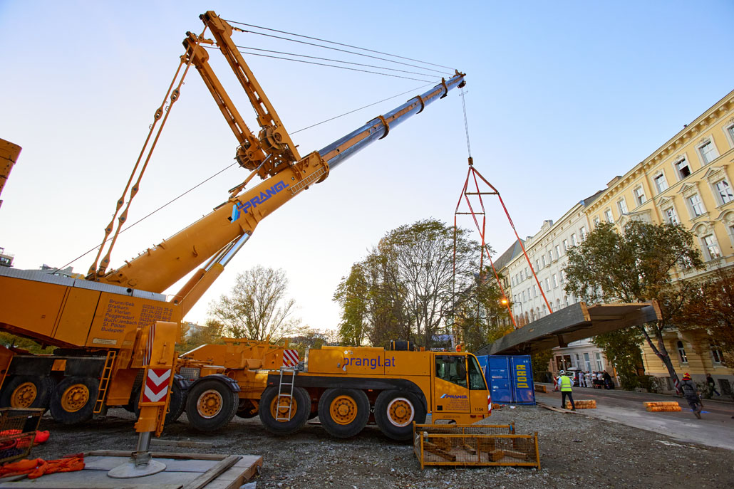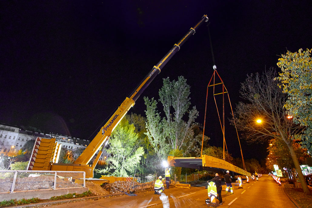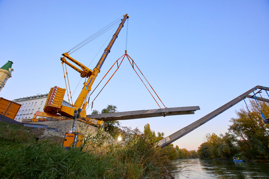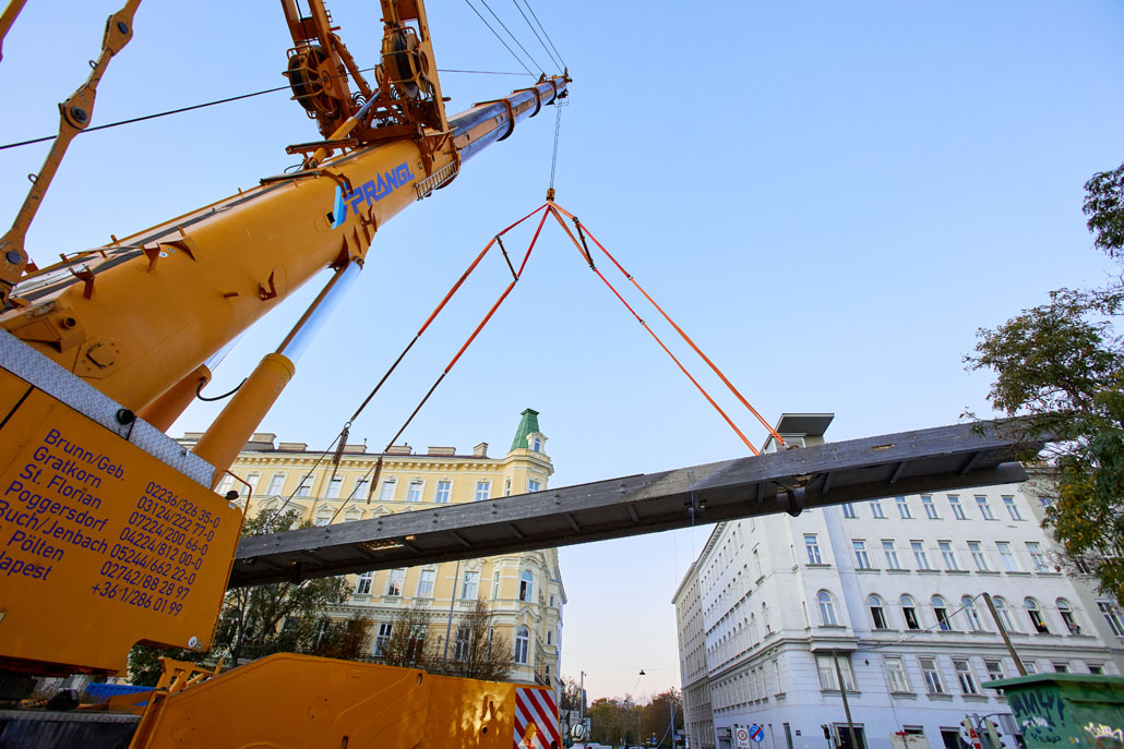 Egy feülvizsgálat után kiderült, hogy a Bécs 2. és 3. kerületét összekötő Erdberg steg gyaloghíd faszerkezete az időjárás, a hőmérséklet-ingadozás és a nedvesség miatt károsodott. Bécs városa ezért úgy döntött, hogy elbontja a régi gyalogoshidat, és egy újjal helyettesíti. A Pranglt bízták meg a kihívást jelentő emelési munkálatokkal.