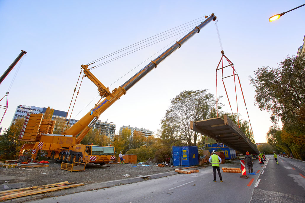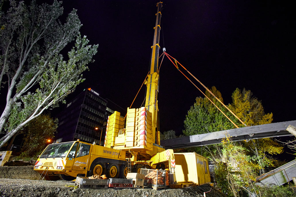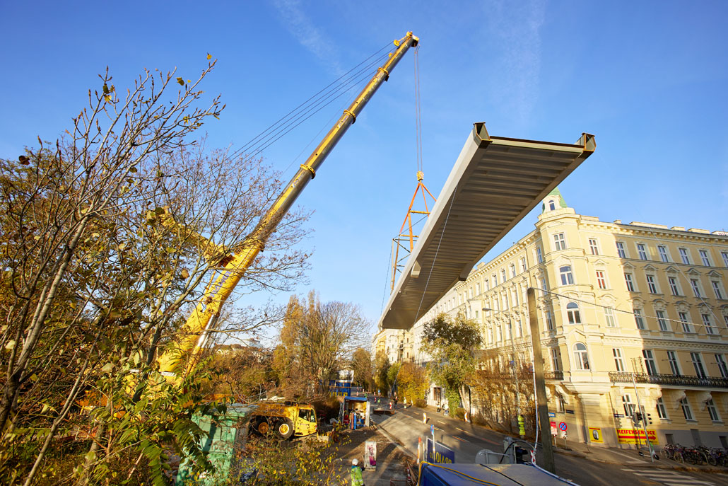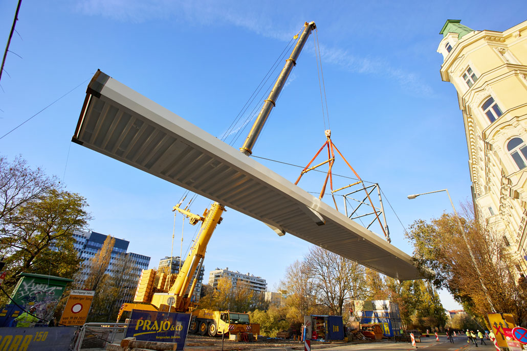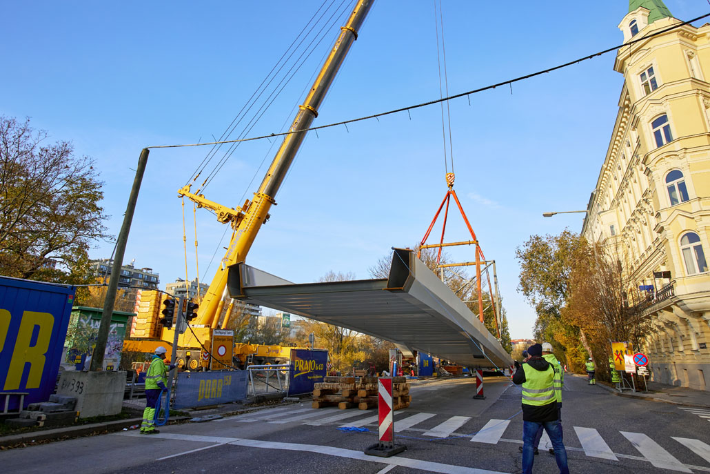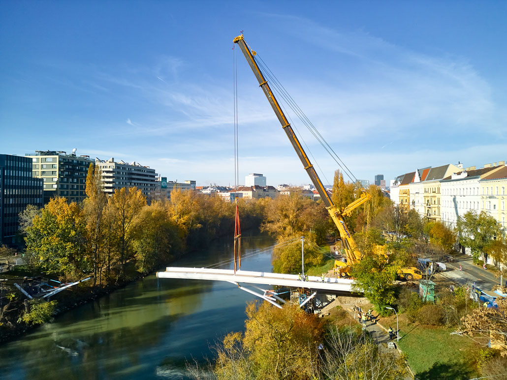 Egy feülvizsgálat után kiderült, hogy a Bécs 2. és 3. kerületét összekötő Erdberg steg gyaloghíd faszerkezete az időjárás, a hőmérséklet-ingadozás és a nedvesség miatt károsodott. Bécs városa ezért úgy döntött, hogy elbontja a régi gyalogoshidat, és egy újjal helyettesíti. A Pranglt bízták meg a kihívást jelentő emelési munkálatokkal.