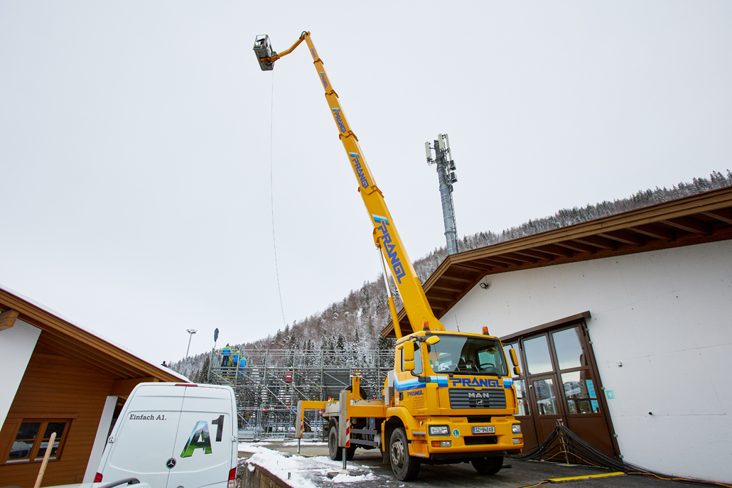 Egy 46 méteres tehergépkocsis szerelőkosár segítségével a célvonal a tévénézők milliói számára vált láthatóvá. A nagy platformnak köszönhetően ez a szerelőkosár különösen megfelelő volt arra, hogy az ORF teljes felszerelését stabilan a „felhők között” helyezze el. A szerelőkosáron lévő csuklós kar segítségével különböző magasságok és helyzetek voltak elérhetők. Ez a rugalmasság hatalmas előnyt jelentett a különböző kameraállásokhoz. Prangl ezenkívül egy speciális tartószerkezetet és a nagy tévékamerák számára extra csatlakozást is kínált.