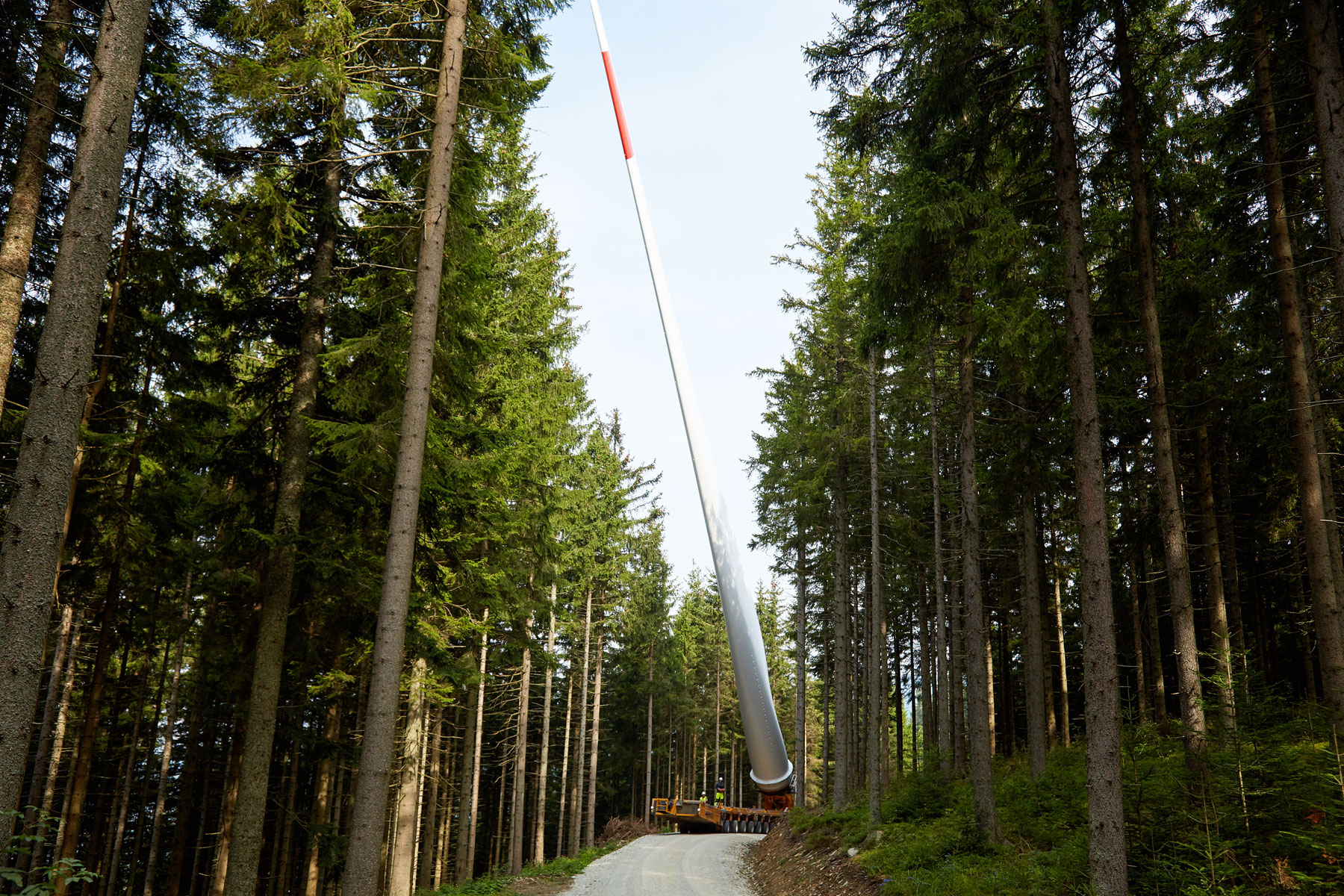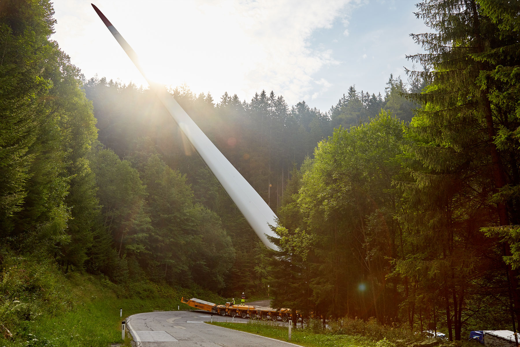 A természet védelmének szempontjából a lapátok szállítására a már bevált lapátszállító berendezést vettük igénybe. Így a 62 méter hosszú rotorlapokat a szűk fordulókban és kanyarokban akár 60°-ban is meg lehetett emelni. Ezáltal a hegyi utakon minimálisra csökkent a plusz intézkedés bevezetésének szükségessége. Ezzel nemcsak a természetet óvtuk meg, de a táj képét sem kellett megváltoztatni, és az üzemeltetőnek is költséget takarítottunk meg. A 16 km-es szakaszon négy órát vett igénybe az út, amely során a legnagyobb koncentrációra volt szükség.
