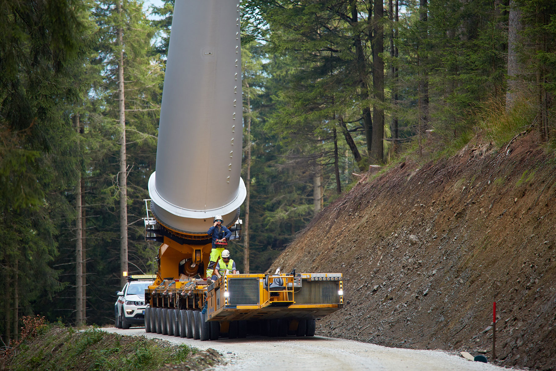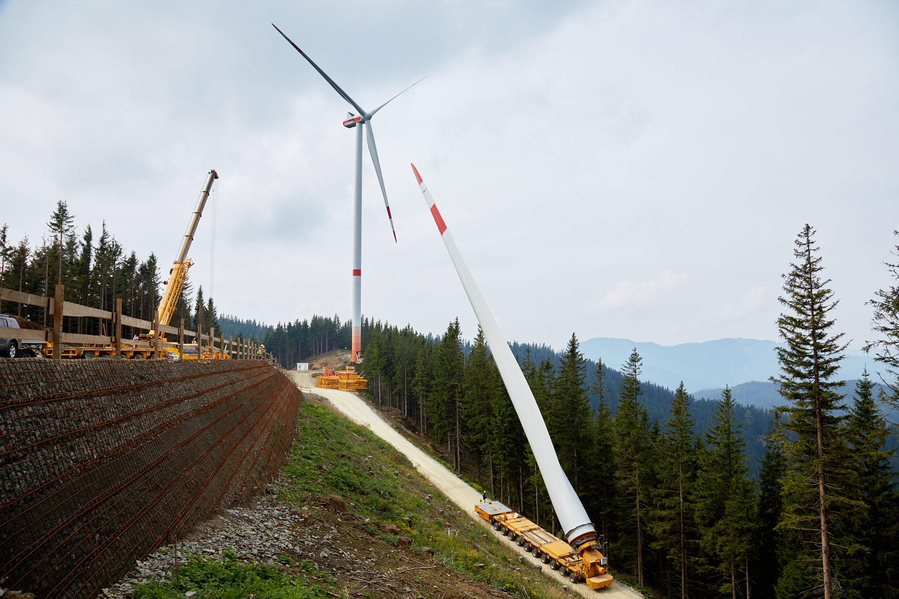 A rendkívül szűk hely miatt csak részben volt lehetséges, hogy a berendezés részeit ideiglenesen a daru felállítási helyén tároljuk. Az egyes alkotóelemeket ezért „just in time” módon kellett leszállítani. Ehhez a Prangl csapat tagjai között alapos logisztikai egyeztetésre volt szükség. A hegyen történő lerakodásra, valamint a szélerőmű alkotóelemeinek beemelésére egy 650 tonnás lánctalpas darut és egy 200 tonnás teleszkópos darut használtunk. A szélerőmű egyéb részeinek szállítására még további szállítóeszközök igénybe vételére volt szükség.