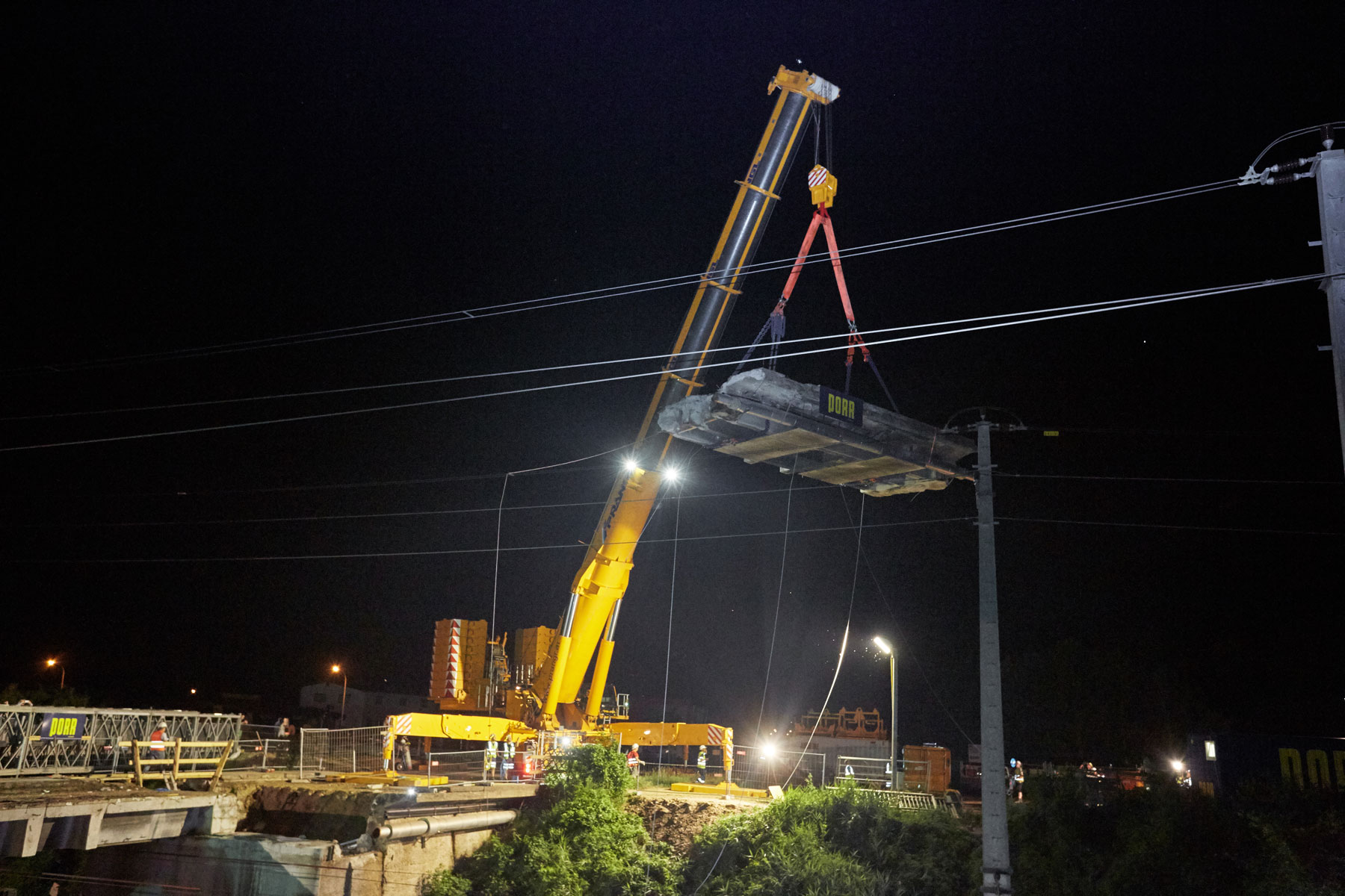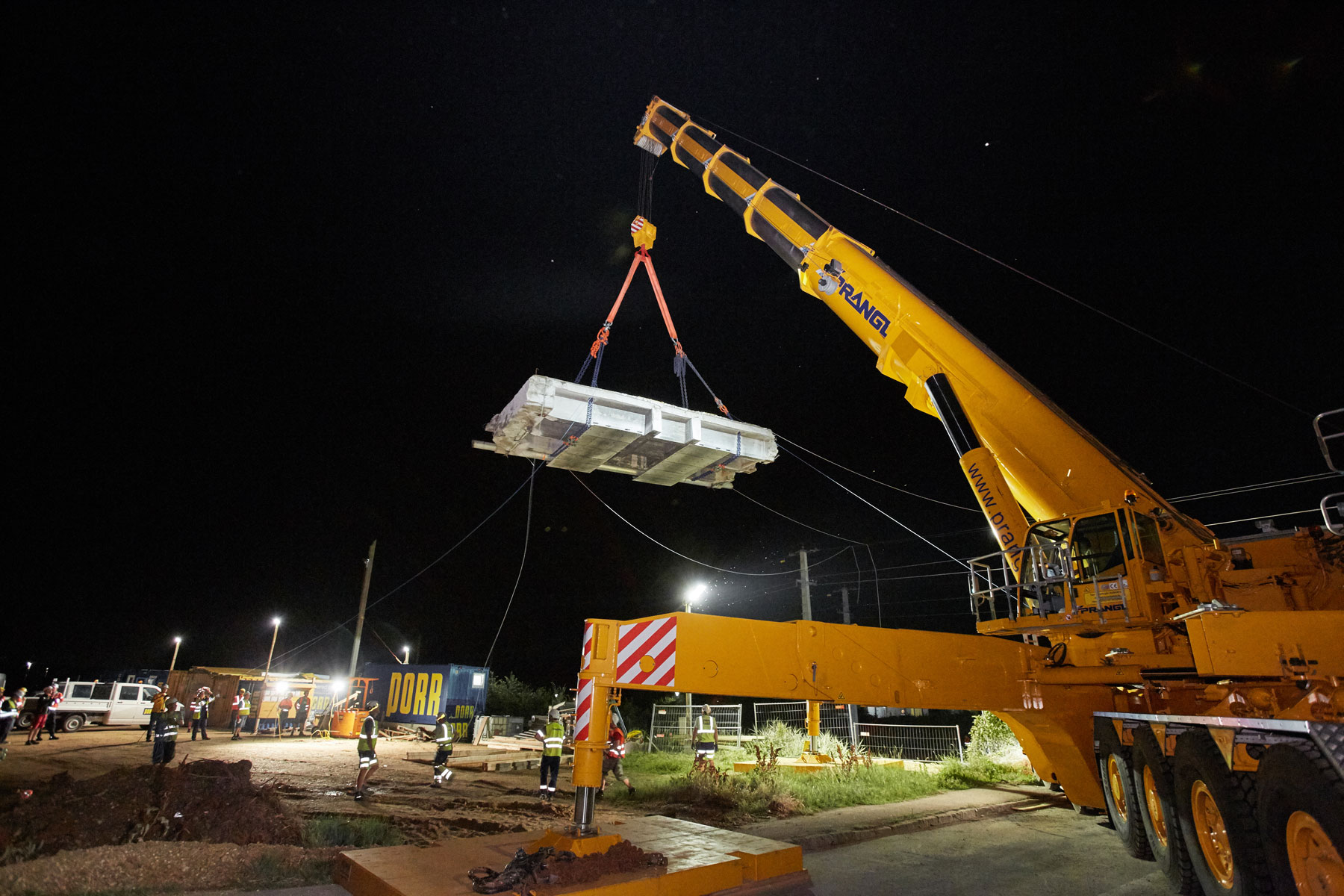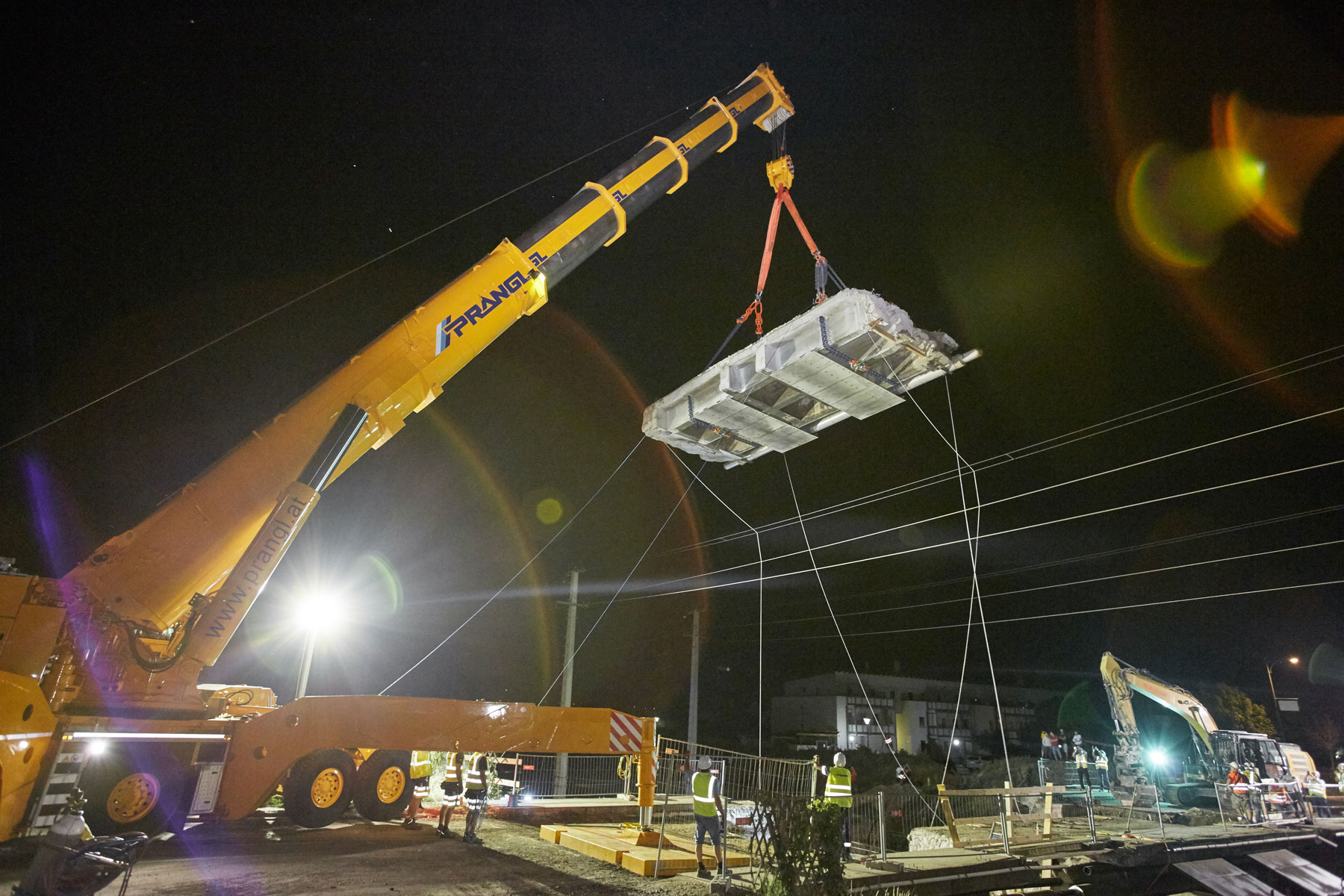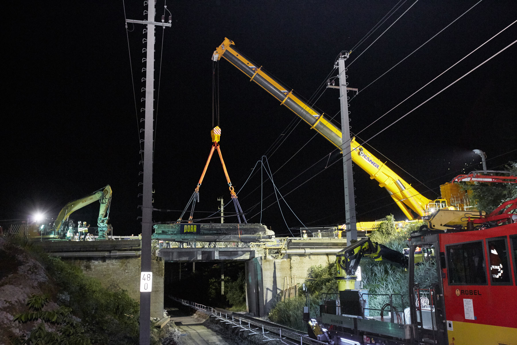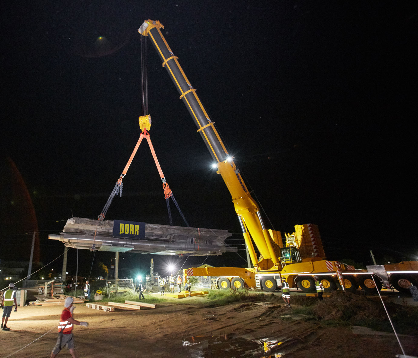 Az egyenként 95 tonnás súly és a darugém 22 méteres sugara miatt Ausztria legerősebb, 1000 tonnás teleszkópos daruja volt a legmegfelelőbb megoldás erre a feladatra. Bármilyen másik darutechnológia hosszabb előkészítési és szétszerelési időt jelentett volna. Az ÖBB szigorúan előírt ütemterve minden perc óriási nyereségnek számított. A teljes munkát este 10 és reggel 5 óra között kellett elvégezni Kizárólag ebben az időintervallumban zárták le a vonalat, és áramtalanították az érintett vezetékeket.