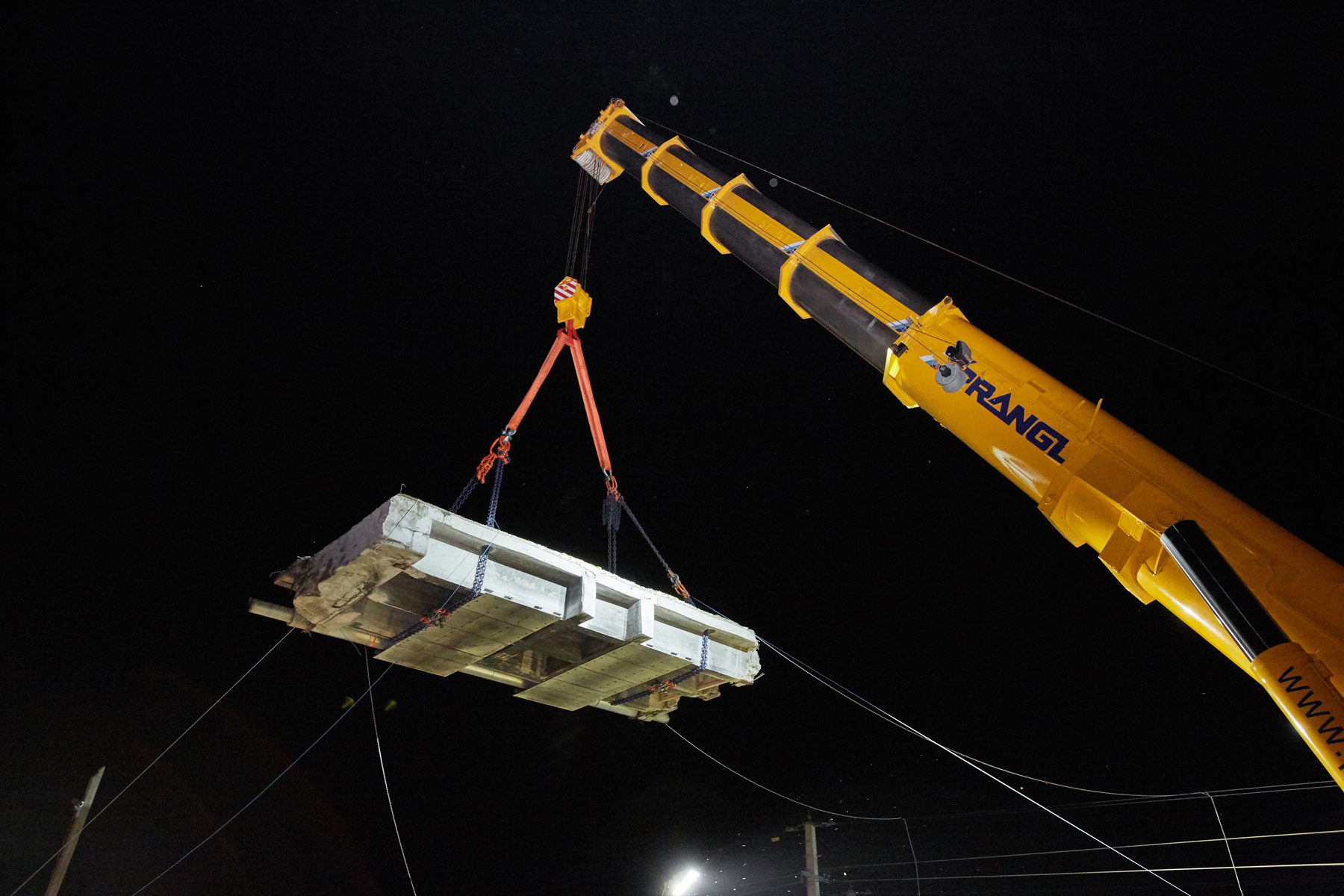 Régi közúti hidat kellett eltávolítani Parndorf közelében az ÖBB (Osztrák Szövetségi Vasutak) keleti szakasza fölött. Pontosan testhez álló munka a Prangl számára! Mivel a súlya miatt másképp nem lehetett volna kivitelezni a munkát, a forgalmi sávot két részre osztották. A hidat furatokkal készítették elő, amely lehetővé tette a rögzítőeszközök elhelyezését.