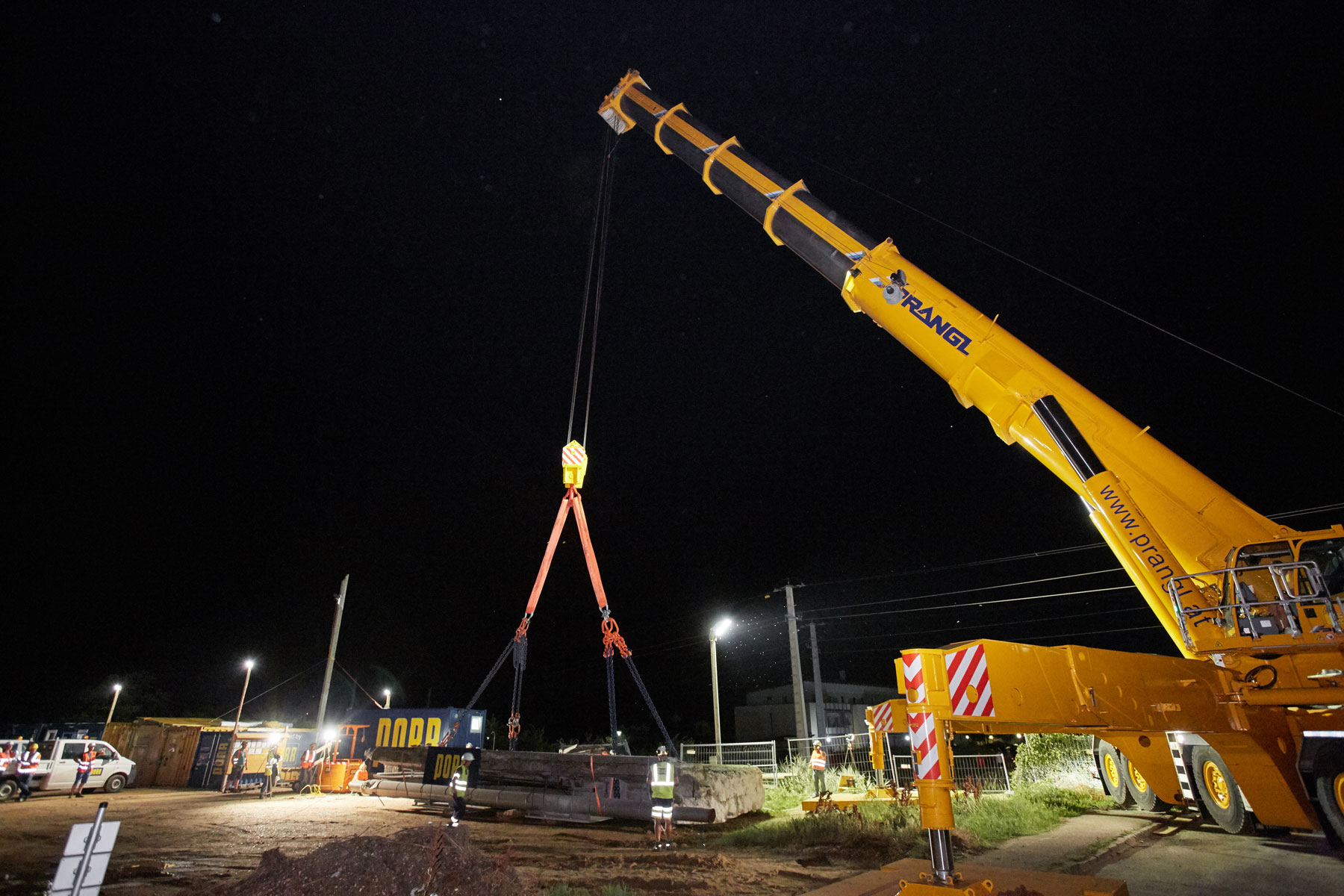 A 228 tonnányi ellensúlynak köszönhetően a hatalmas daru 336 tonnát nyomott. Természetesen a megfelelő felállítási helyet is meg kellett találni. A Prangl csapat műszaki szakértőinek köszönhetően olyan felállítási felületet sikerült találni, amely nem kívánt további előkészítést. Ez jelentősen csökkentette a költségeket, és a projektet is leegyszerűsítette az ügyfél számára. A Prangl a hídelemeket közvetlenül az építési terület mellett tette le, és egy erre szakosodott cég előírásszerűen szétszerelte és elszállította azokat. A teljes emelési folyamatot olyan időtartamon belül teljesítettük, amely minden érintett félnek kielégítő volt.