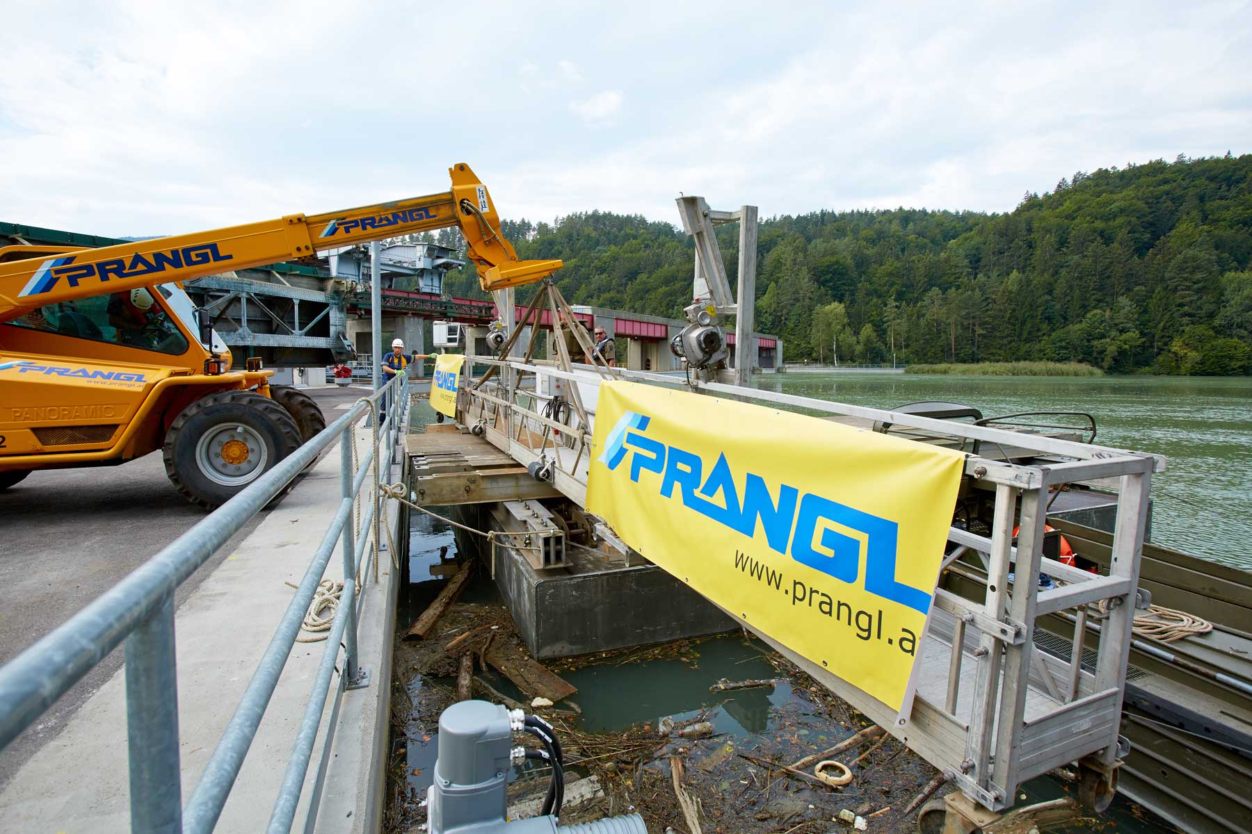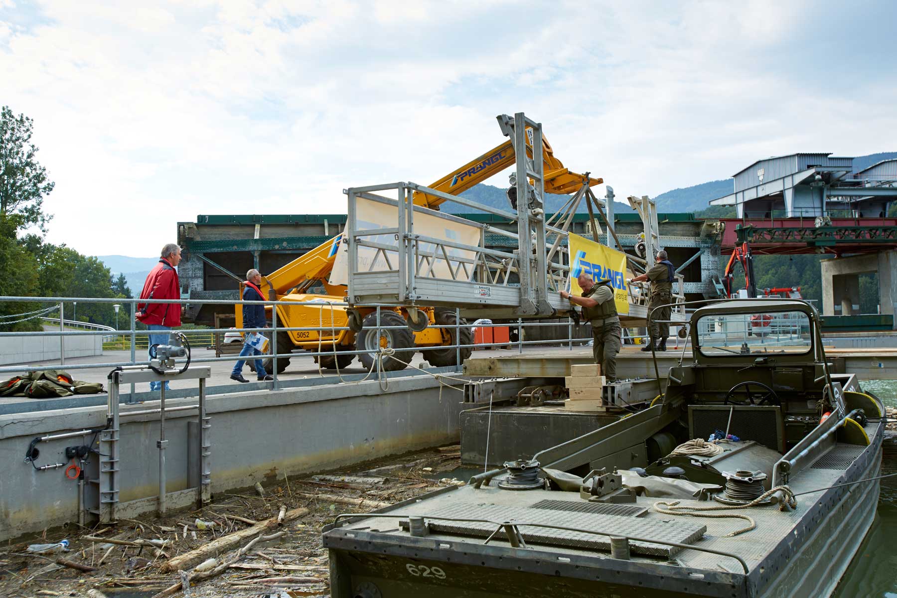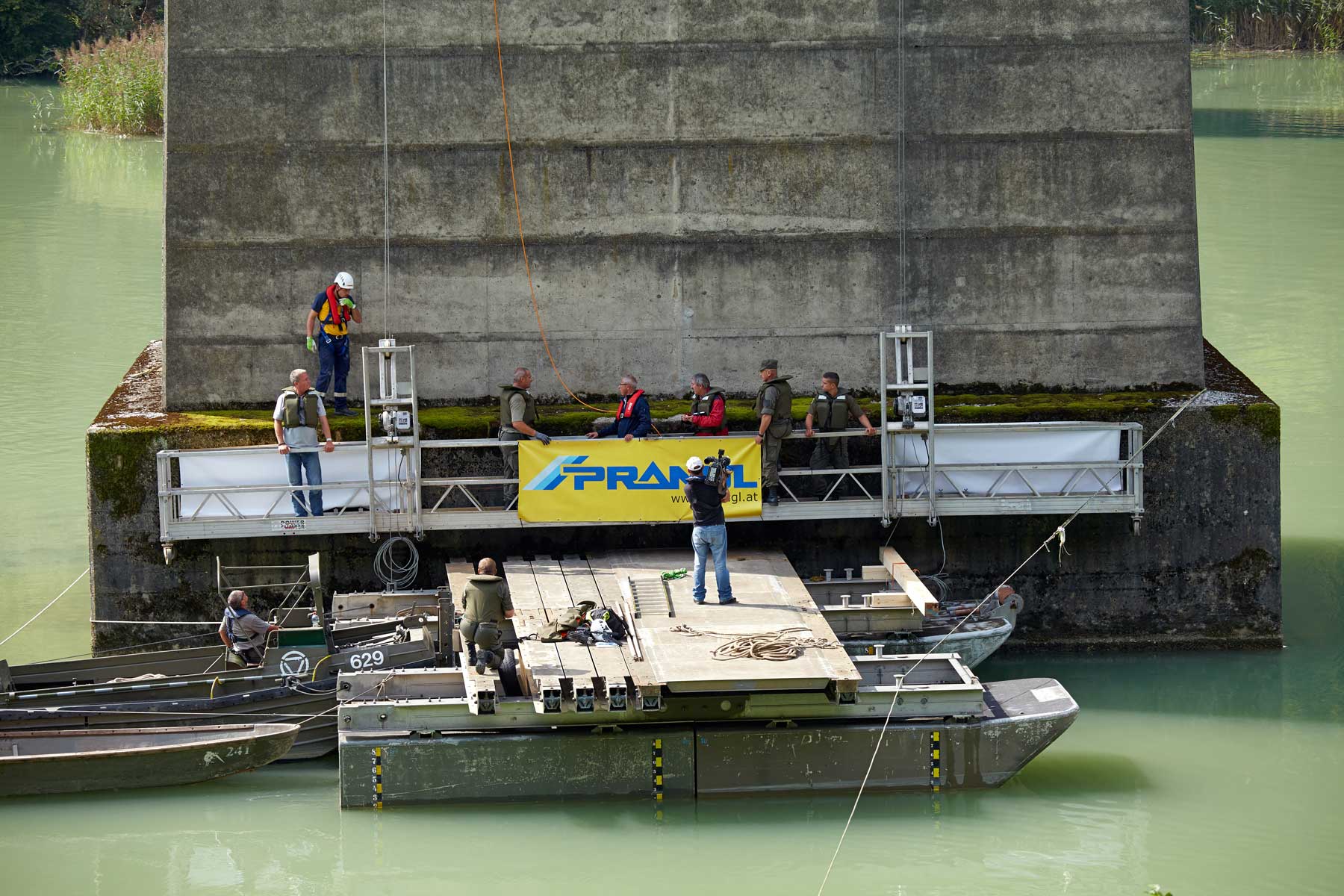 Az ÖBB csapatával közösen dolgoztunk ki egy koncepciót: A problémára négy 12 méter hosszú függő szerelőállvány használata jelentett gazdaságos megoldást. Ahhoz, hogy a Drávában álló hídpillérekhez egyáltalán be tudjunk jutni, az osztrák hadsereg segítségét vettük igénybe. A függő szerelőállványokat egy speciális nehézteher-hajóval szállítottuk a közeli schabecki erőműből a betonpillérekig, kb. 4 kilométeren keresztül folyón felfelé. Az odaszállításra más megoldás egyáltalán nem lett volna.