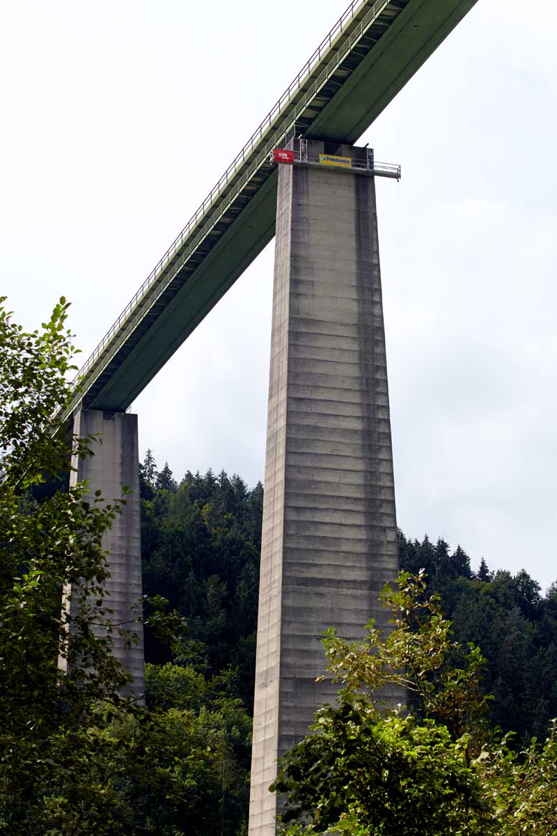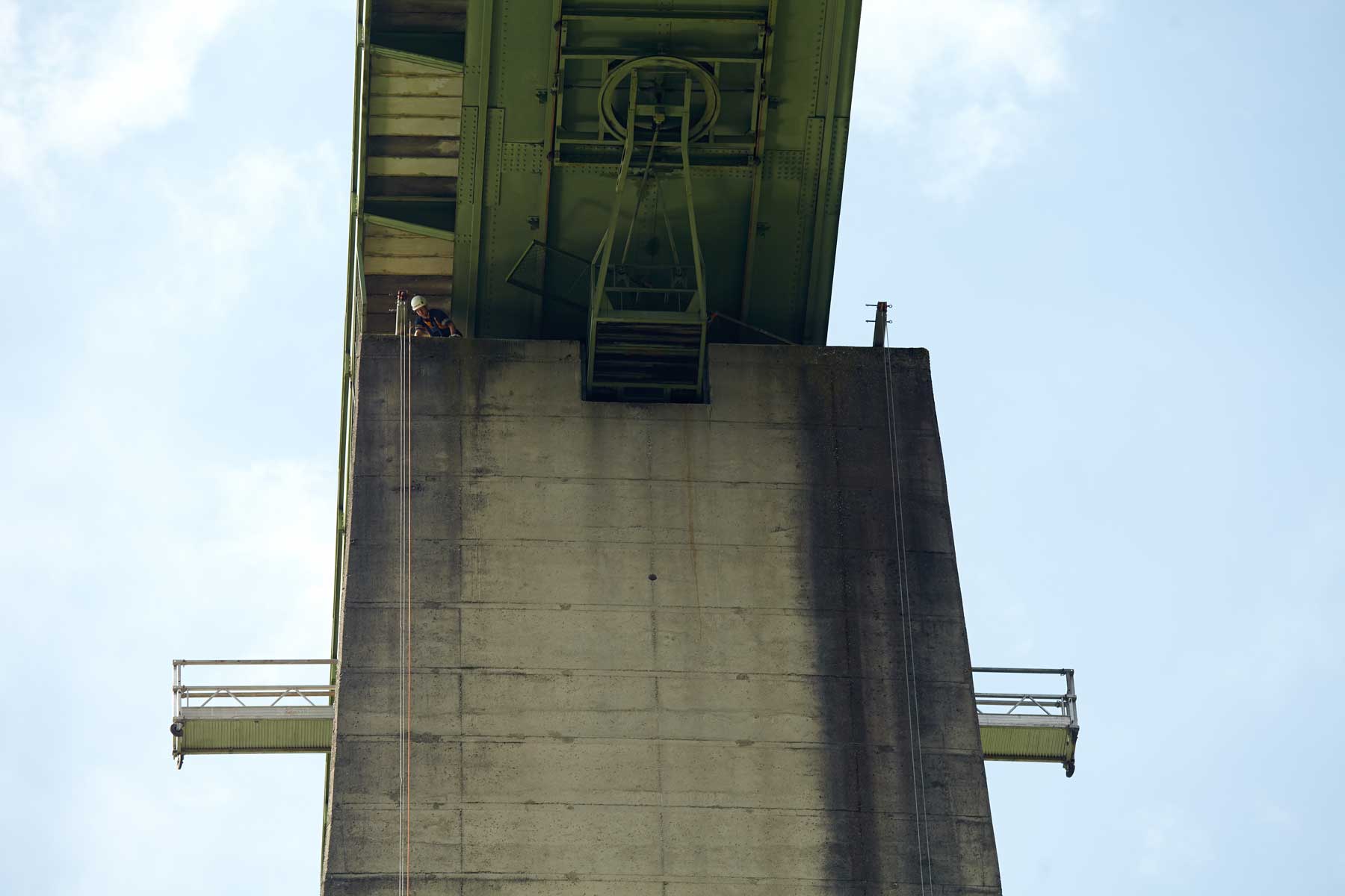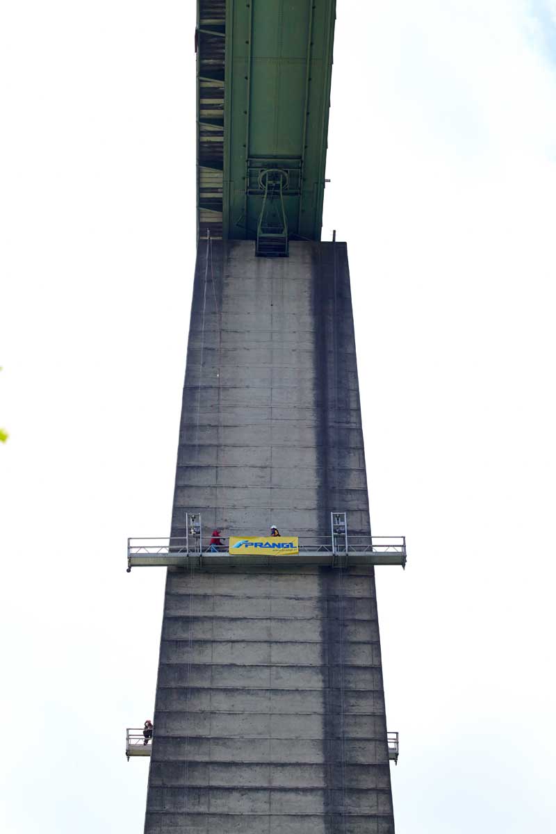 A helyszínre érkezve a Prangl csapat a felszerelést szabályszerűen rögzítette. A 90 méter magas hídpillér bejárása így elkezdődhetett. Mivel a fúrásokat csak meghatározott helyeken végeztük, a maximális mozgathatóság nagyon fontos volt. Másképp az épület állapotának vegyészeti elemzését nem tudtuk volna elvégezni. Az egyedülálló kihívás ellenére minden munkát időben el tudtunk végezni az illetékesek legnagyobb megelégedettségére.