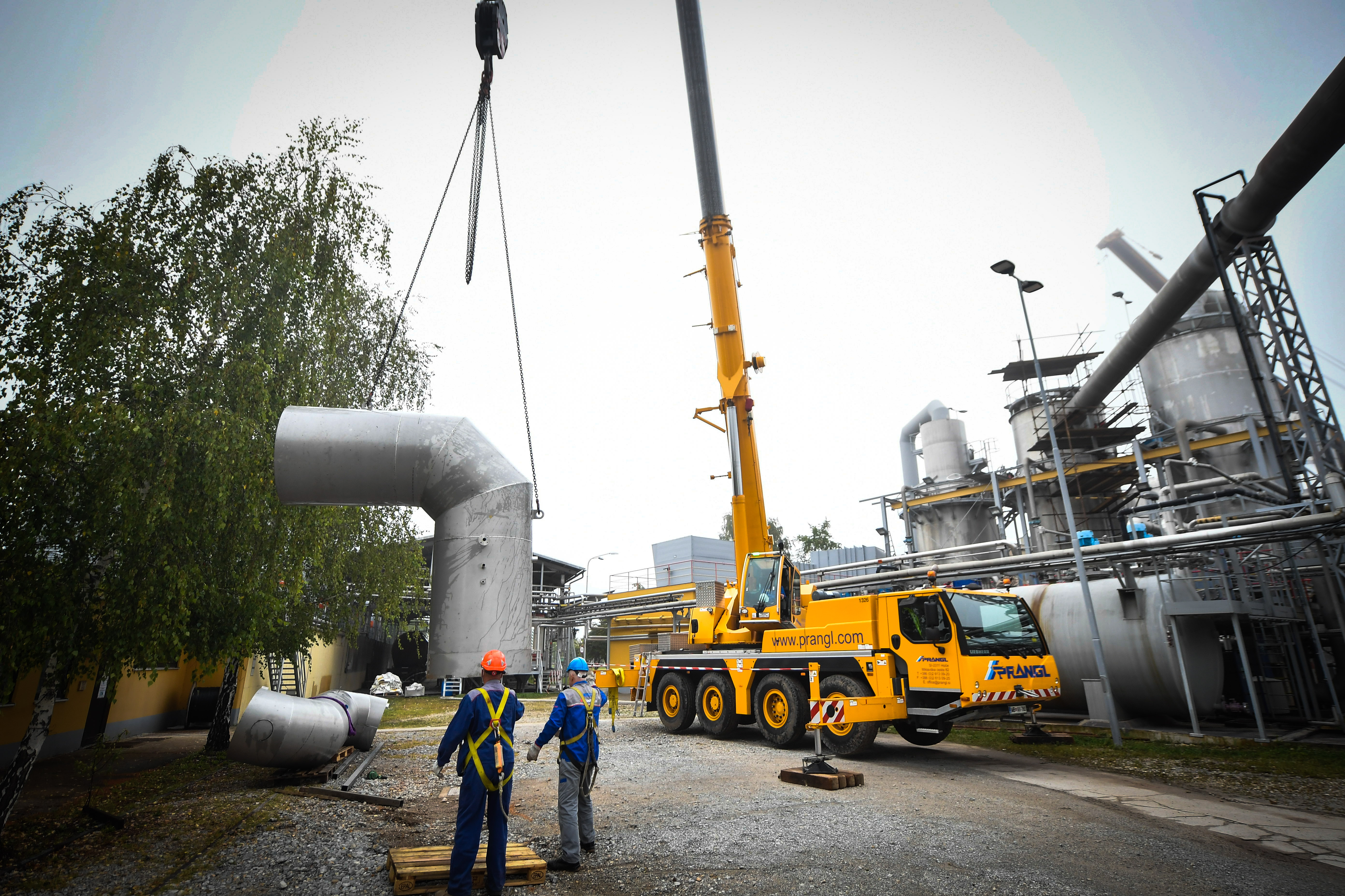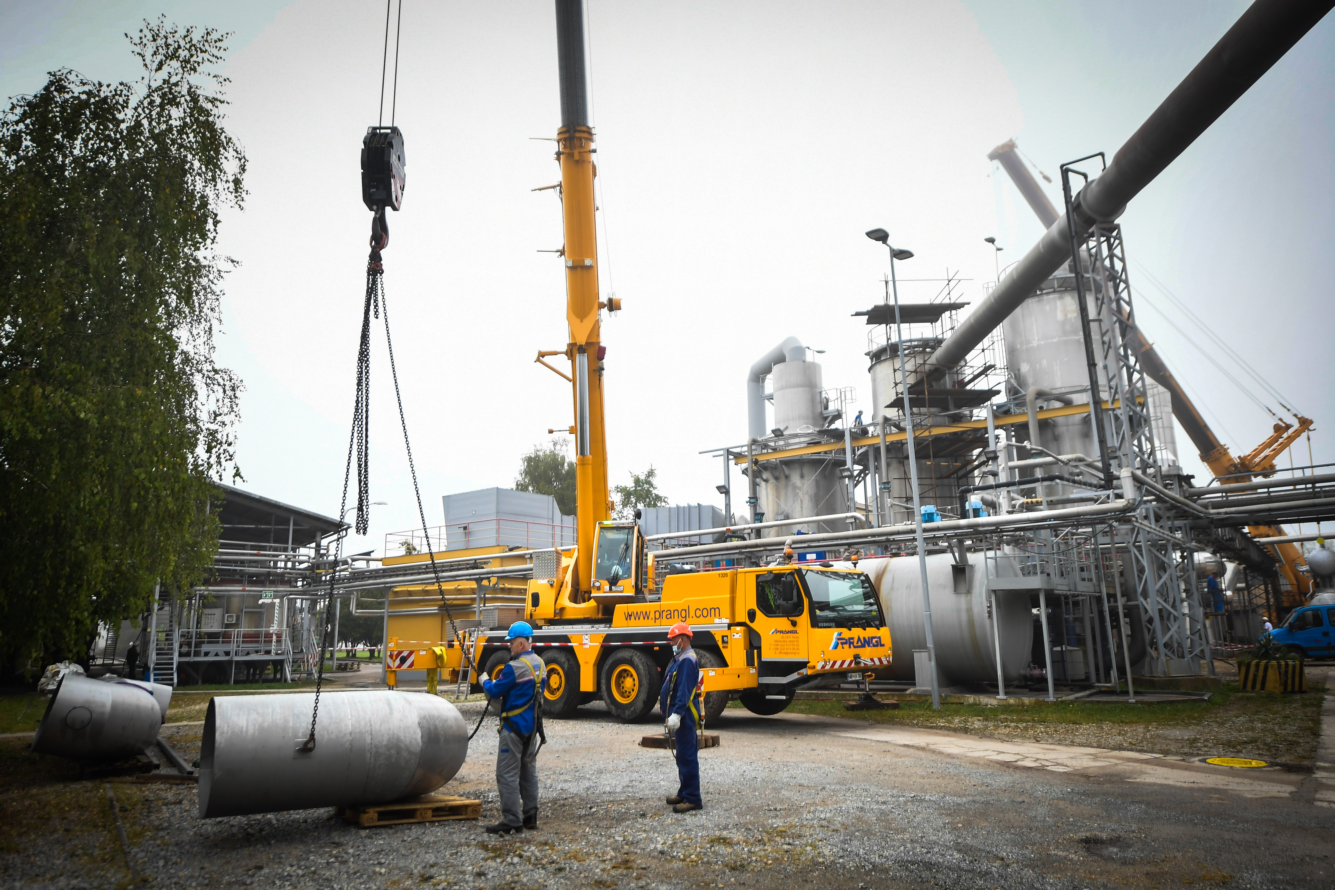 Alighanem a projekt legfontosabb része az építkezés bejárása és az emelési feladat felmérése volt. A helyszíni adottságok pontos ismeretében precíz műszaki tervet és egyedi emelési koncepciót tudtunk összeállítani. A gázvezetékek cseréjénél egy 40 és egy 70 tonnás teleszkópos mobildaru dolgozott az üzem különböző területein. A daruk a helyszínen más emelési feladatoknál is támogatást nyújtottak.