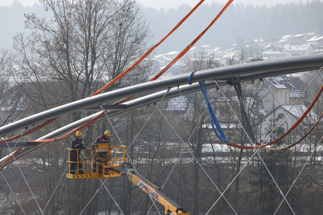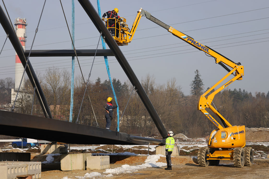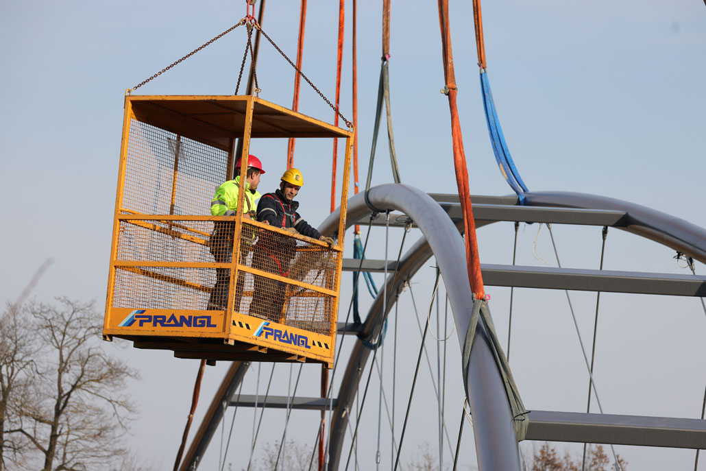 A rácsos gémű daru mellett egy 95 tonnás teleszkópgémes daru 58 méteres főgémmel és egy 20 méteres munkamagasságú, 230 kg teherbírású, 12 méteres oldalkinyúlással rendelkező csuklós munkaállvány is besegített. Az autódarukat nagy körültekintéssel helyezték el, a hidat óvatosan megemelték, majd végleges helyzetébe pozícionálták. Ezt követően a szerelők munkába állhattak és rögzíthették a hidat. A Prangl csapat professzionalizmusának köszönhetően a munka a megrendelő legnagyobb megelégedésével készült el.