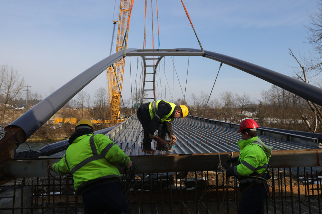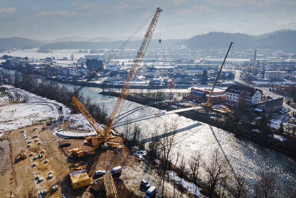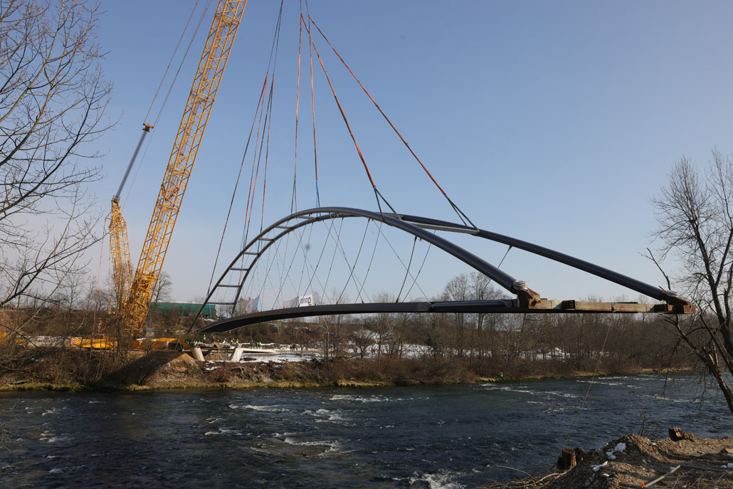 A természet védelme és a folyó megóvása érdekében a hidat középső hídtámasz nélkülire tervezték. Így a 61 tonnás kerékpárhíd egyetlen, 83 méter hosszú darabban kellett a helyére emelni. Az ilyen összetett emelési projektek sikerének alapja mindig a megfelelő berendezés kiválasztása. Az optimális megoldás ebben az esetben egy 600 tonnás rácsos gémű daru 84 méteres főgémmel és 570 tonna össztömeggel. Ez a daru nem csak elég erős, hanem a gyors össze- és szétszerelést is lehetővé tesz.