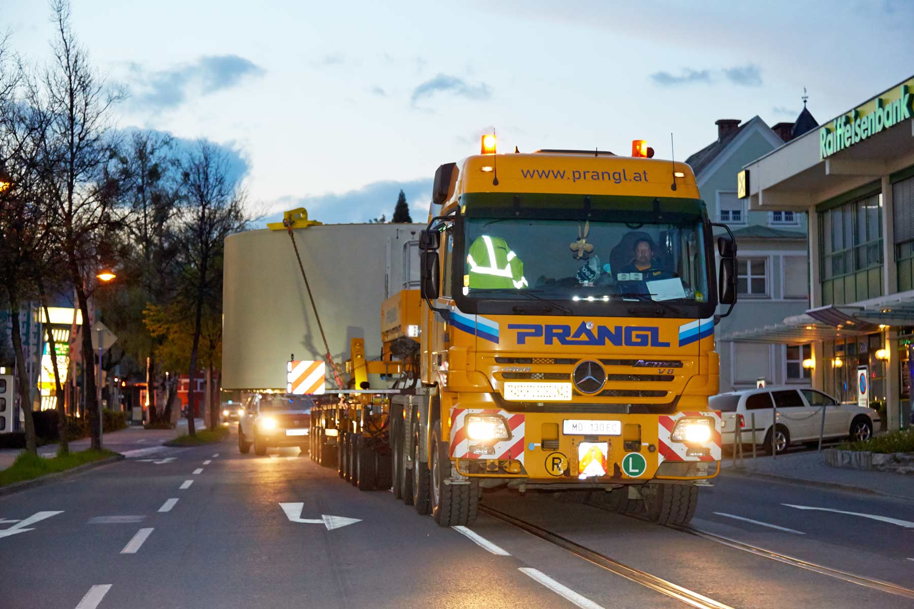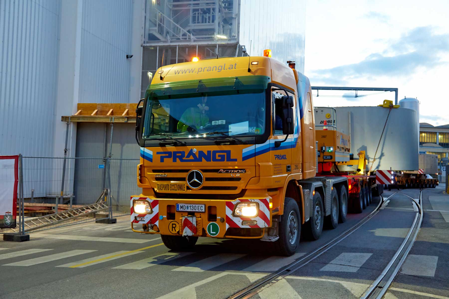 Egy 6,80 m széles szerkezeti elem különleges szállítása, amelynek egyenkénti súlya csaknem 86 tonna, a szűk városi területen át történő manőverezés és a „just in time” szakszerű darus lerakás kihívást jelent ugyan, de tökéletes feladat a Prangl csapat számára. A sok éves és nagyon jó együttműködés miatt a kremsi dunai kikötő a Prangl-t bízta meg a különleges szállításokkal.