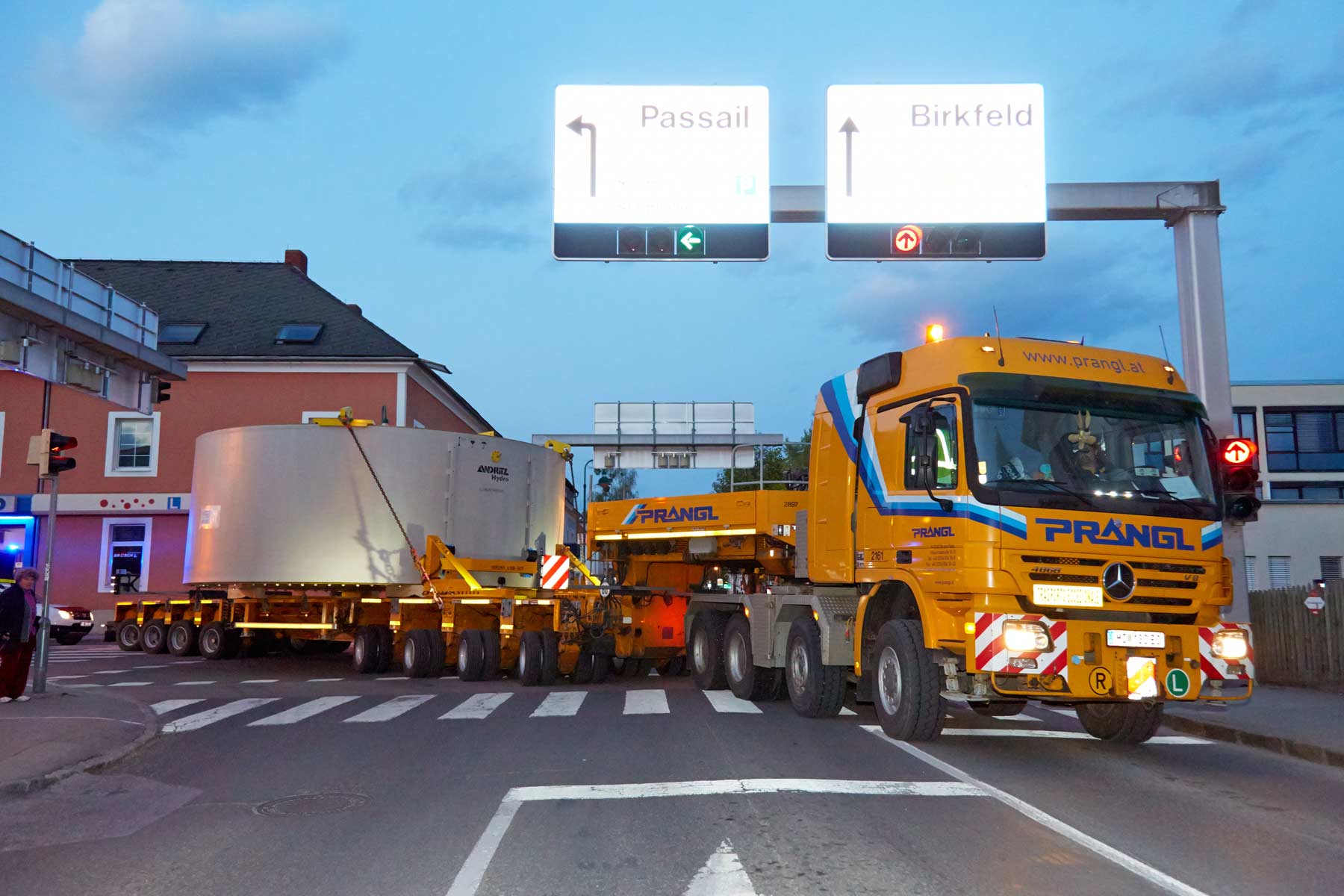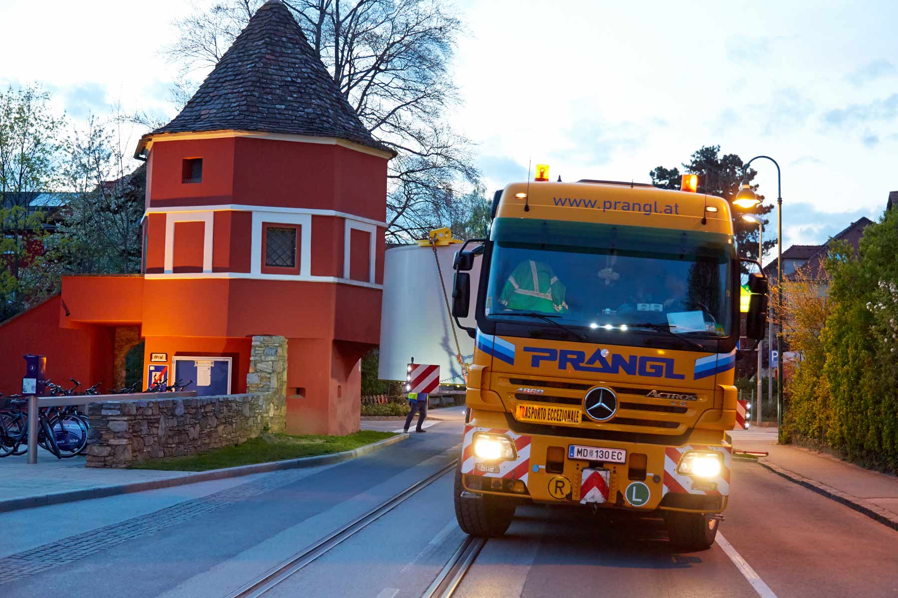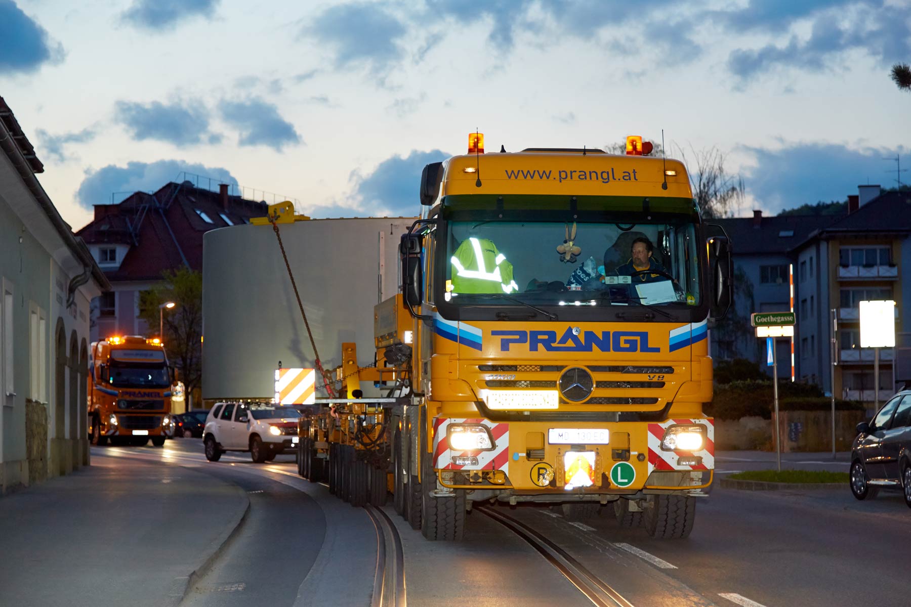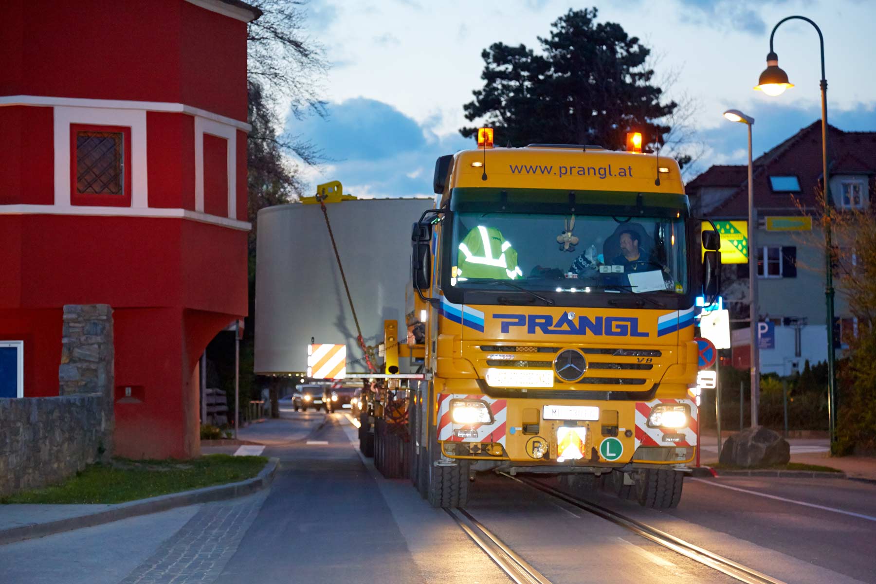 A két hatalmas berendezésrészt Weiz város területéről a kremsi kikötőbe kellett szállítani. A szállítójármű és rakomány monumentális 27 méteres hosszúságával, 6,80 méteres szélességével, 4,50 méteres magasságával, valamint 132 tonnás összsúlyával nem csak sok nézelődőt vonzott, hanem a Prangl szakembereinek is érdekes kihívást jelentett.