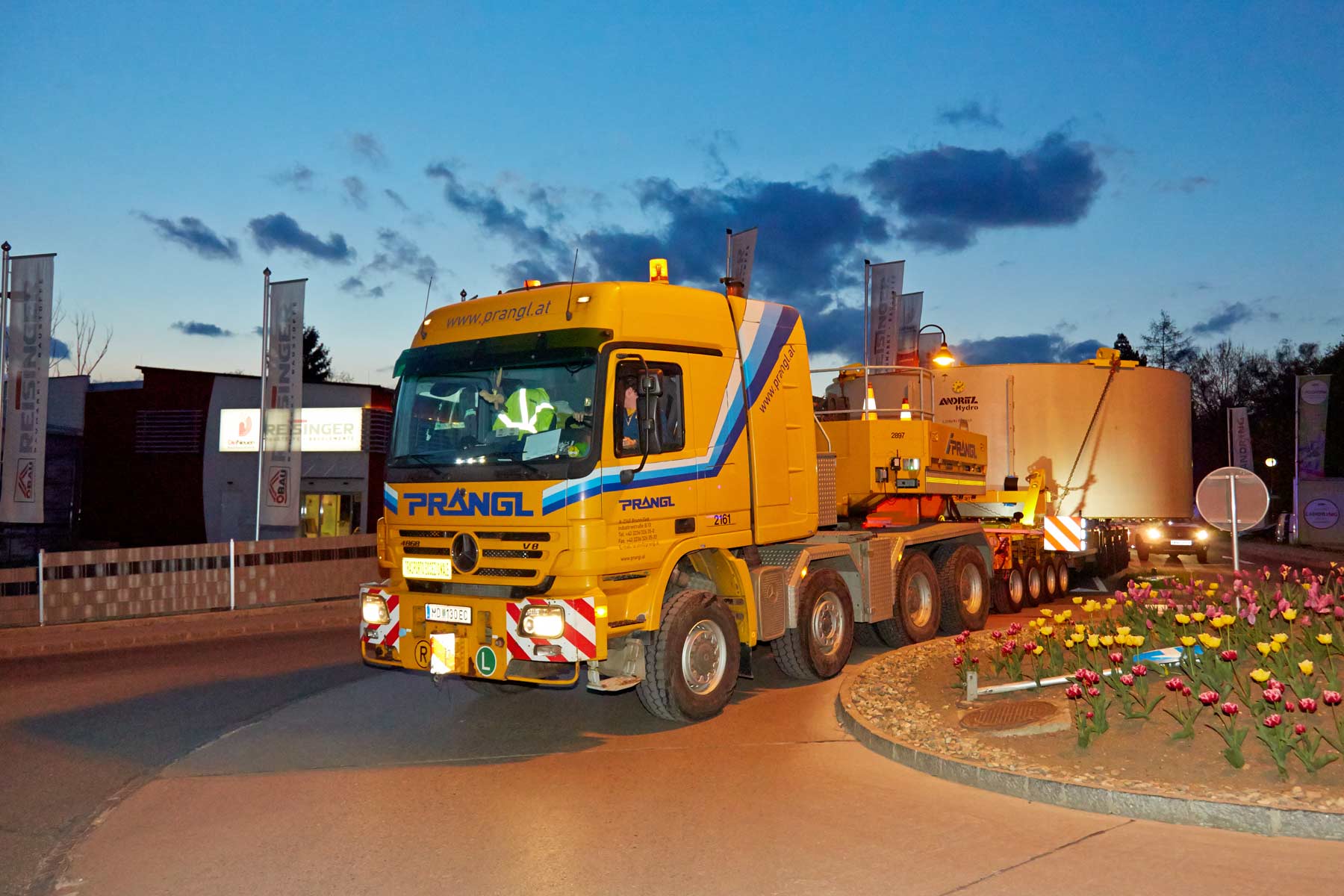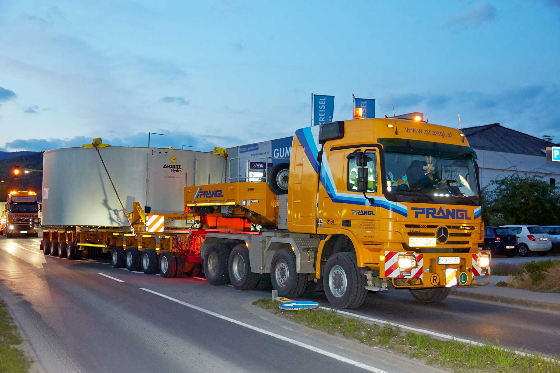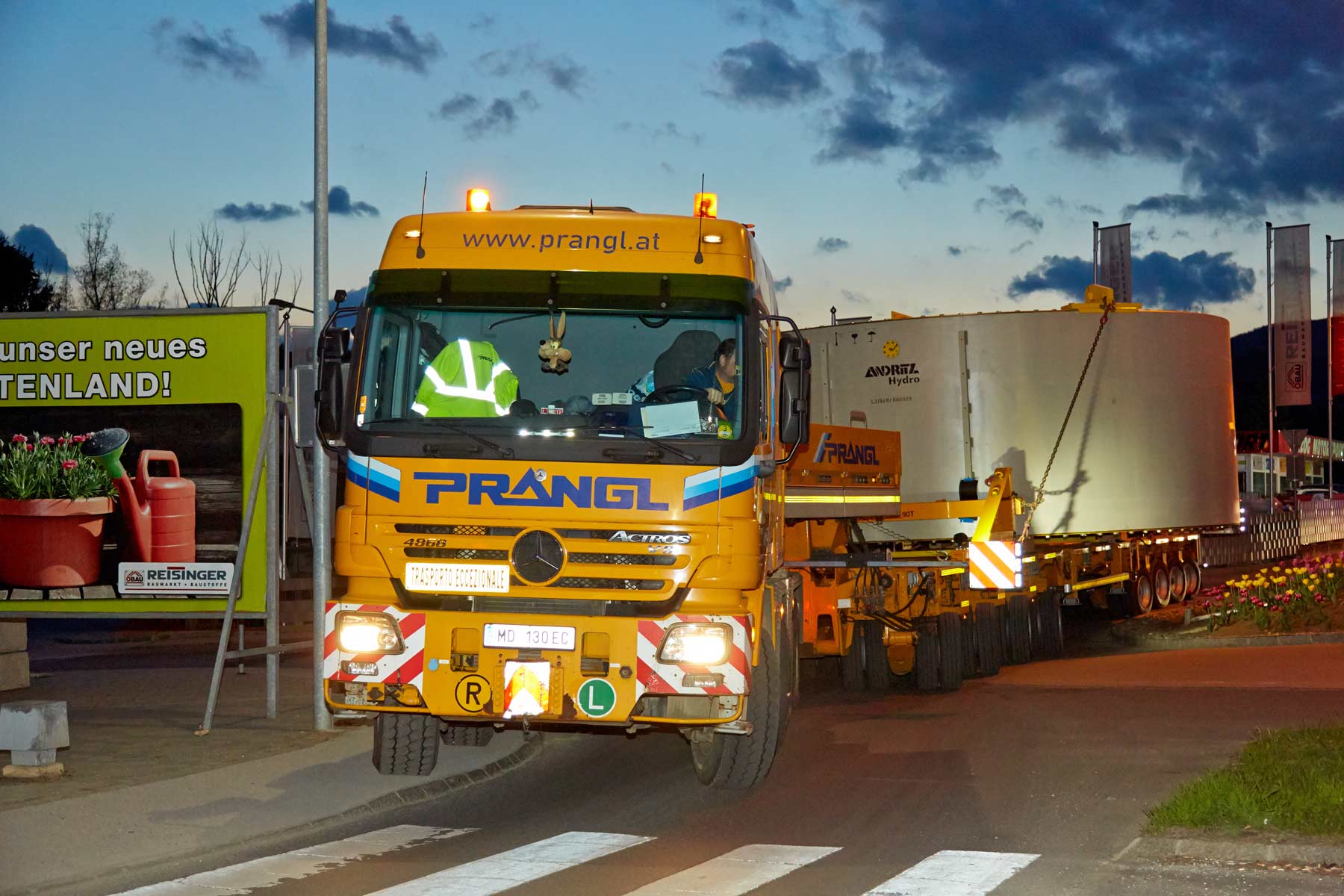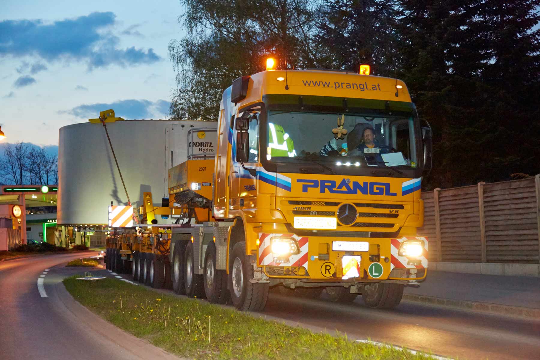A két hatalmas berendezésrészt Weiz város területéről a kremsi kikötőbe kellett szállítani. A szállítójármű és rakomány monumentális 27 méteres hosszúságával, 6,80 méteres szélességével, 4,50 méteres magasságával, valamint 132 tonnás összsúlyával nem csak sok nézelődőt vonzott, hanem a Prangl szakembereinek is érdekes kihívást jelentett.