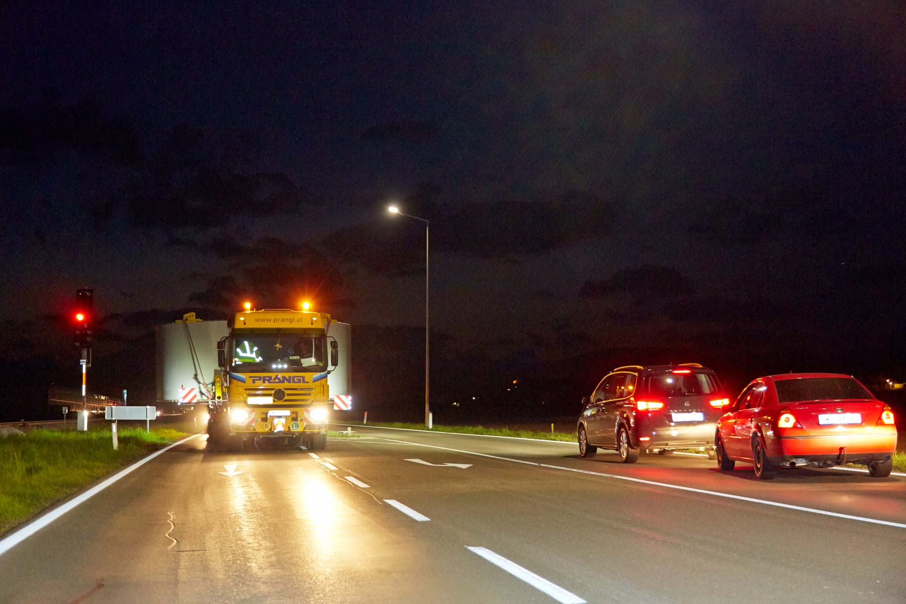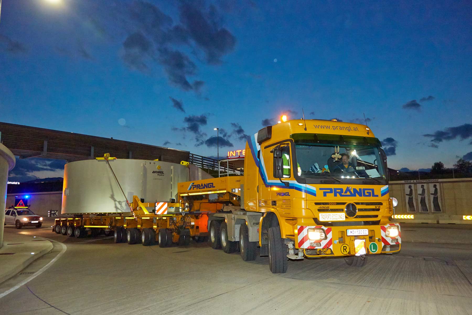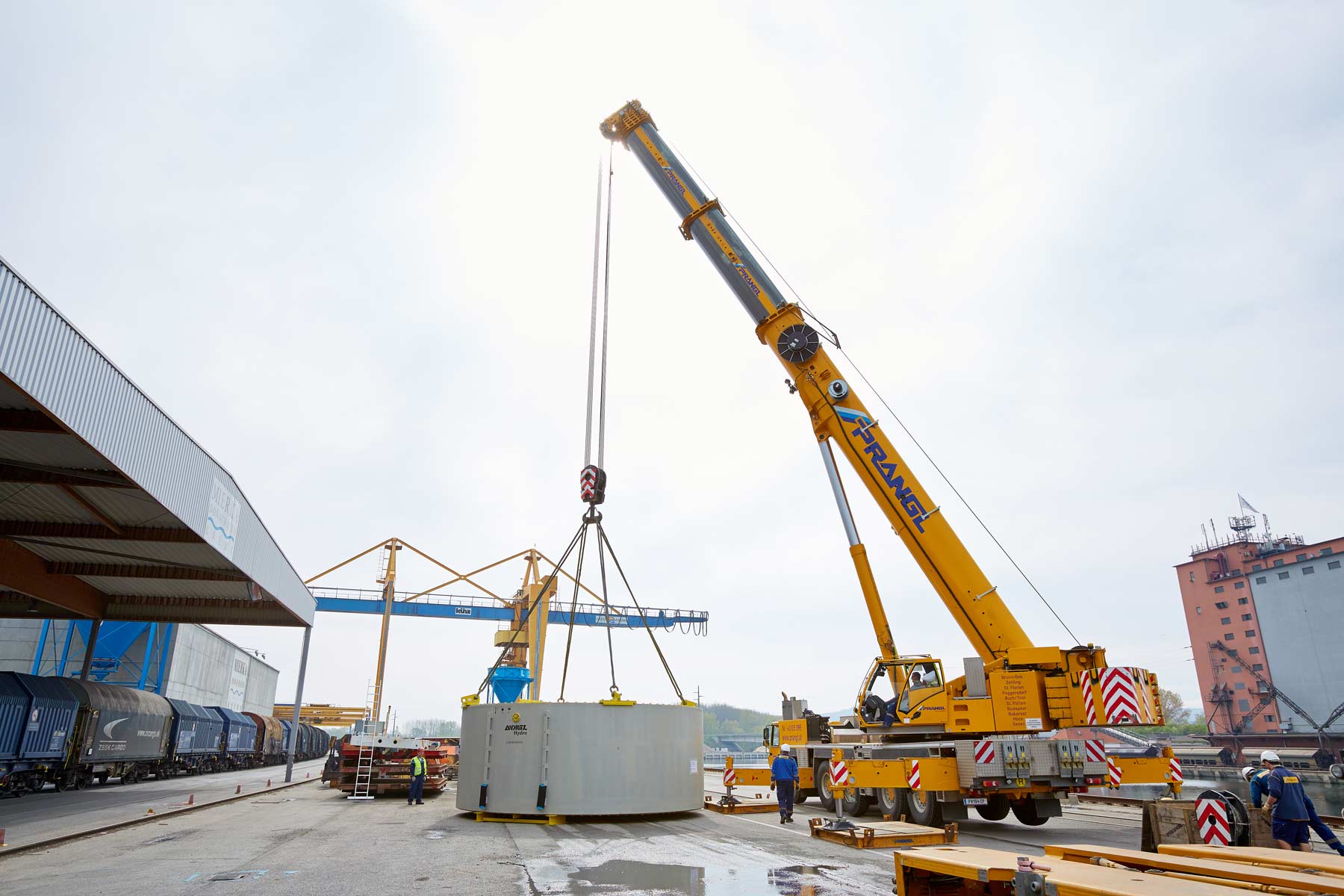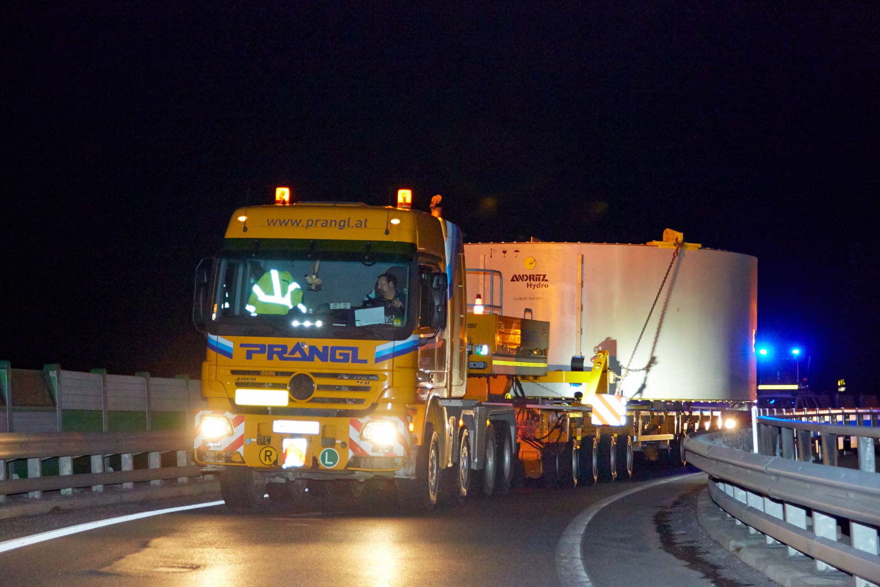 Különösen Weiz belvárosának részben szűk kanyarjain, valamint az A2-es autópályán lévő építési területeken történő áthajtás még a tapasztalt sofőröktől is megkövetelte, hogy minden tudásukat beleadják. A szállítás pontos előzetes tervezése, valamint a gyakorlattal rendelkező, helyi Prangl csapattal való tökéletes együttműködés miatt ezek a helyzetek sem jelentettek problémát. Mindkét különleges szállítás terv szerint zajlott, és kb. 7 órás menetidő után a konvoj megérkezett a kikötőbe. Ott már várta őket egy 220 tonnás teleszkópos daru, amely mindkét szerkezeti elemet szakszerűen és a legnagyobb gondossággal lerakta.