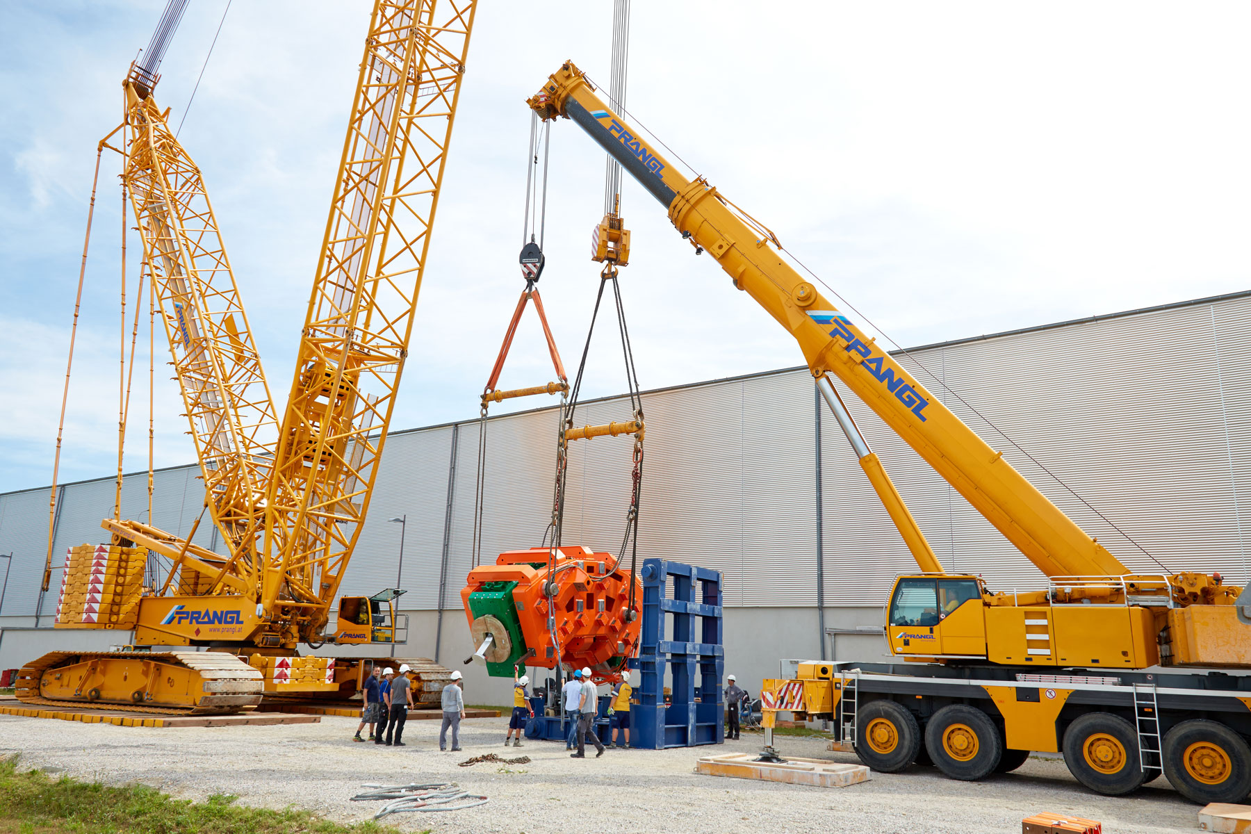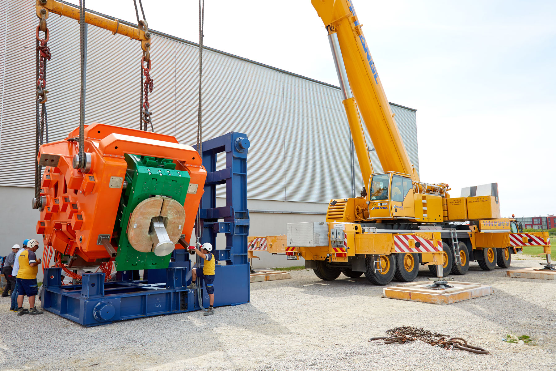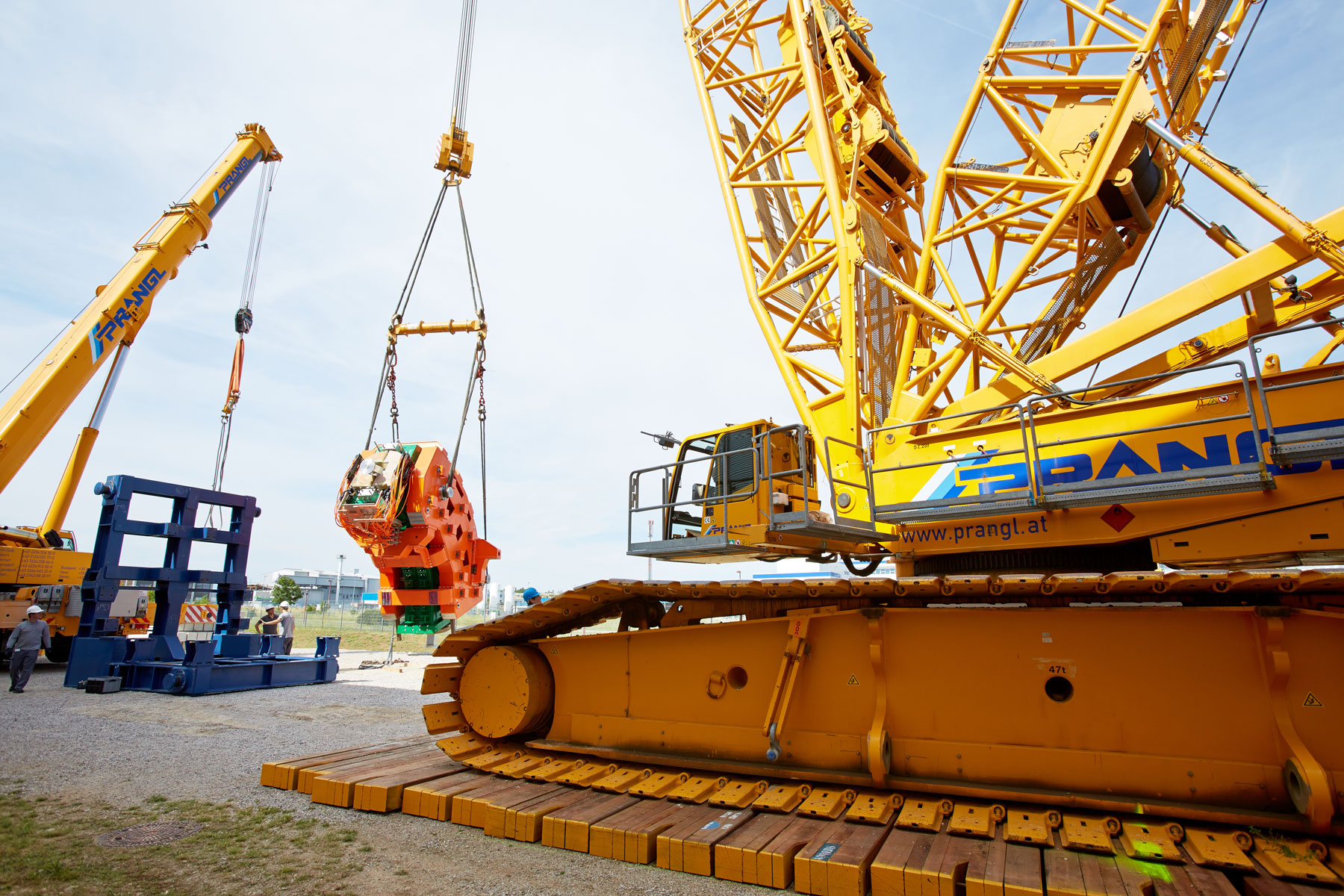 Annak érdekében, hogy az egyenként 120 tonnás egységeket szakszerűen mozgatni tudják, egy 600 tonnás lánctalpas darut kellett bevetni. A mágnest egy külön erre a célra kialakított fali tartóra helyezték és 90°-ban elfordították. A nehéz emelés és a forgatási manőver után a mágnest egy 250 tonnás teleszkópos daru segítségével szétszedték. A legnehezebb alkatrészek így már csak 54 tonnásak lettek.