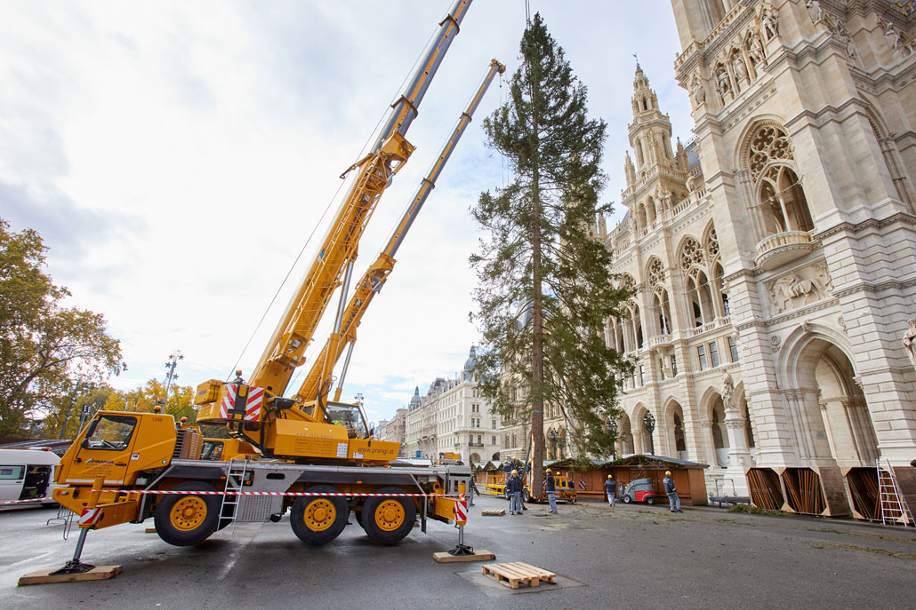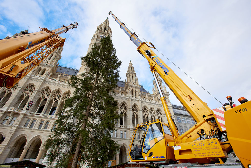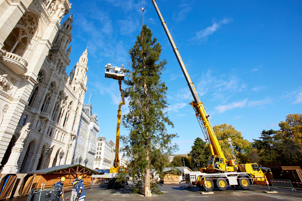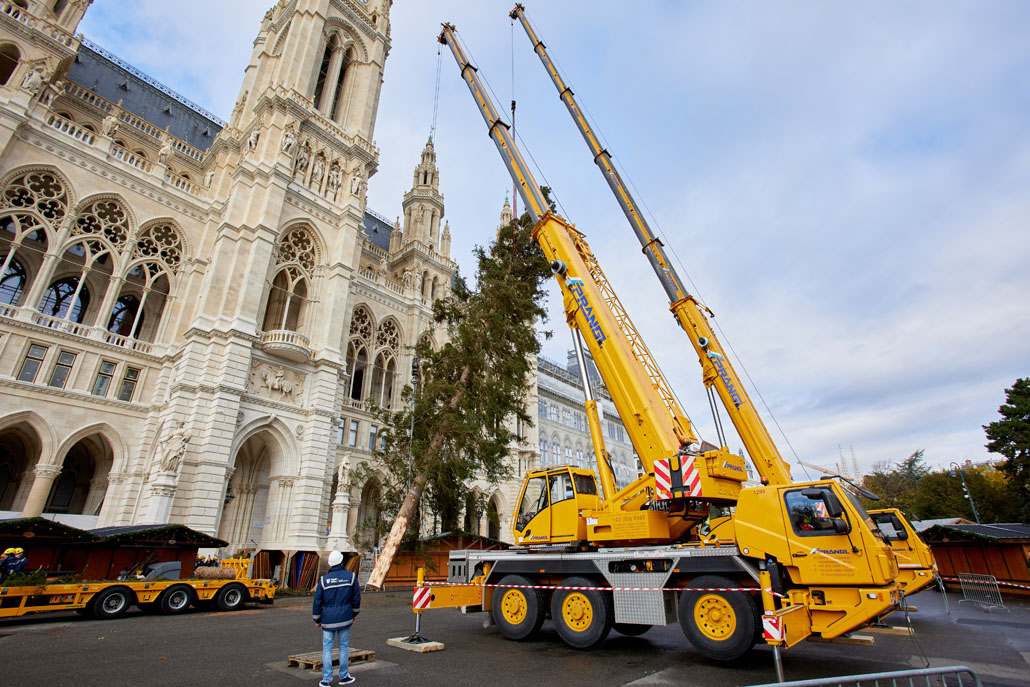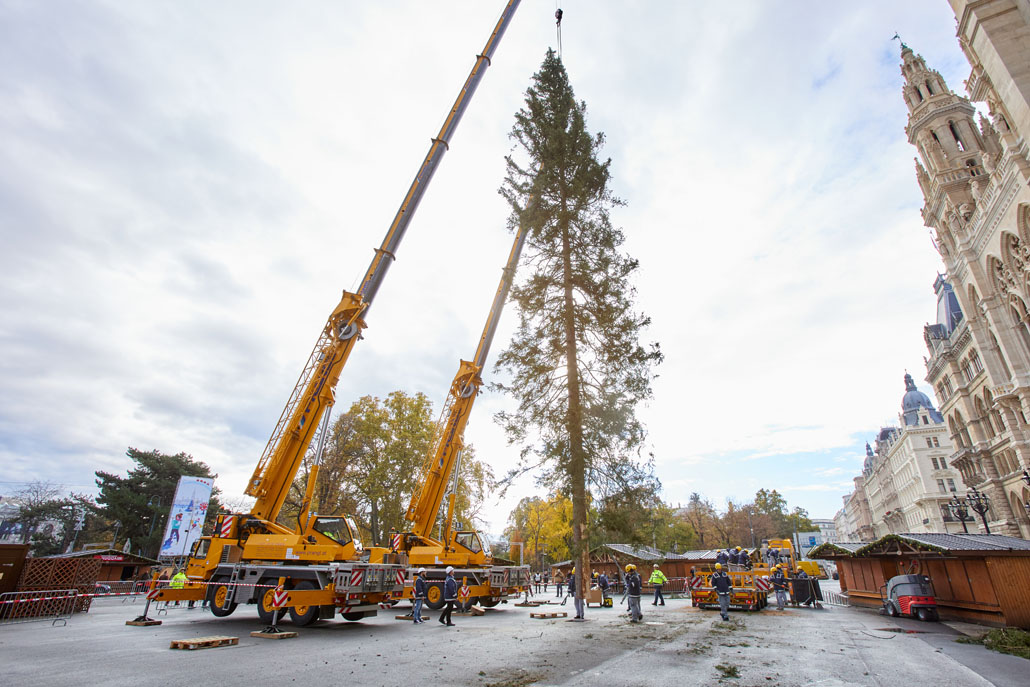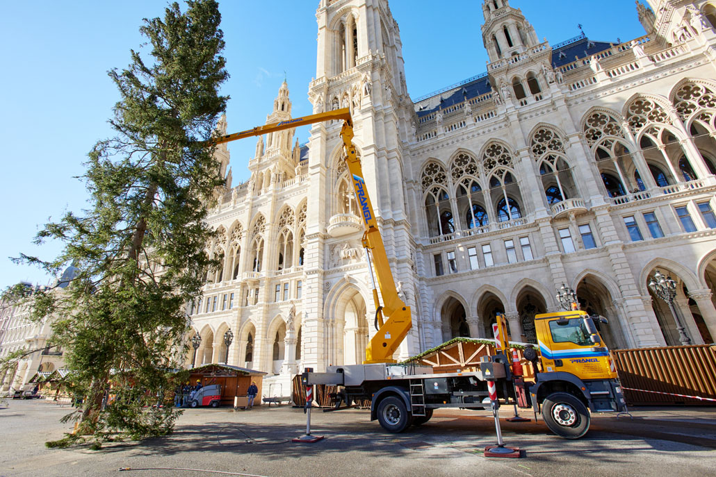 A bécsi Rathausplatz-on a fát két 60 tonnás teleszkópgémes daru páros emeléssel emelte le a szállítójárműről, majd felállította és a helyére rakta. De ezzel a munka még nem ért véget: a lucfenyőt még karácsonyfává kellett alakítani. Ehhez egy 36,7 méteres maximális munkamagasságú, 500 kilogramm teherbírású és 30 méteres oldalkinyúlású, teherautóra szerelt munkaállványt használtak. A viszonylag nagyméretű munkakosárban könnyen lehetett emelni a karácsonyi dekorációkat és a ráadásul belehelyezett ágakat. Most már jöhet a karácsony!