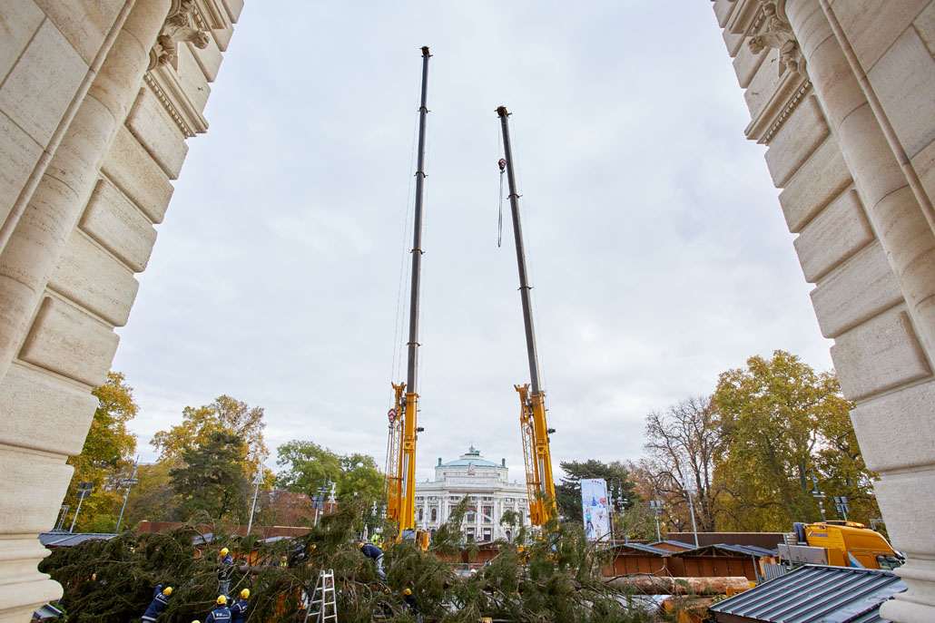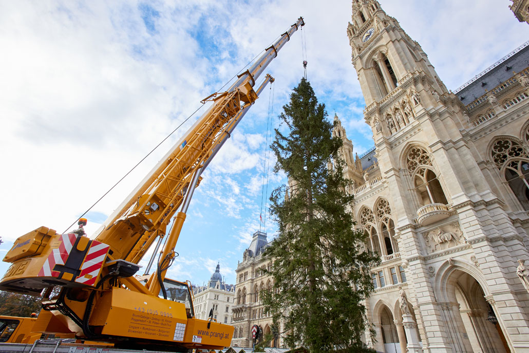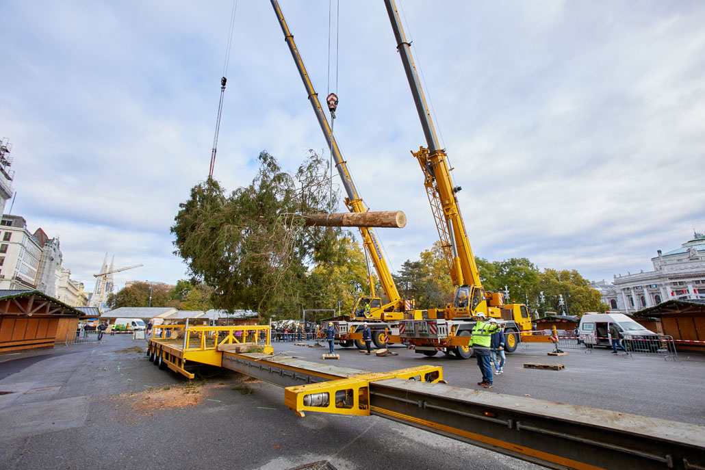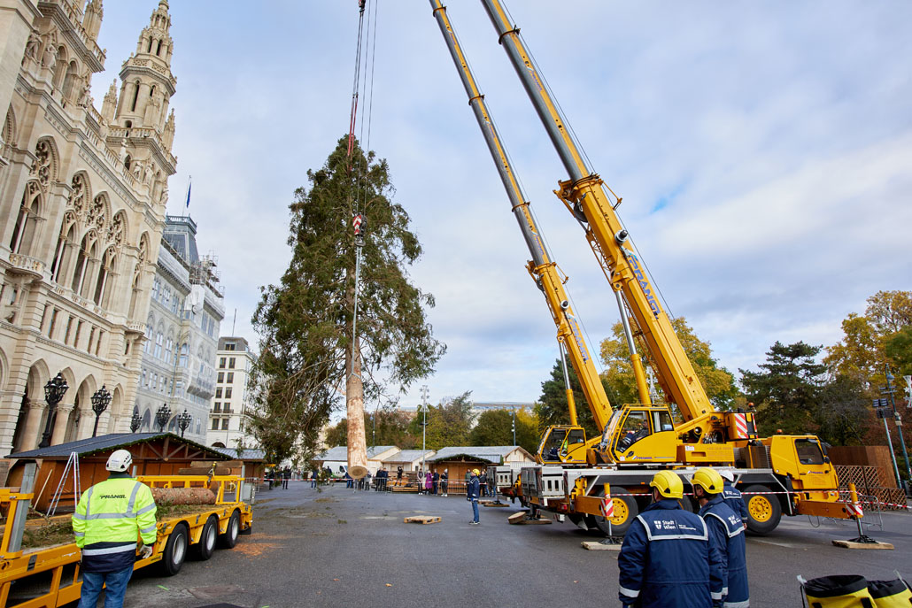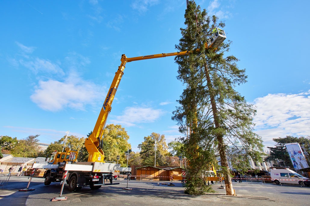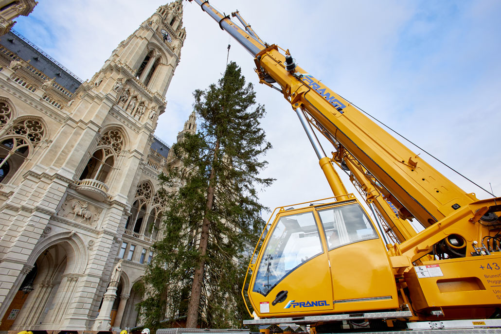 A bécsi Rathausplatz-on a fát két 60 tonnás teleszkópgémes daru páros emeléssel emelte le a szállítójárműről, majd felállította és a helyére rakta. De ezzel a munka még nem ért véget: a lucfenyőt még karácsonyfává kellett alakítani. Ehhez egy 36,7 méteres maximális munkamagasságú, 500 kilogramm teherbírású és 30 méteres oldalkinyúlású, teherautóra szerelt munkaállványt használtak. A viszonylag nagyméretű munkakosárban könnyen lehetett emelni a karácsonyi dekorációkat és a ráadásul belehelyezett ágakat. Most már jöhet a karácsony!
