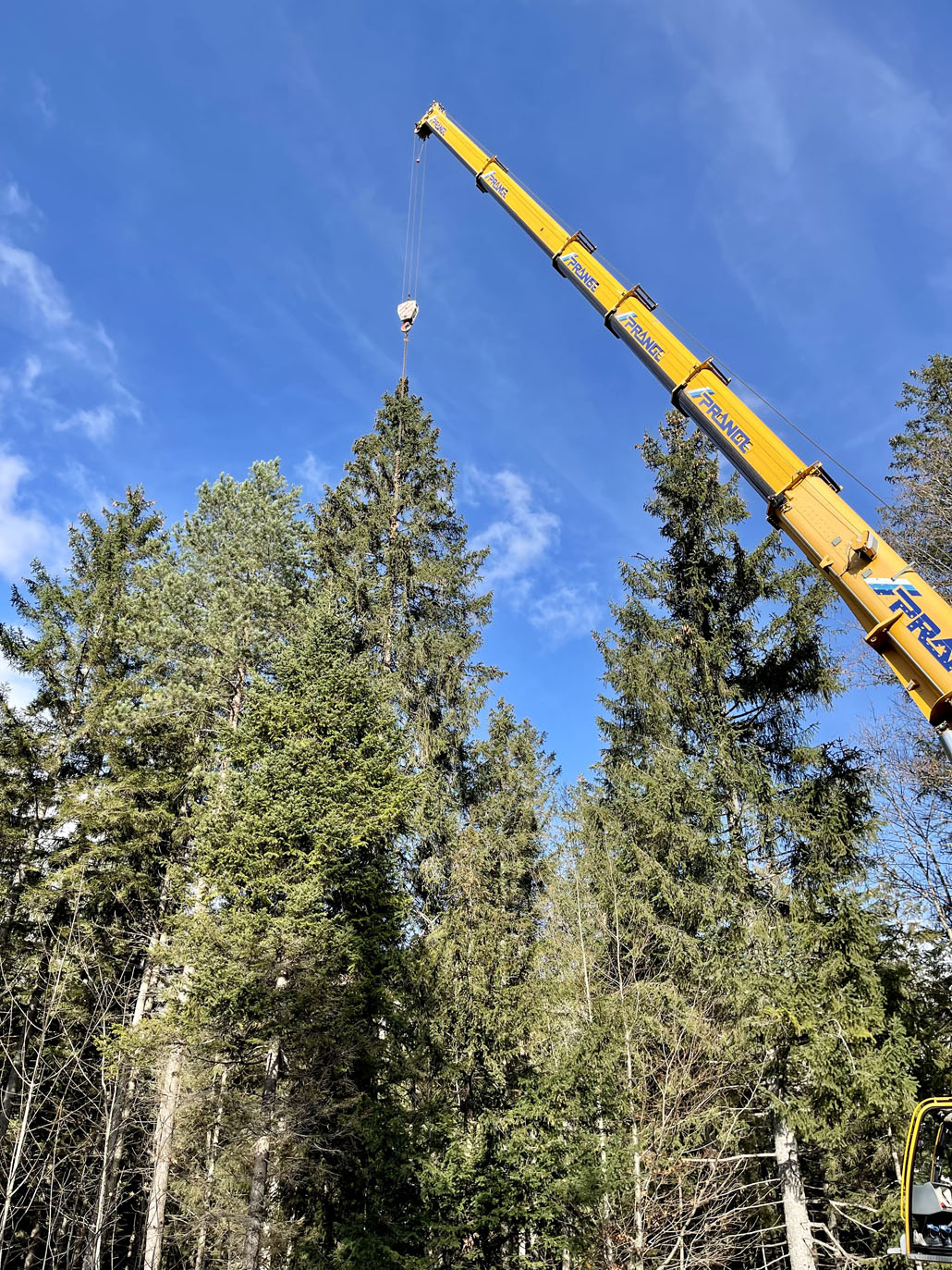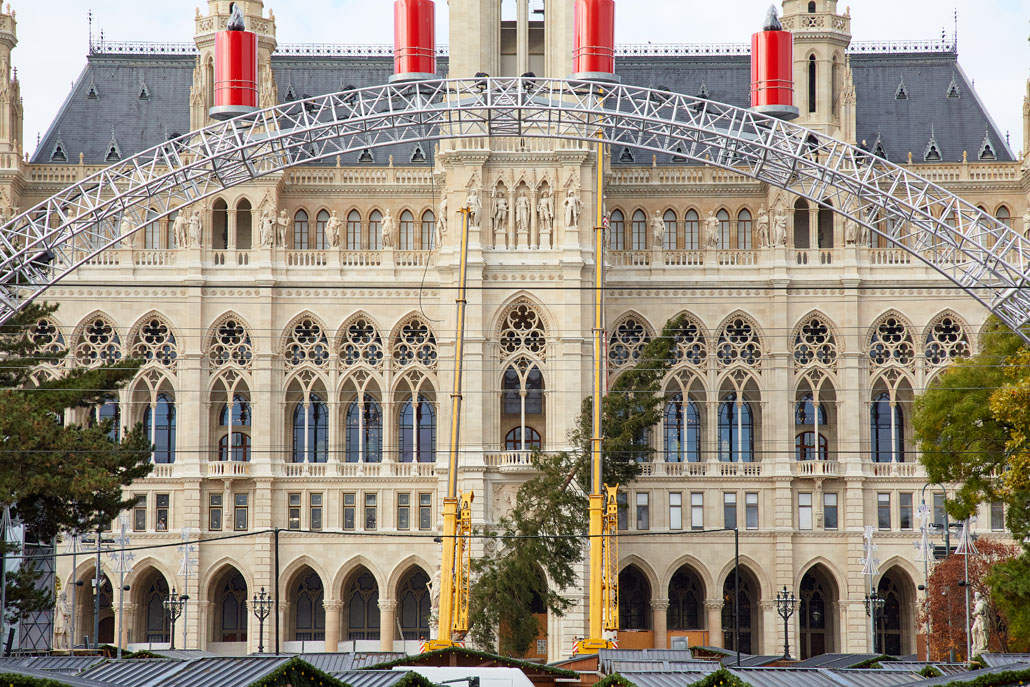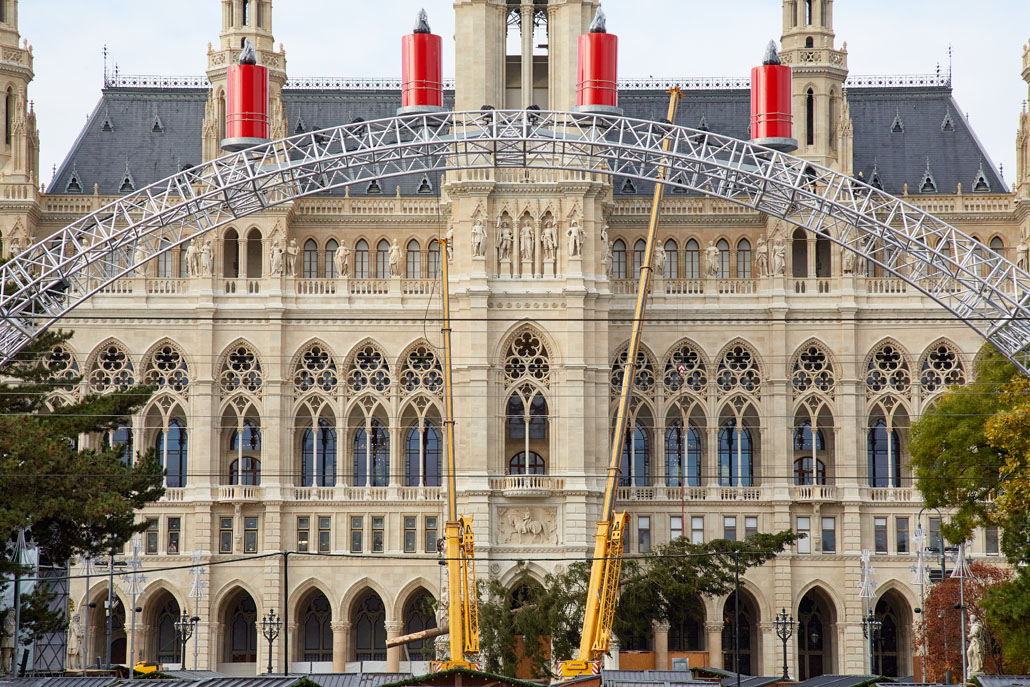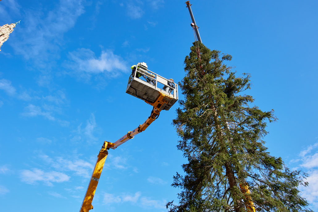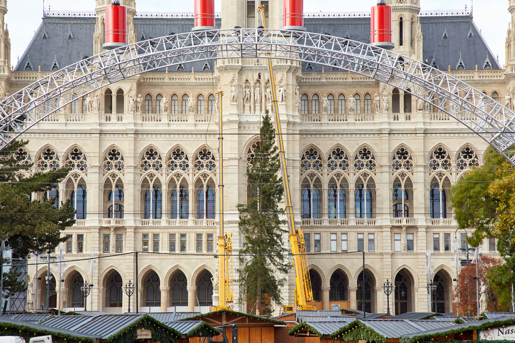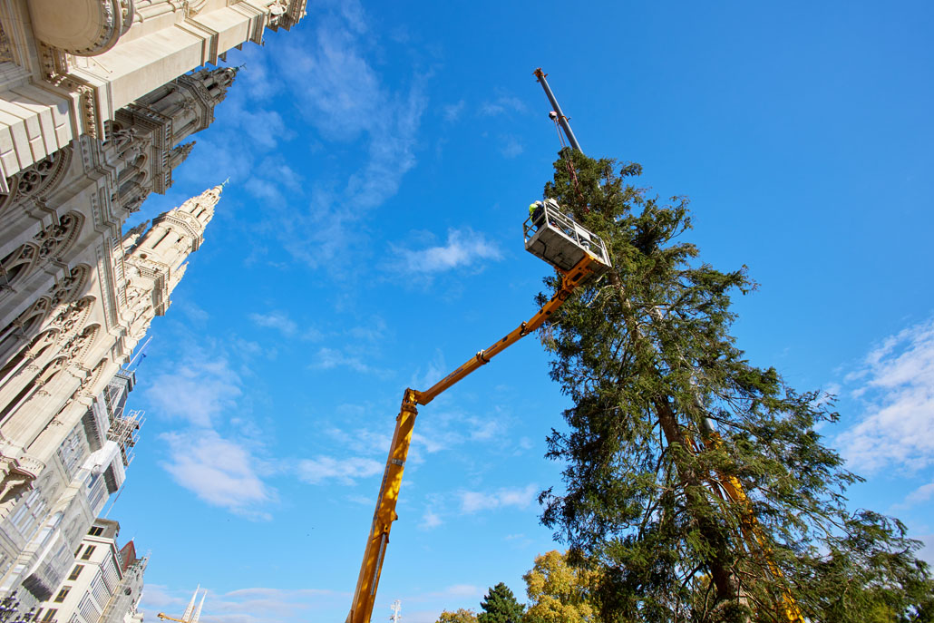 A bécsi Rathausplatz-on a fát két 60 tonnás teleszkópgémes daru páros emeléssel emelte le a szállítójárműről, majd felállította és a helyére rakta. De ezzel a munka még nem ért véget: a lucfenyőt még karácsonyfává kellett alakítani. Ehhez egy 36,7 méteres maximális munkamagasságú, 500 kilogramm teherbírású és 30 méteres oldalkinyúlású, teherautóra szerelt munkaállványt használtak. A viszonylag nagyméretű munkakosárban könnyen lehetett emelni a karácsonyi dekorációkat és a ráadásul belehelyezett ágakat. Most már jöhet a karácsony!