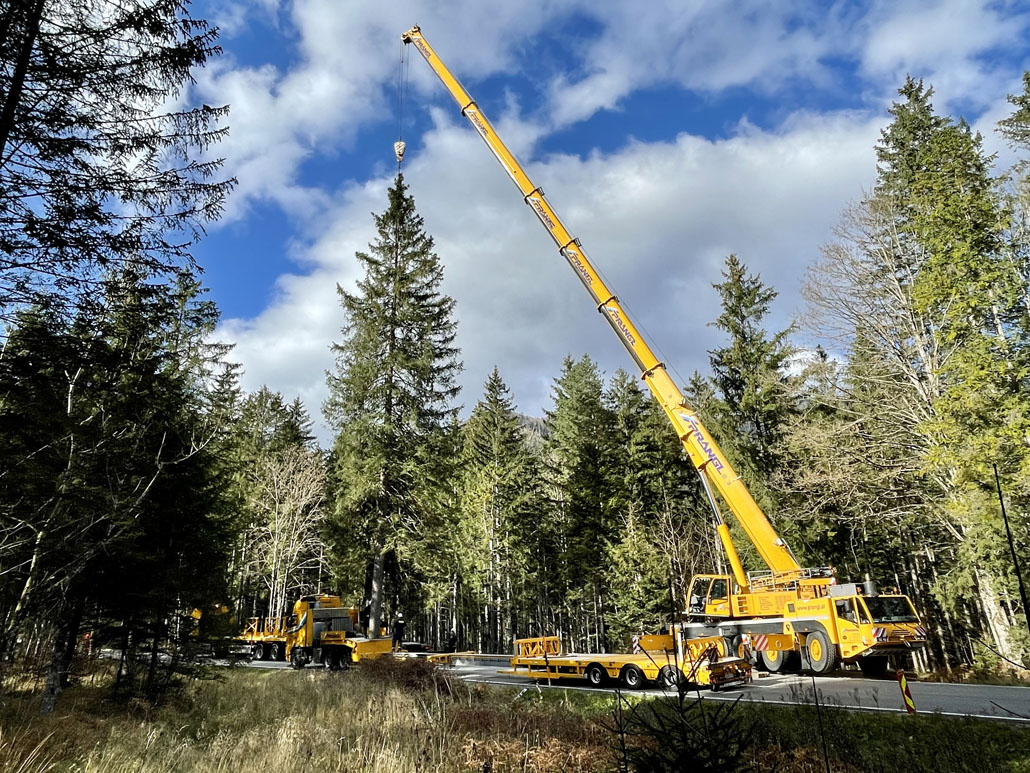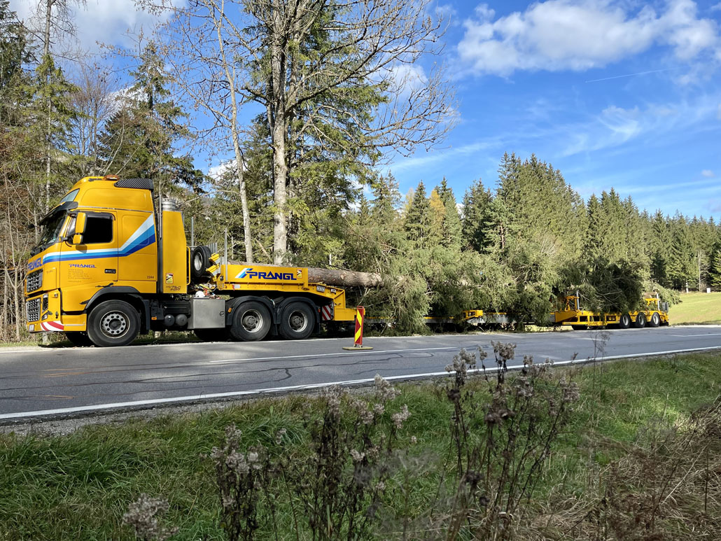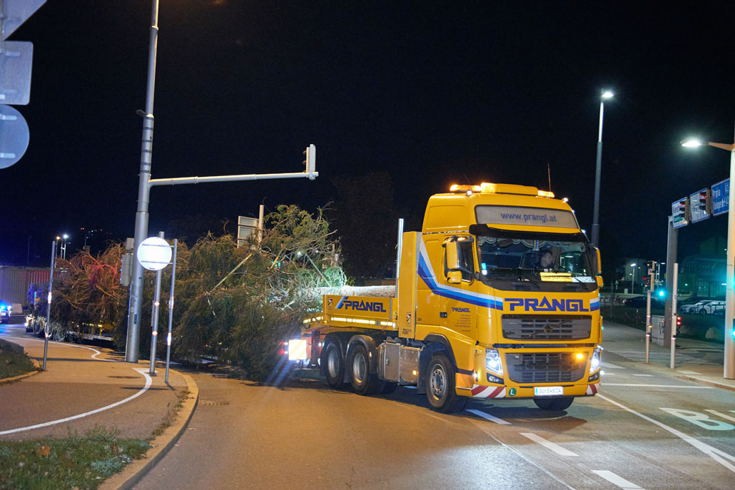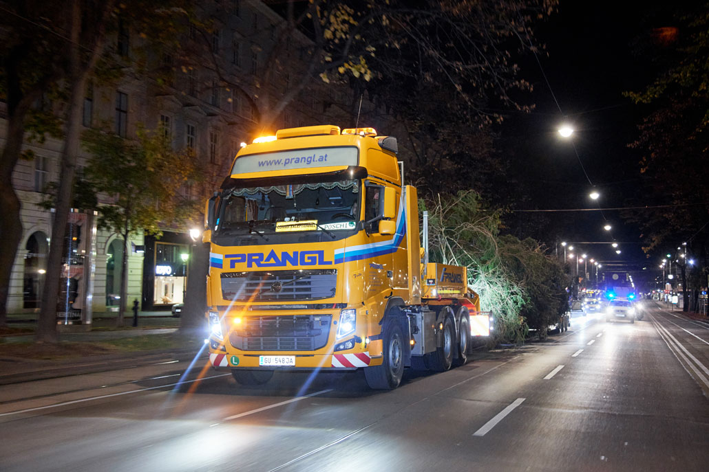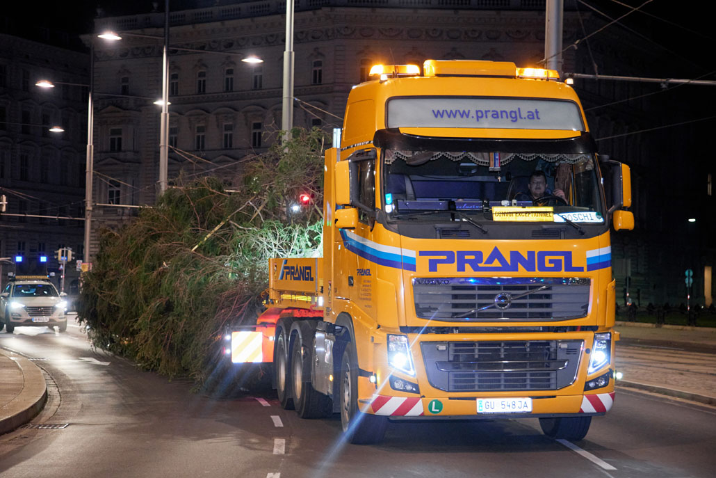 Közeledik a karácsony, így itt az ideje a bécsi Rathausplatzon felállítani a karácsonyfát. Idén egy körülbelül 130 éves fa érkezett Bécsbe Stájerországból, pontosabban a Steiermärkische Landesforste egyik buchaui (Admont és St. Gallen között fekvő) erdejéből. A 3,6 tonnás lucfenyőt egy 120 tonnás teleszkópgémes daruval és egy 78 tonnaméteres önrakodó daruval emelték ki, majd rakták fel a szállítójárműre. A szállításhoz a Prangl csapata egy 3 tengelyes vontatót választott, amelyet a fa 28 méteres hossza miatt egy 3 tengelyes dupla teleszkópos pótkocsival kombináltak.