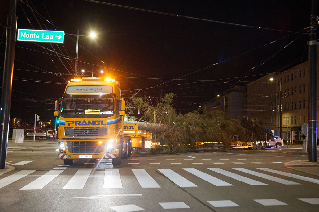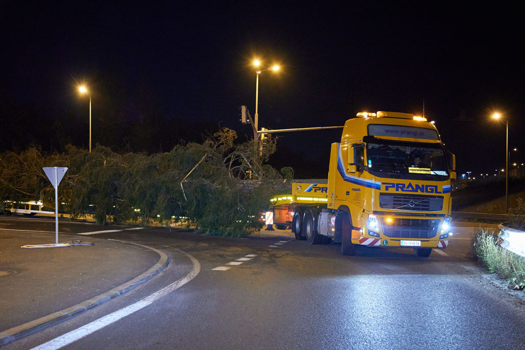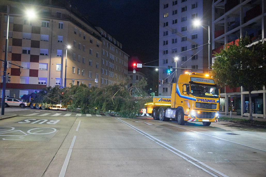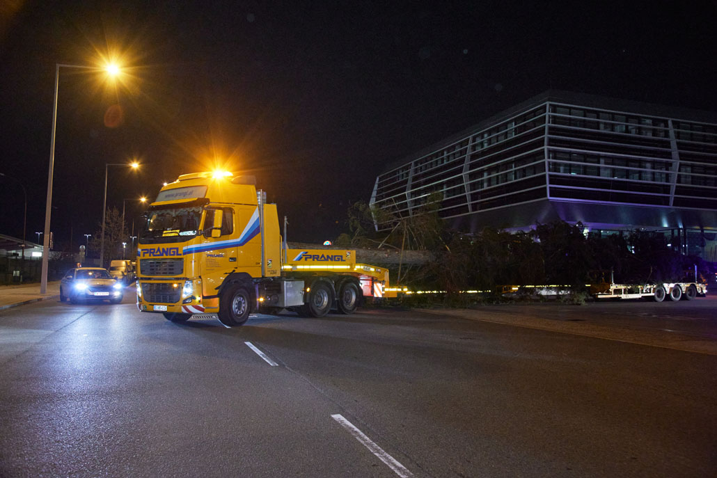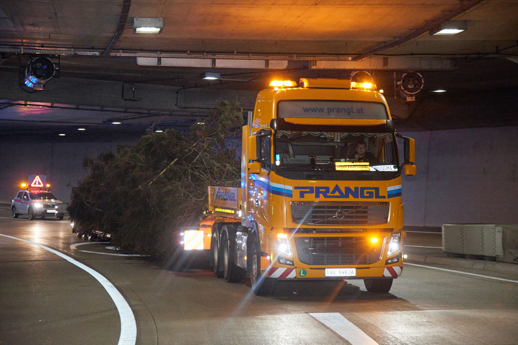 Közeledik a karácsony, így itt az ideje a bécsi Rathausplatzon felállítani a karácsonyfát. Idén egy körülbelül 130 éves fa érkezett Bécsbe Stájerországból, pontosabban a Steiermärkische Landesforste egyik buchaui (Admont és St. Gallen között fekvő) erdejéből. A 3,6 tonnás lucfenyőt egy 120 tonnás teleszkópgémes daruval és egy 78 tonnaméteres önrakodó daruval emelték ki, majd rakták fel a szállítójárműre. A szállításhoz a Prangl csapata egy 3 tengelyes vontatót választott, amelyet a fa 28 méteres hossza miatt egy 3 tengelyes dupla teleszkópos pótkocsival kombináltak.