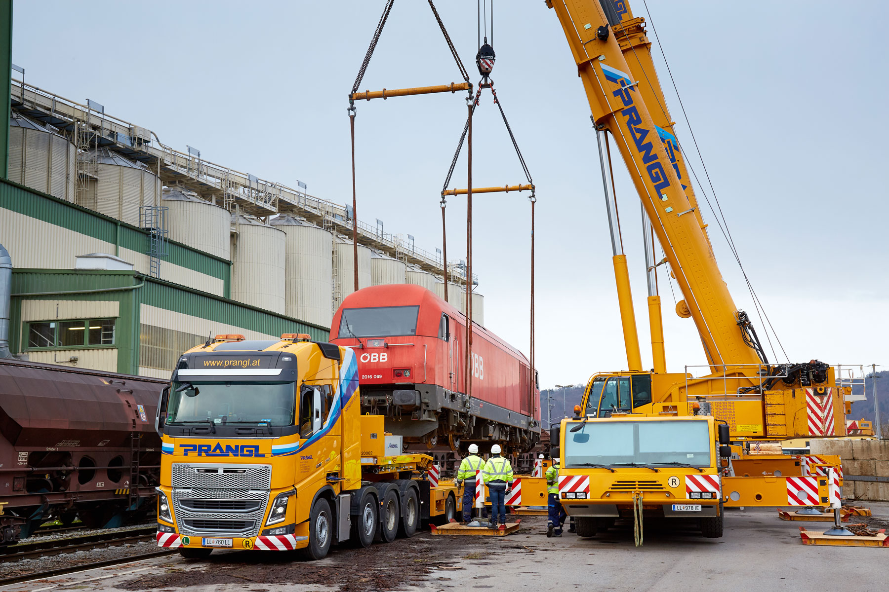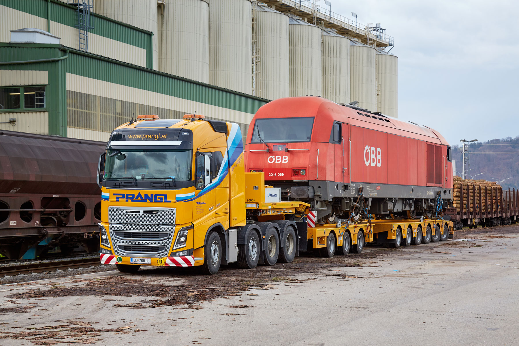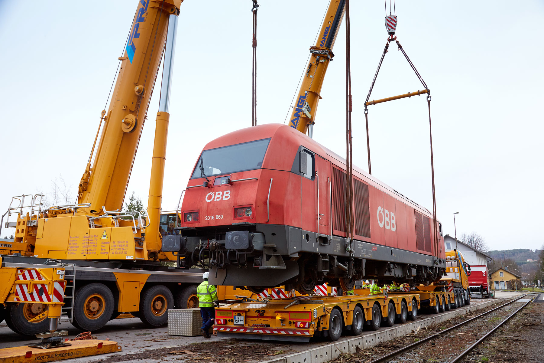 A 19,7 méter hosszú, 2,9 méter széles és 4,3 méter magas dízelmozdonyt egy 350 tonnás és egy 160 tonnás teleszkópos daru tandememeléssel rakta fel. Az ilyen manővereknél elengedhetetlen, hogy a darukezelők tökéletes összhangban legyenek egymással. A gyakorlott Prangl-csapat ebben a tekintetben is kiemelkedő munkát végzett. A vasúti monstrumot végül egy négytengelyes, nagy vonóerejű tehergépjárművel és egy kilenctengelyes mélybölcsős pótkocsival szállították. Ezáltal a szállítmány 28,5 méter hosszú és 5,5 méter széles volt. A teljes szerelvény 133,2 tonnát nyomott.