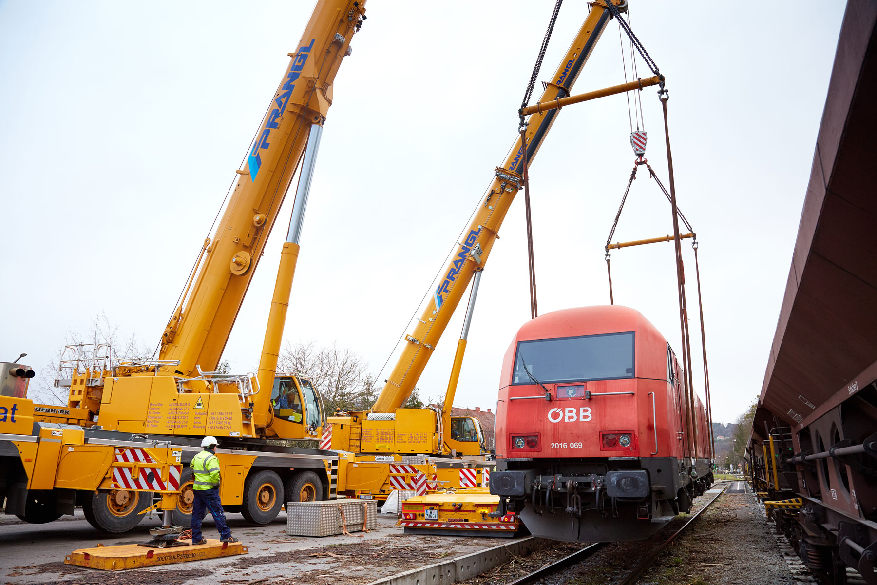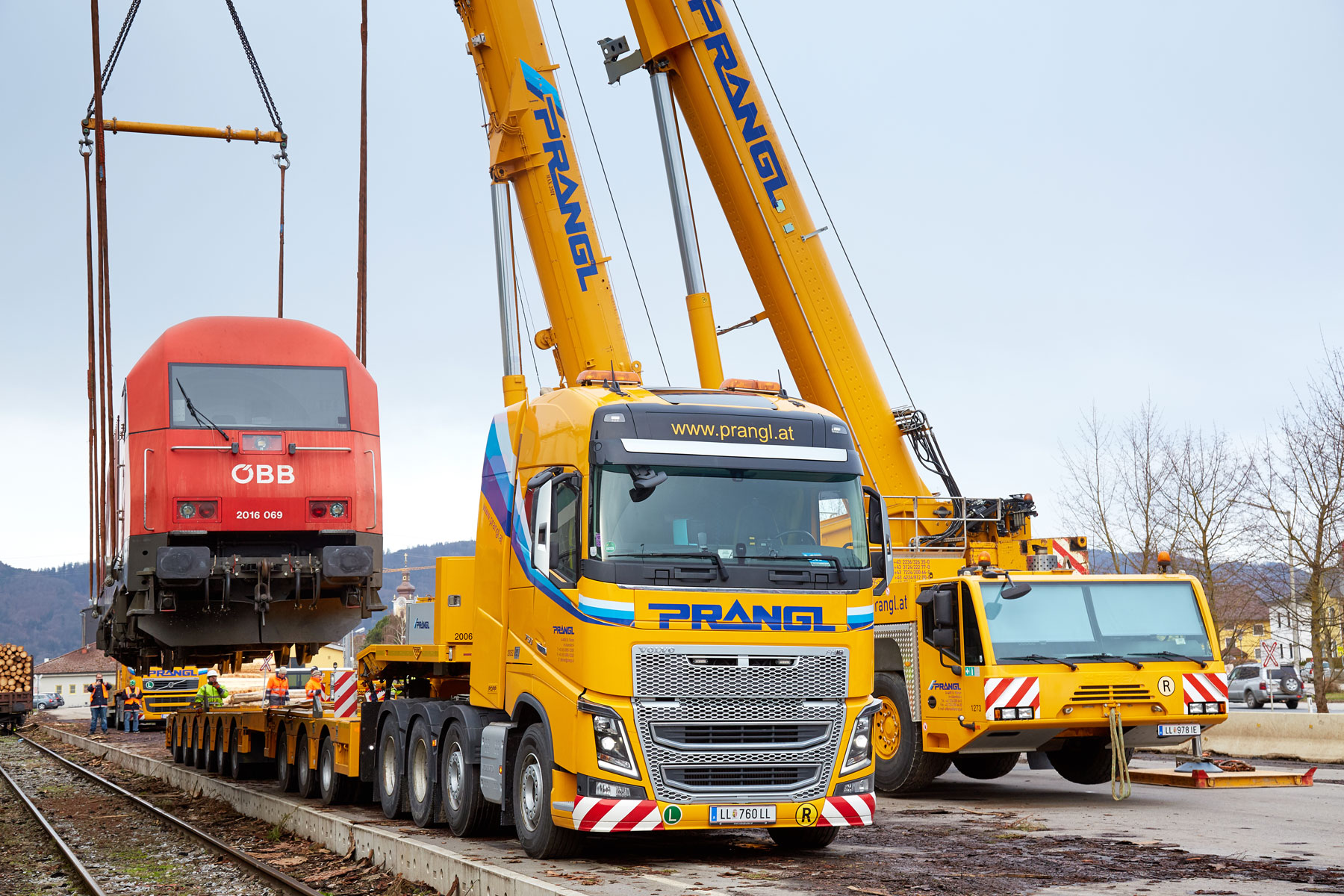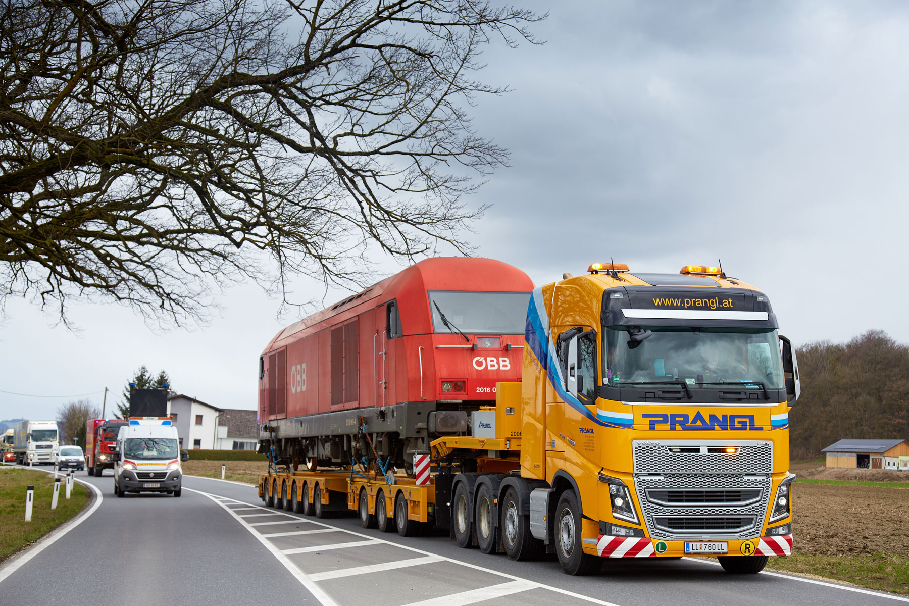 A 19,7 méter hosszú, 2,9 méter széles és 4,3 méter magas dízelmozdonyt egy 350 tonnás és egy 160 tonnás teleszkópos daru tandememeléssel rakta fel. Az ilyen manővereknél elengedhetetlen, hogy a darukezelők tökéletes összhangban legyenek egymással. A gyakorlott Prangl-csapat ebben a tekintetben is kiemelkedő munkát végzett. A vasúti monstrumot végül egy négytengelyes, nagy vonóerejű tehergépjárművel és egy kilenctengelyes mélybölcsős pótkocsival szállították. Ezáltal a szállítmány 28,5 méter hosszú és 5,5 méter széles volt. A teljes szerelvény 133,2 tonnát nyomott.