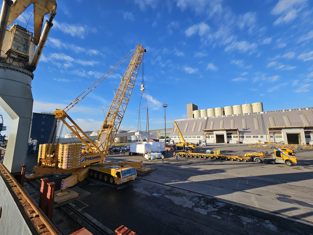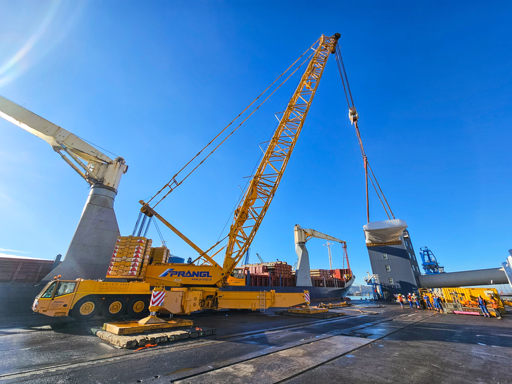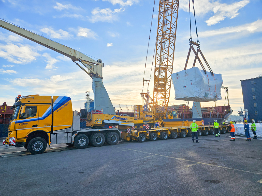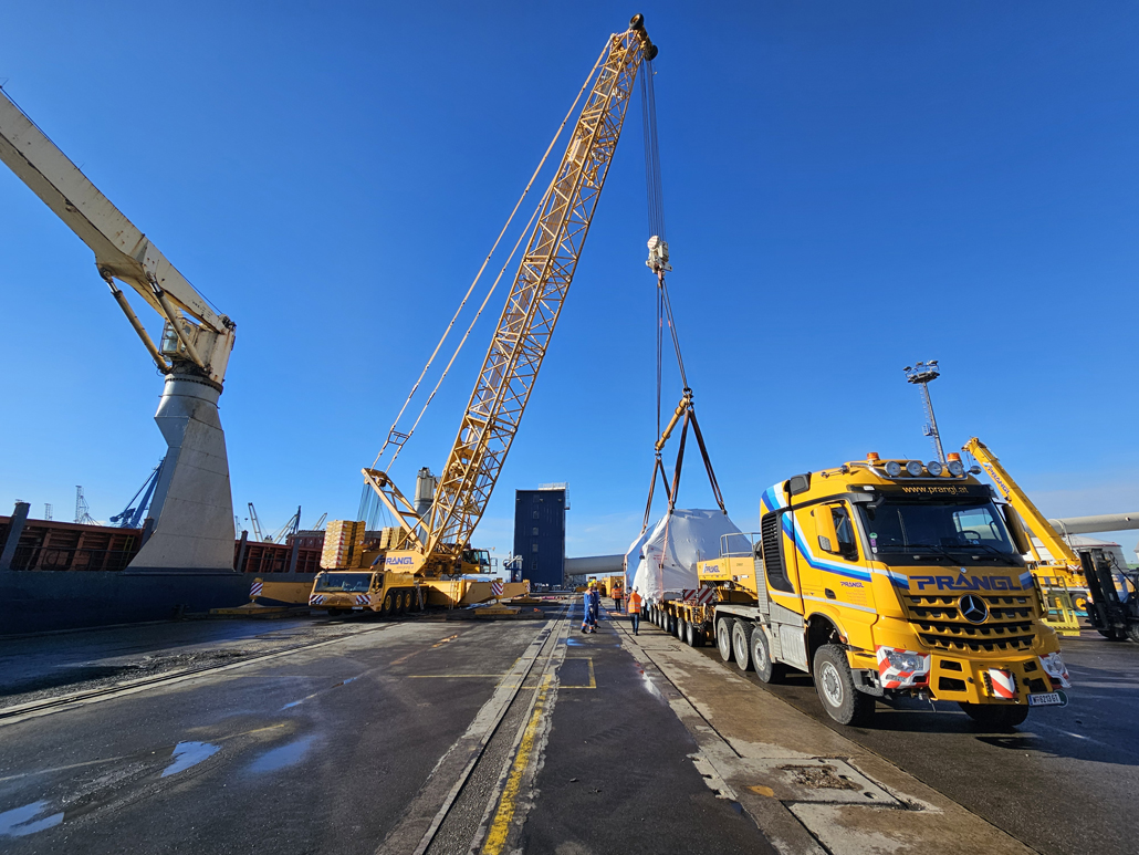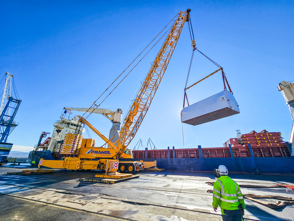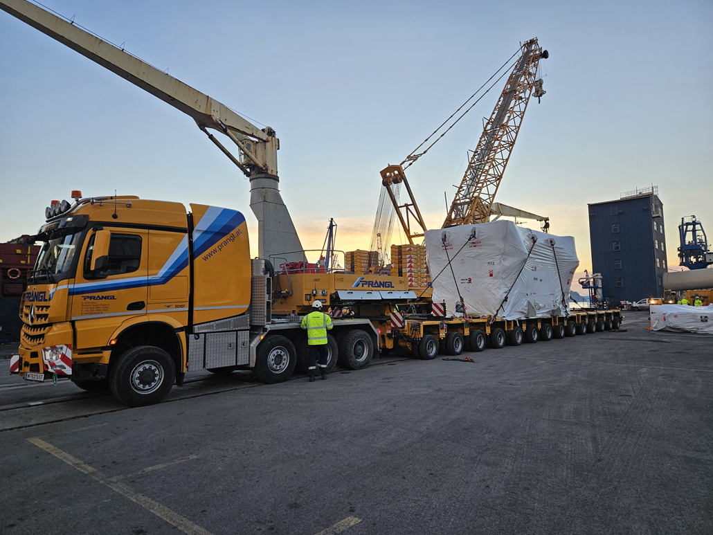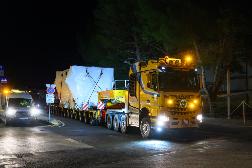 A 600 tonnás rácsos gémes darut a bécsi Prangl központból szálították Koper kikötőjébe. A présgép összesen kilenc alkatrészét kellett kirakodni a hajóból. Az egyes alkatrészek tömege 50 és 155 tonna között volt. A legnagyobb alkatrész 9,90 x 4,97 x 3,75 méteres, a legkisebb 5,20 x 2,00 x 3,50 méteres volt. A Prangl csapat és a rácsosgémű daru tökéletes munkát végzett. Az alkatrészeket fokozatosan a várakozó teherautókra rakodták, a legnehezebb, 155, 151 és 138 tonnás alkatrészeket a 4 tengelyes vontató által húzott 14 tengelyes nagy teherbírású kombinációkra.
